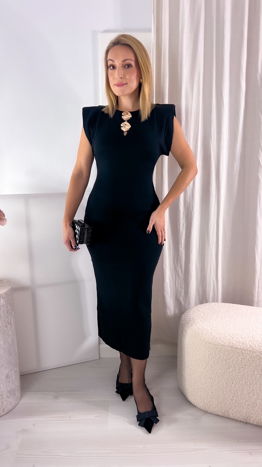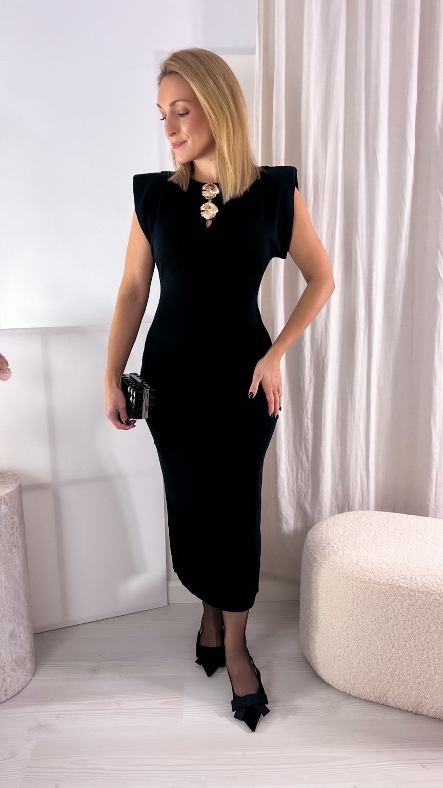 Dzięki dopasowanemu krojowi sukienka pięknie podkreśla kobiece kształty, a mocno zaakcentowane ramiona dodają jej nowoczesnego, wyrazistego stylu. To efektowny model, idealny na wieczorne wyjścia, przyjęcia i wyjątkowe okazje.
