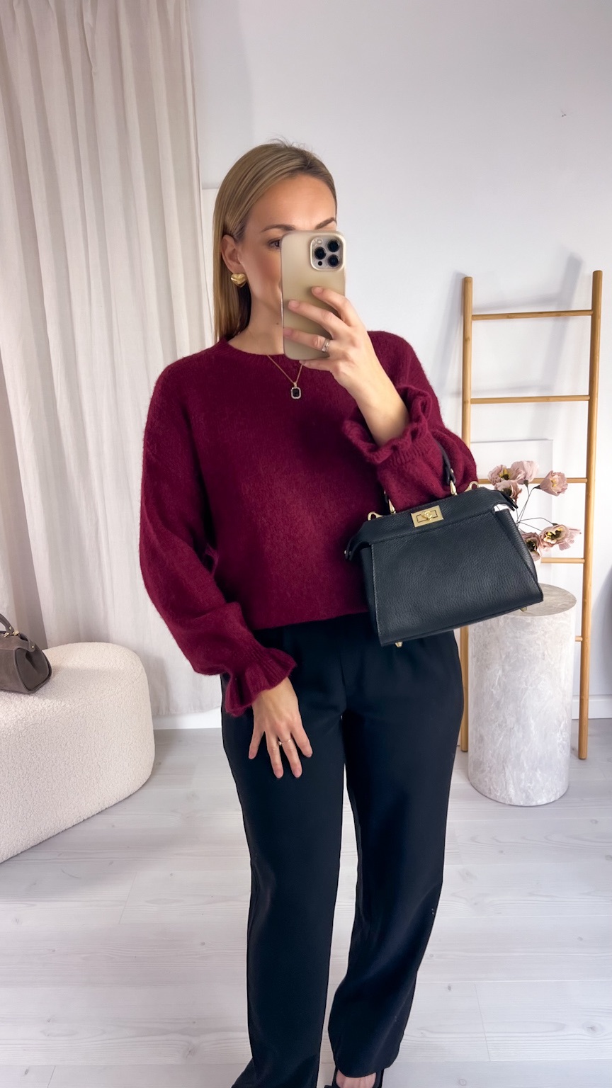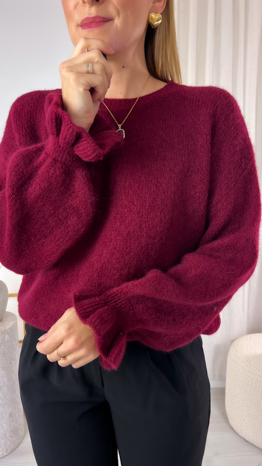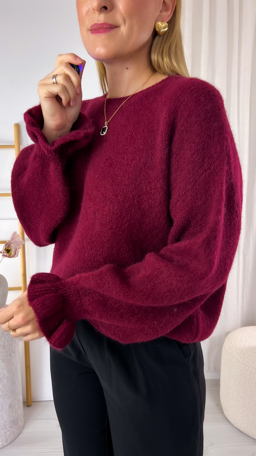 🧶 Sweter z baby alpaką w składzie z falbanką przy rękawach 🧶 bordo