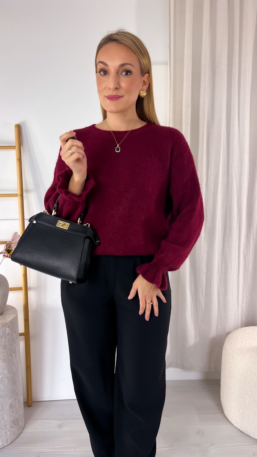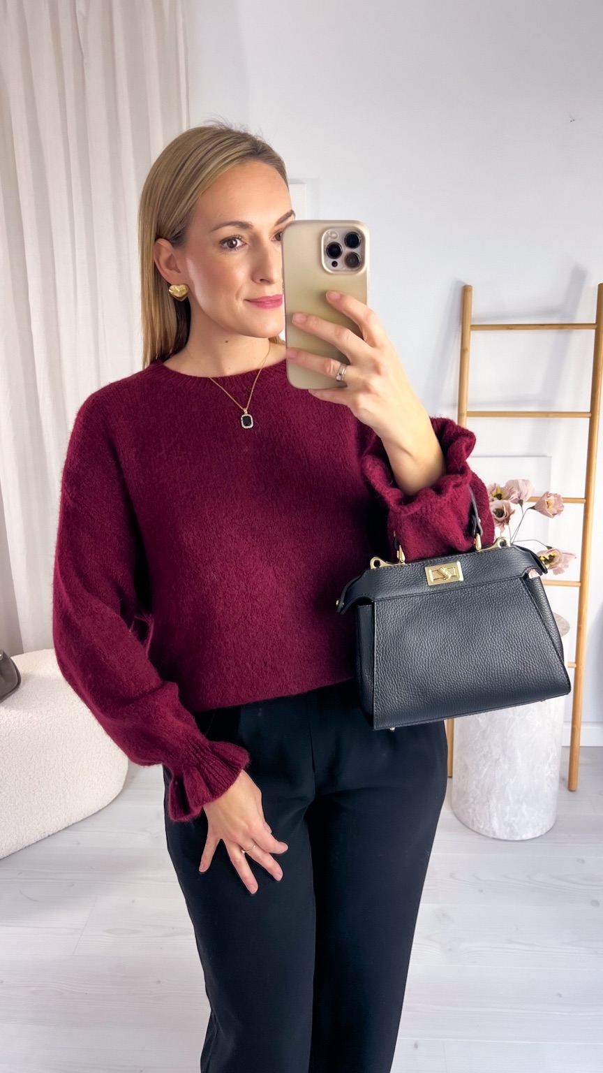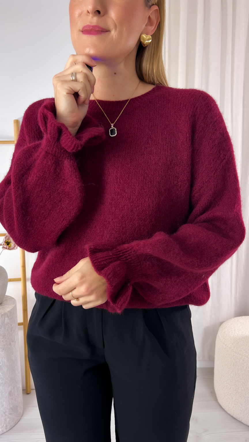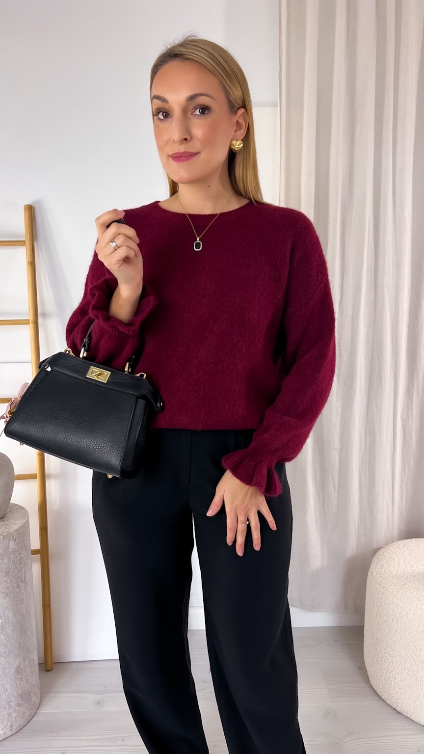 🧶 Sweter z baby alpaką w składzie z falbanką przy rękawach 🧶 bordo
