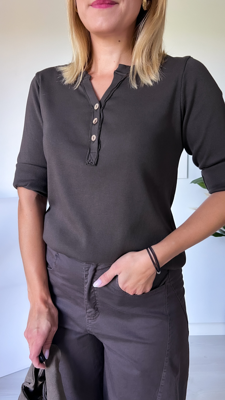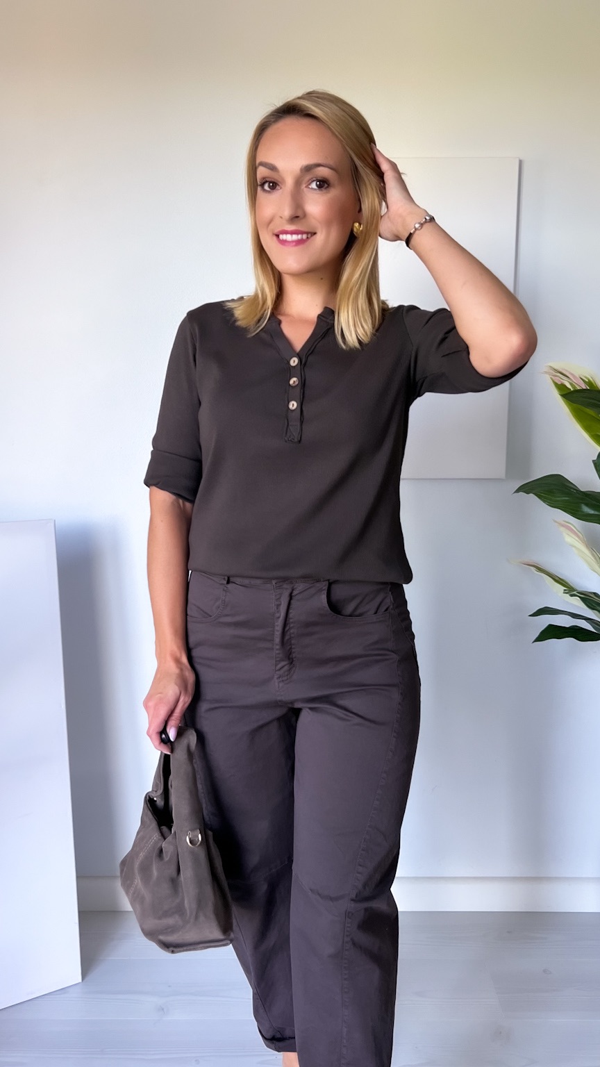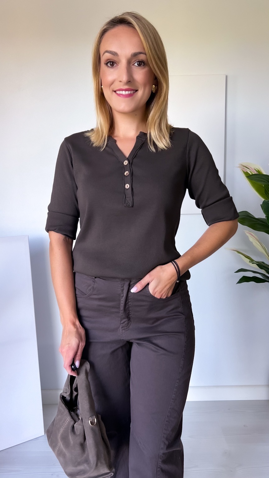 Ta bluzka to kwintesencja komfortu i stylu na co dzień. Uszyta z wysokiej jakości bawełny o delikatnej, prążkowanej fakturze, gwarantuje miękkość i przewiewność, dzięki czemu doskonale sprawdzi się przez cały dzień.