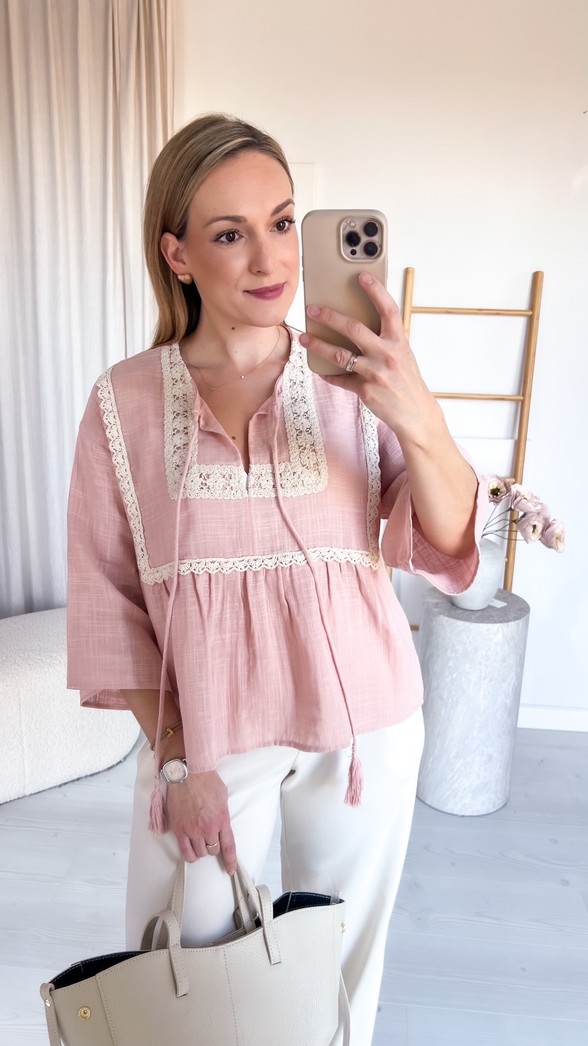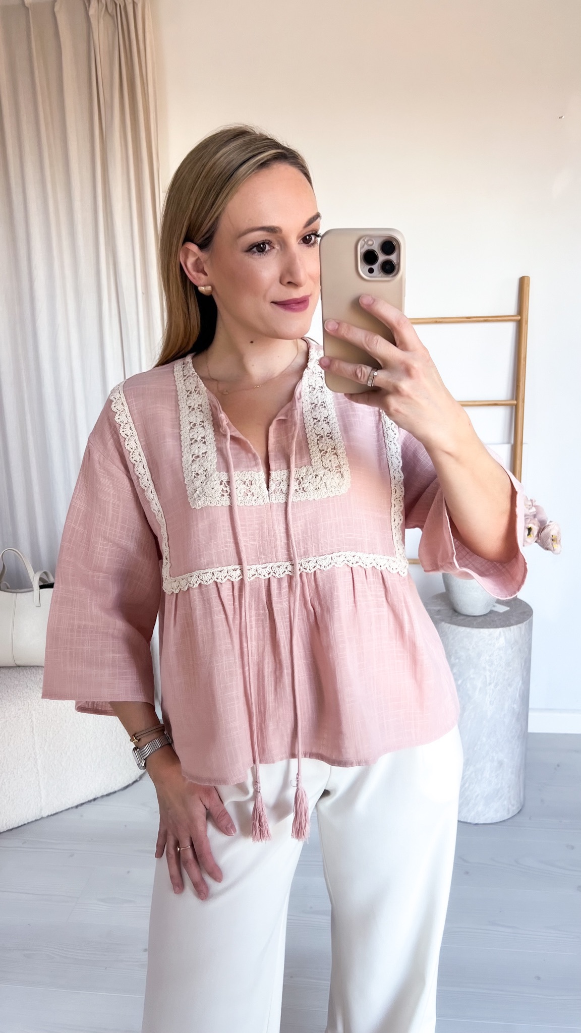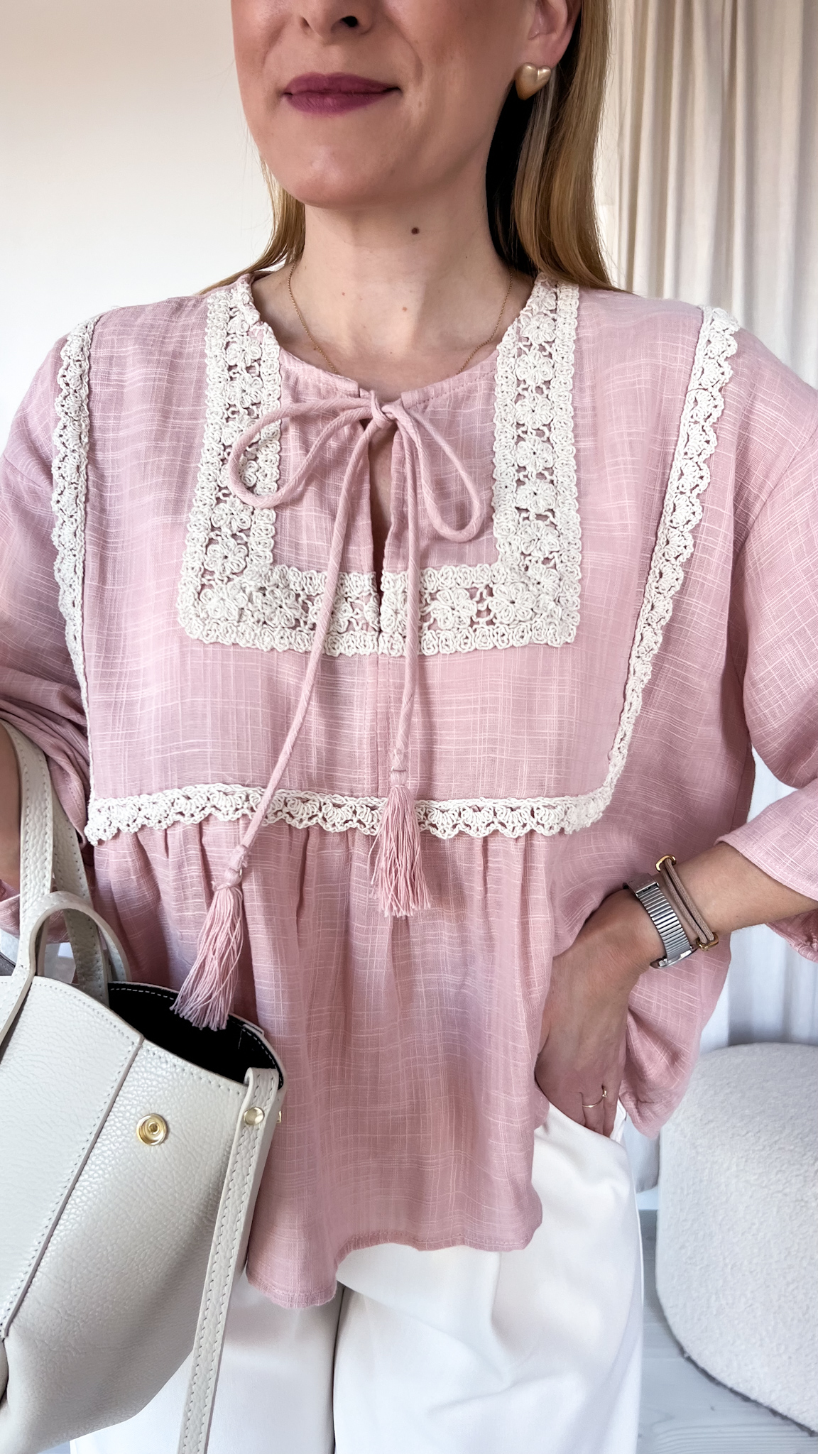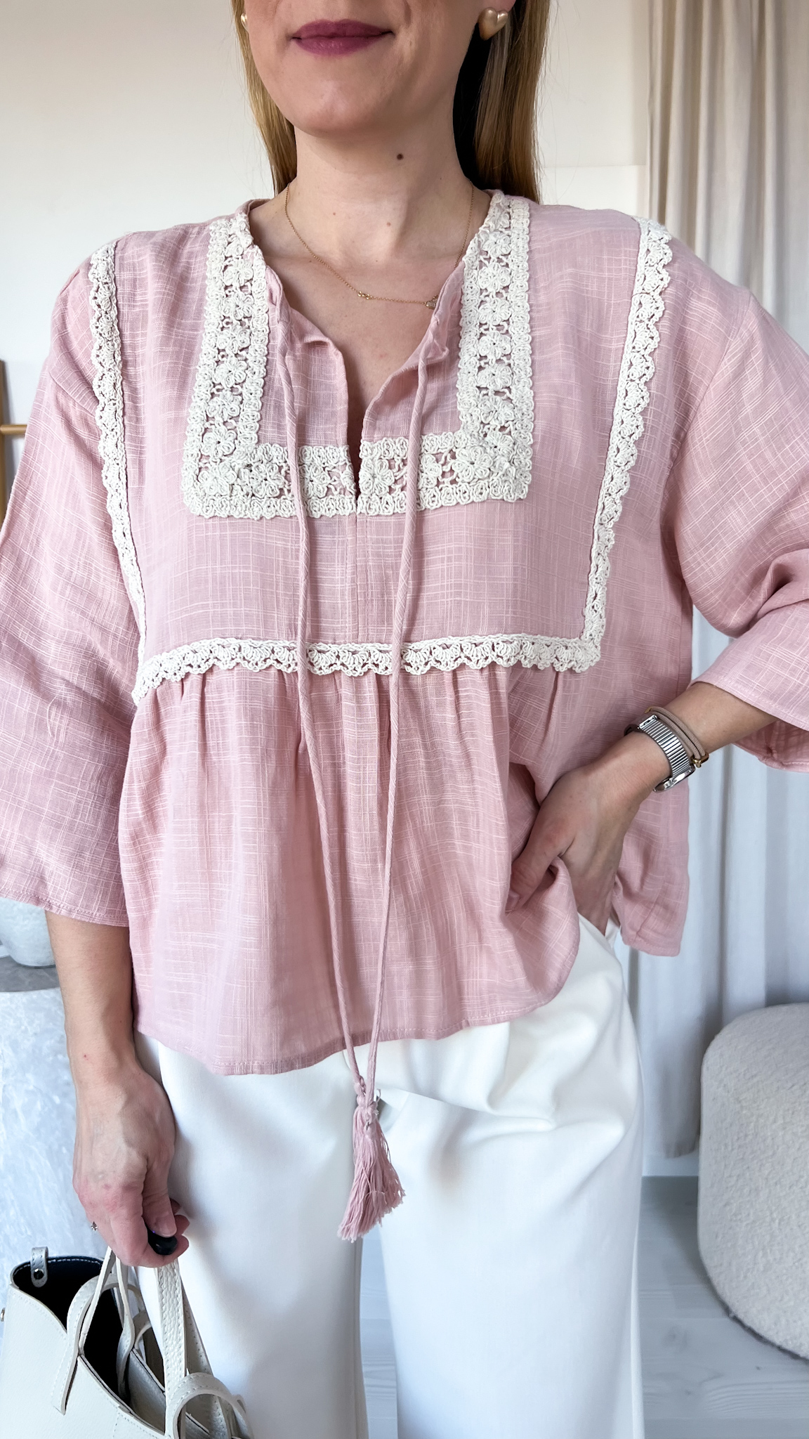 Model wiązany pod szyją dodaje całości delikatności i kobiecego uroku, pozwalając na regulację oraz dopasowanie do własnego stylu. Bluzka została ozdobiona haftowaną, bawełnianą lamówką, która podkreśla jej rękodzielniczy charakter i nadaje wyjątkowego, boho klimatu.