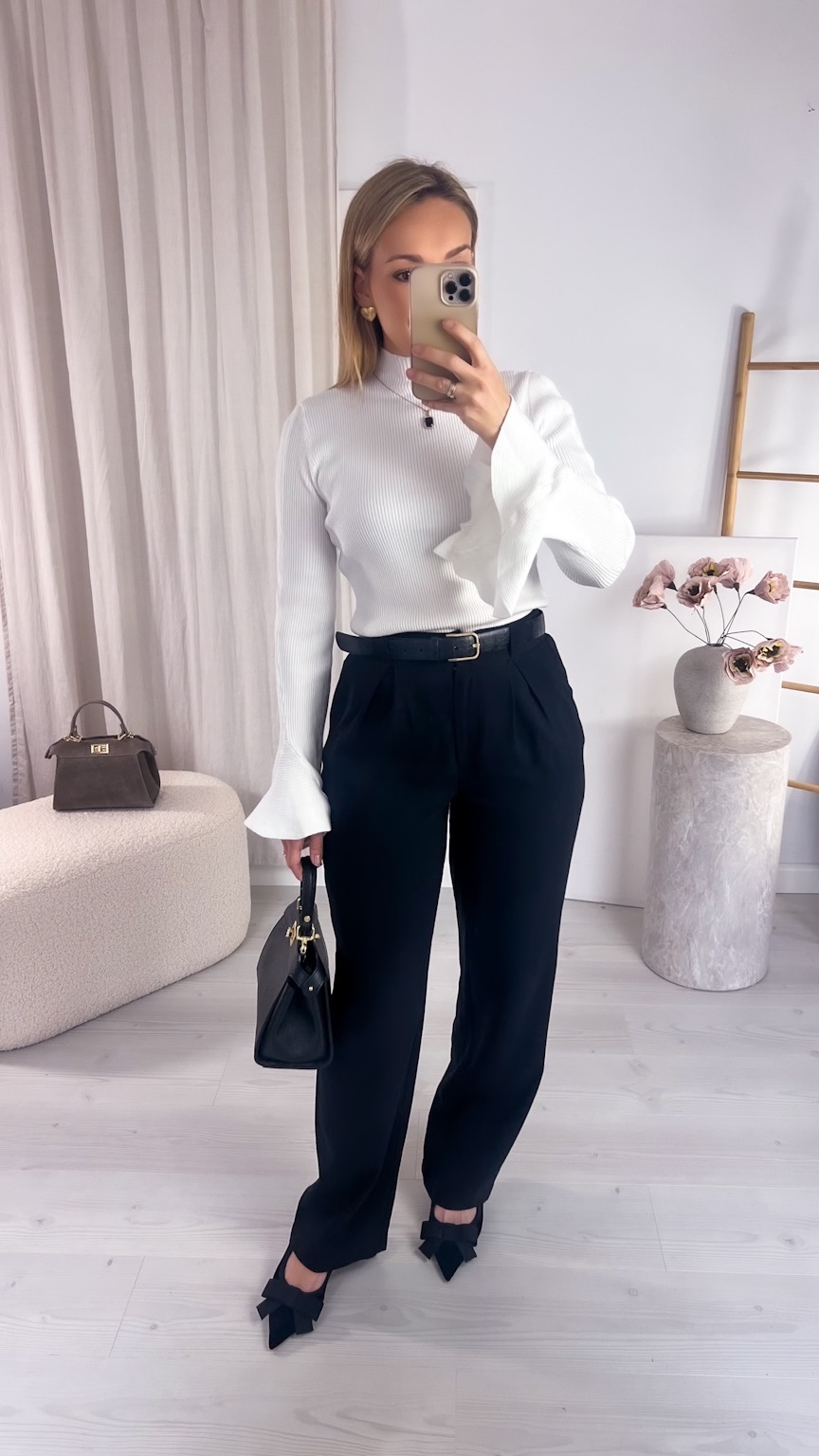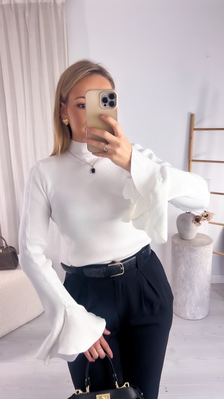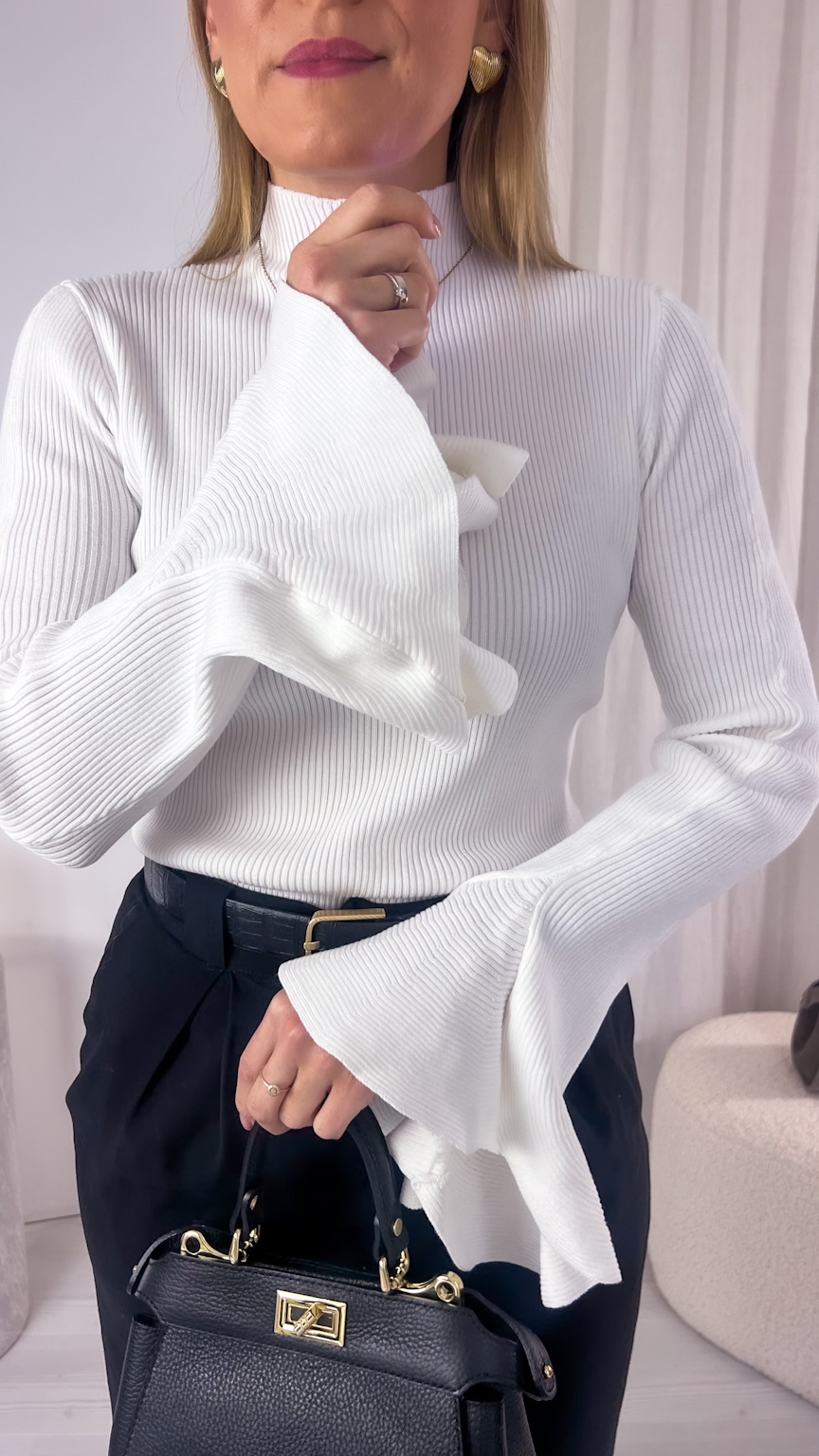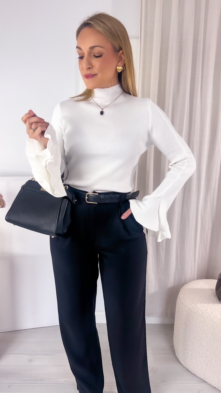 Szczególną uwagę przyciągają pięknie rozkloszowane rękawy, które dodają całości lekkości, wyjątkowego charakteru i delikatnie romantycznego akcentu. Półgolf subtelnie wysmukla szyję, nadając bluzce elegancki, ponadczasowy wygląd.