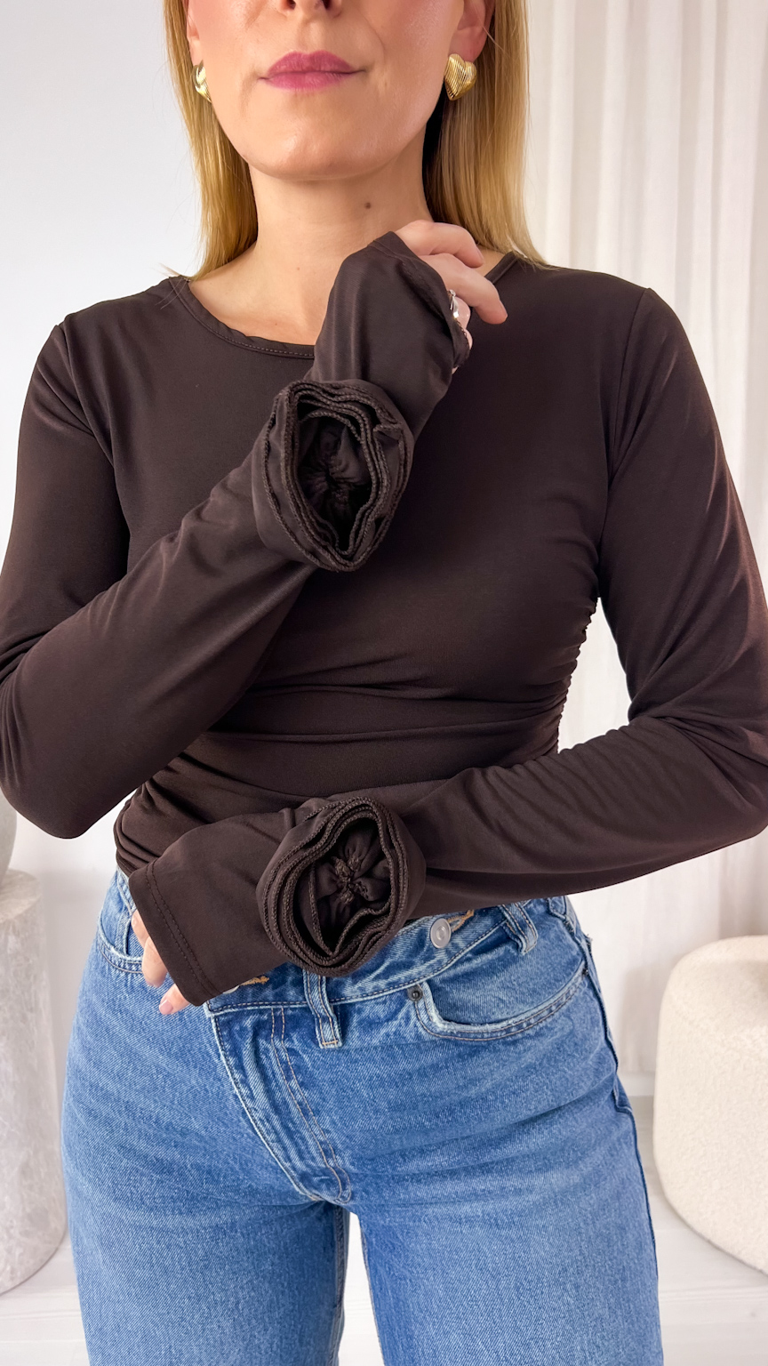 Największą ozdobą bluzki jest duży, dekoracyjny kwiat umieszczony na rękawie — przyciąga wzrok i dodaje całości wyrafinowanego, artystycznego charakteru. To element, który sprawia, że bluzka staje się prawdziwą ozdobą stylizacji.