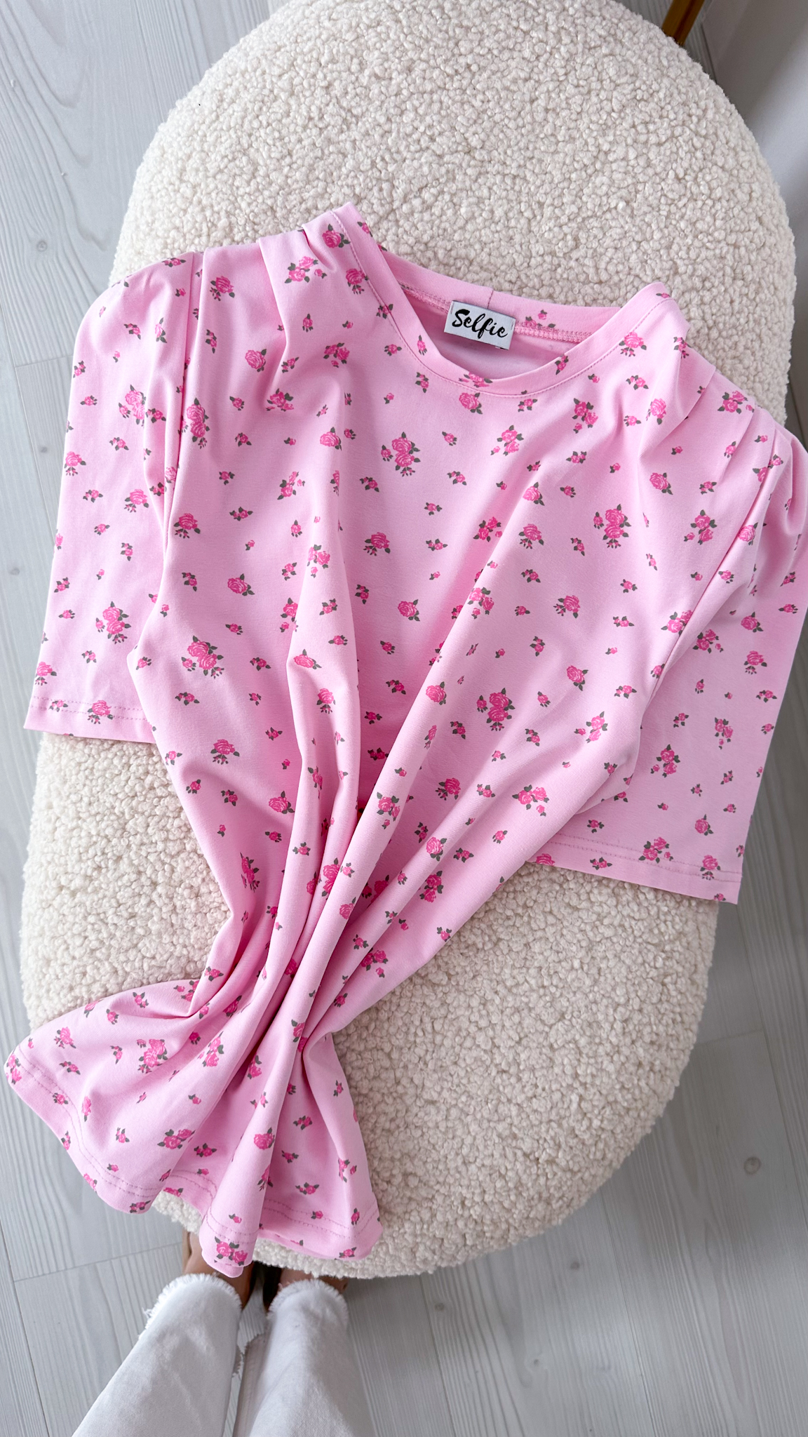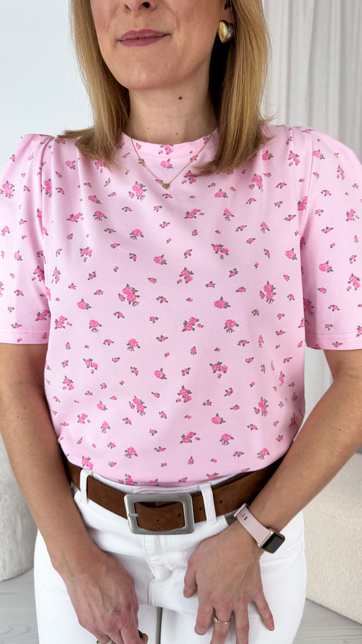 Bluzka z poduszkami i drapowaniem – pudrowe kwiatuszki