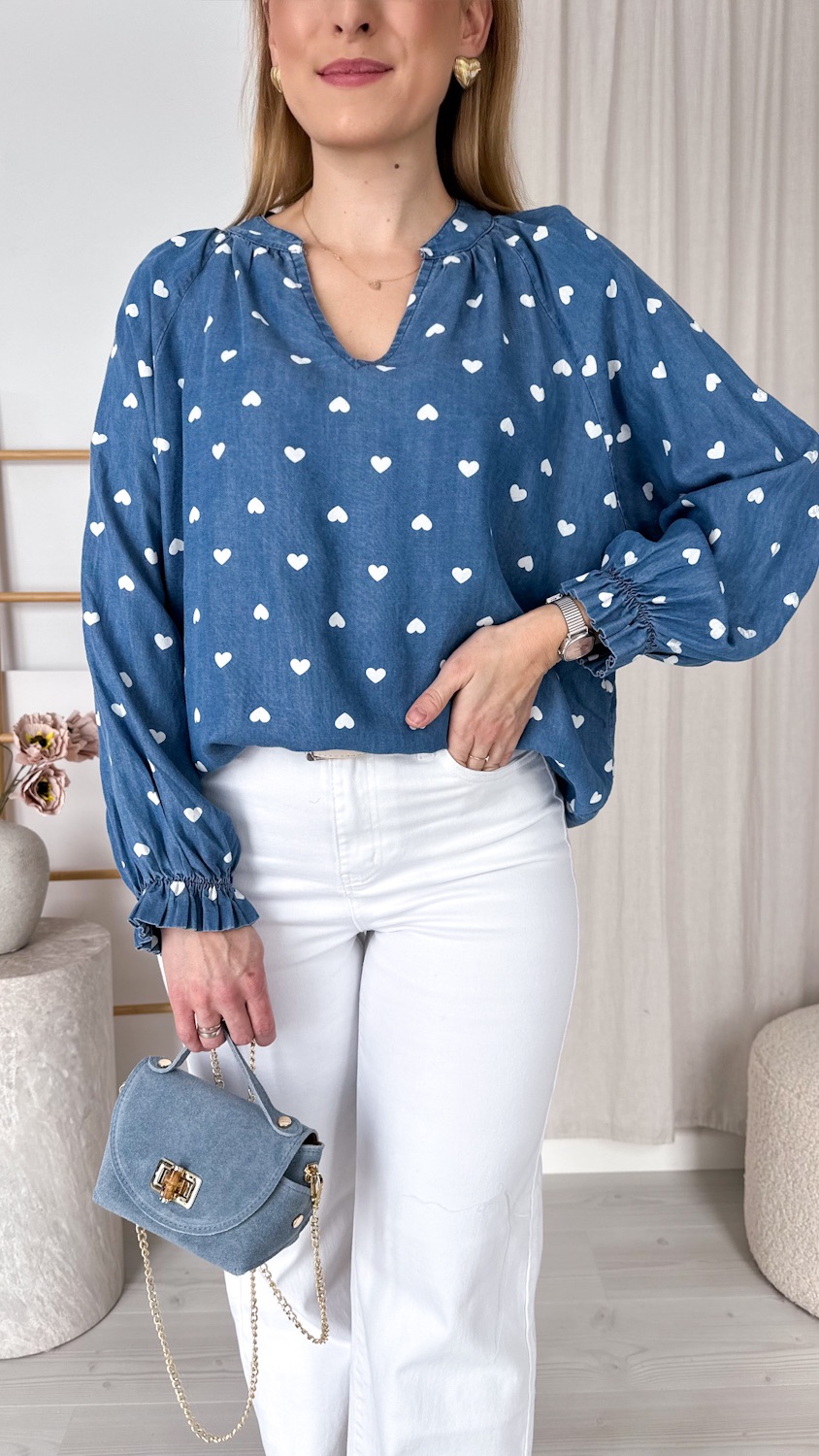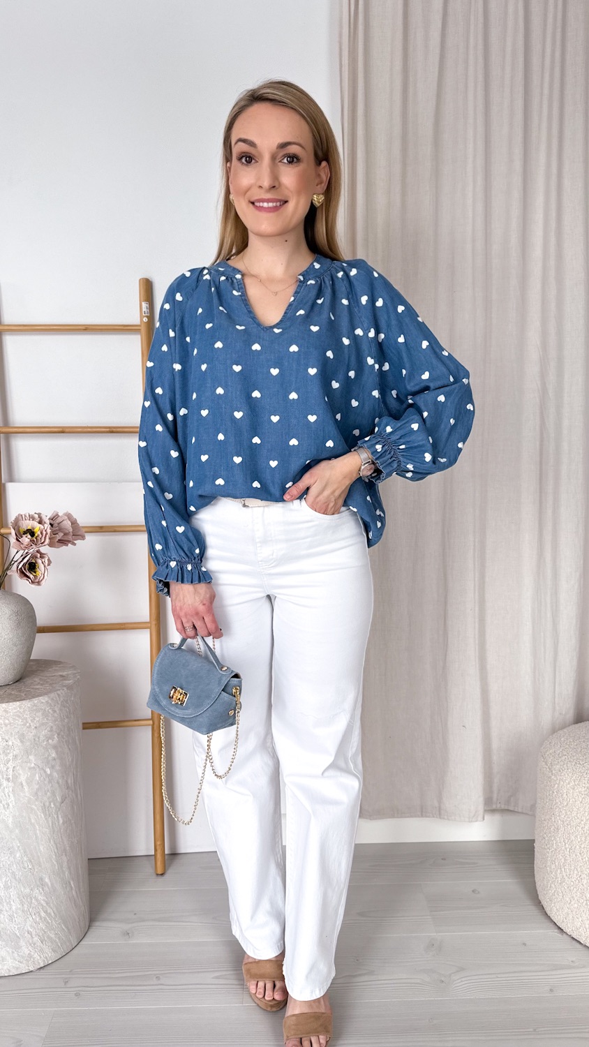 Delikatny wzór w białe serduszka dodaje lekkości i romantycznego charakteru, dzięki czemu bluzka wyróżnia się na tle klasycznych jeansowych modeli. To idealna propozycja dla kobiet, które lubią modne, ale jednocześnie ponadczasowe elementy garderoby.