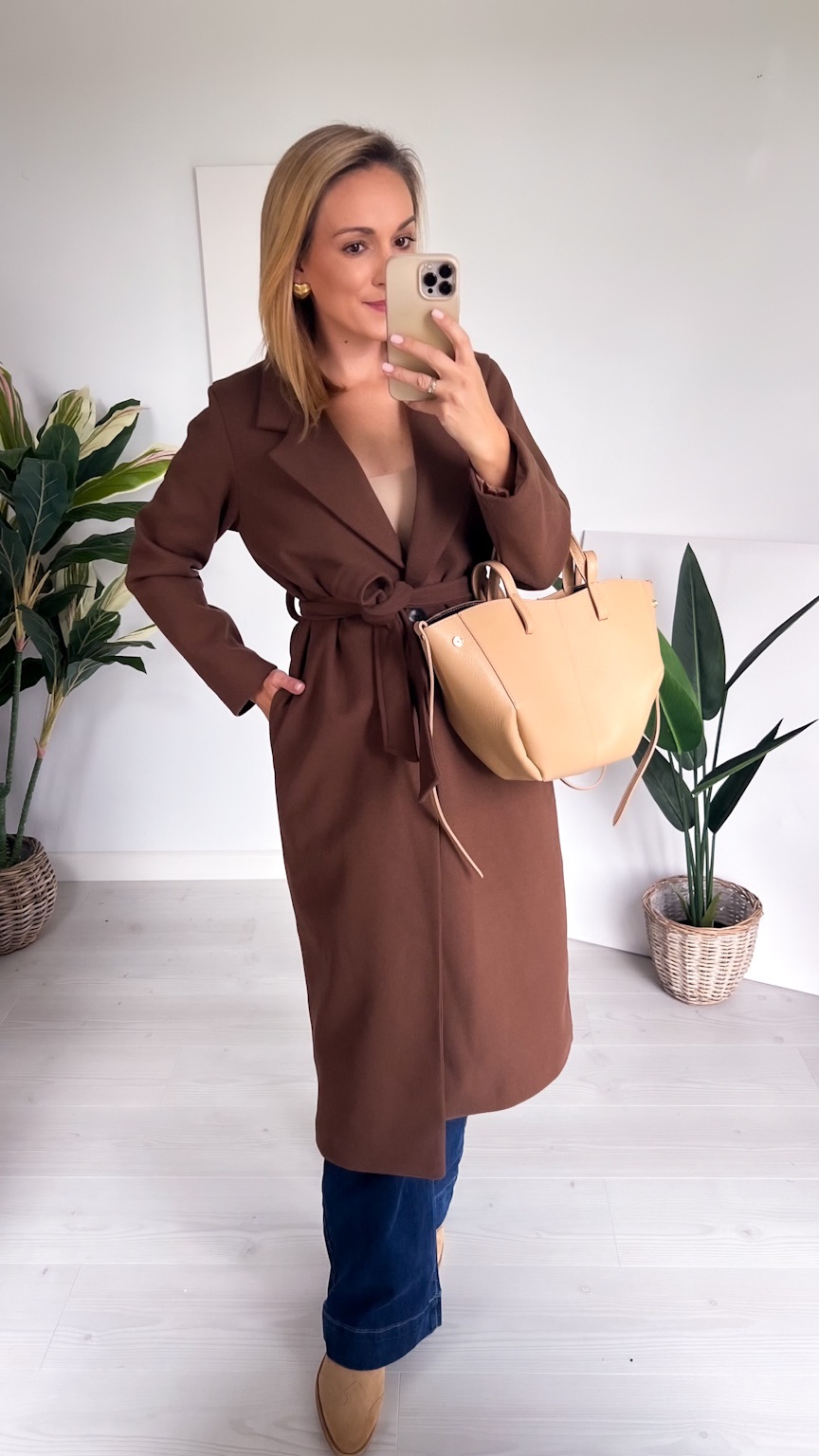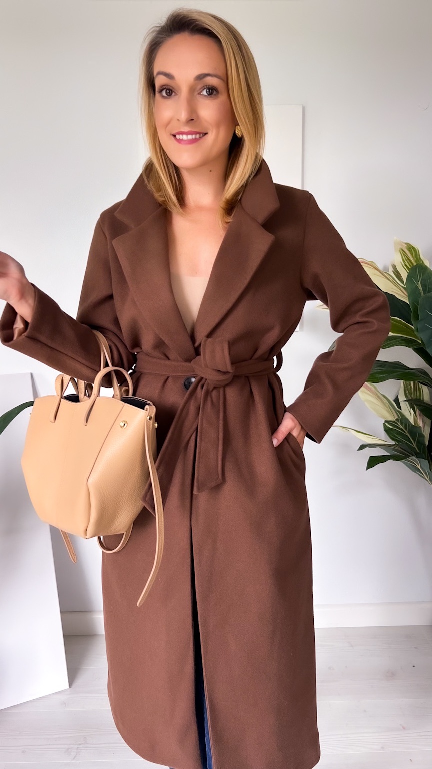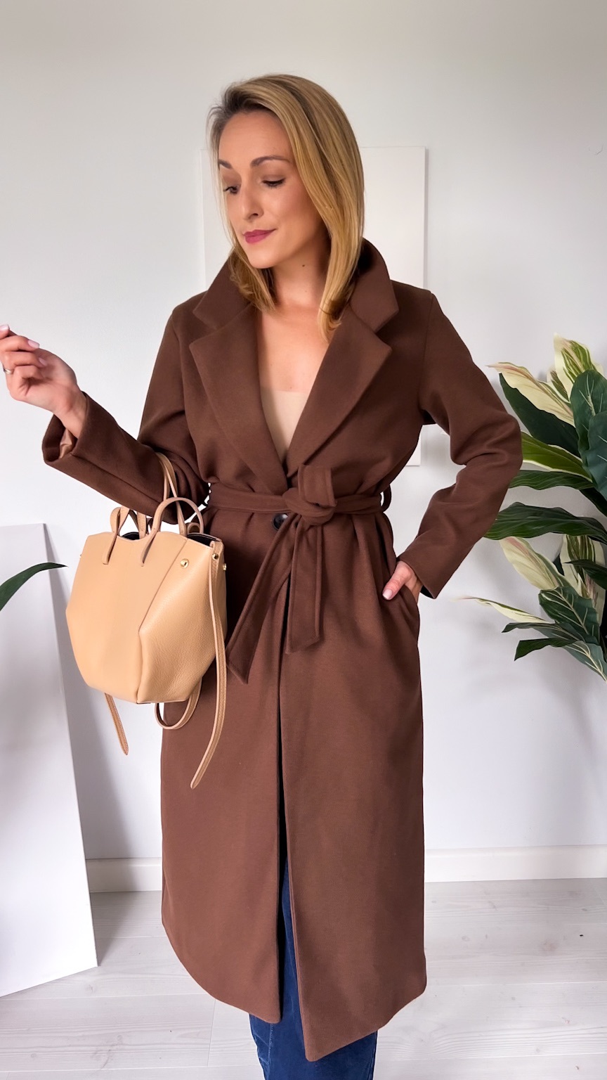 Jesienny czekoladowy płaszcz – elegancja w ciepłym odcieniu