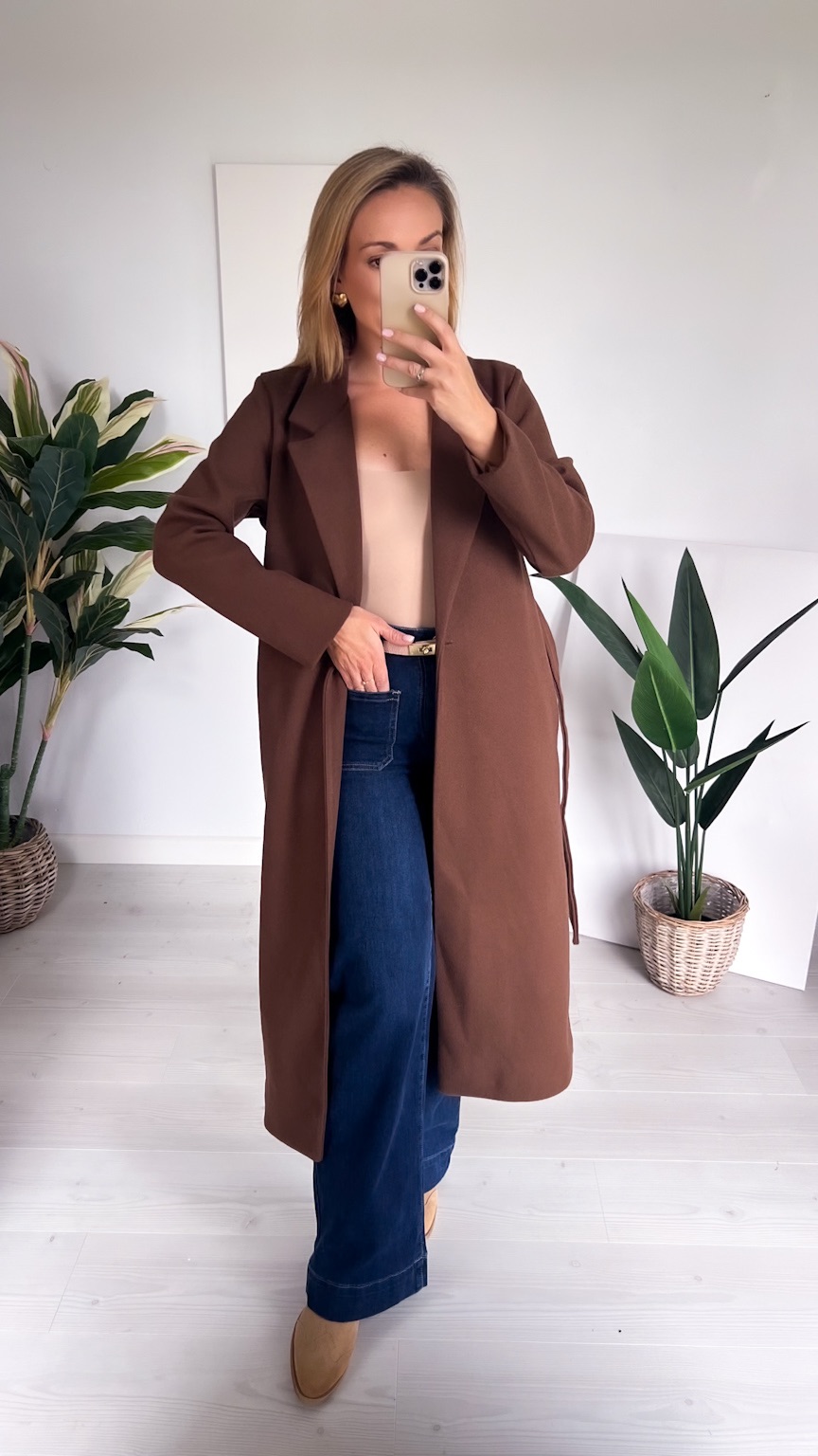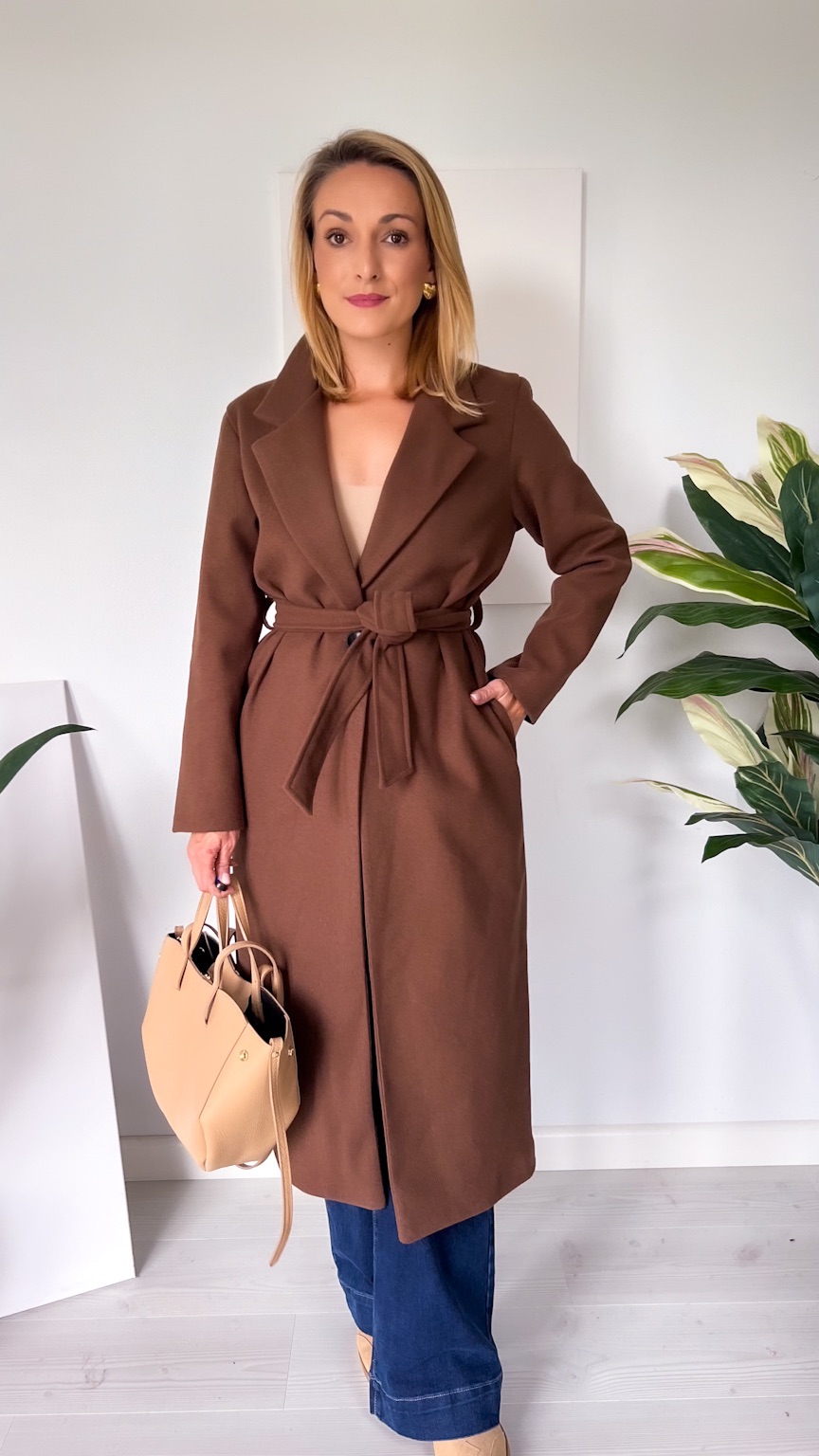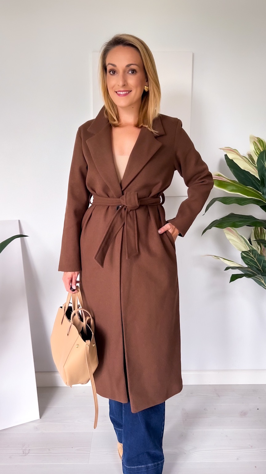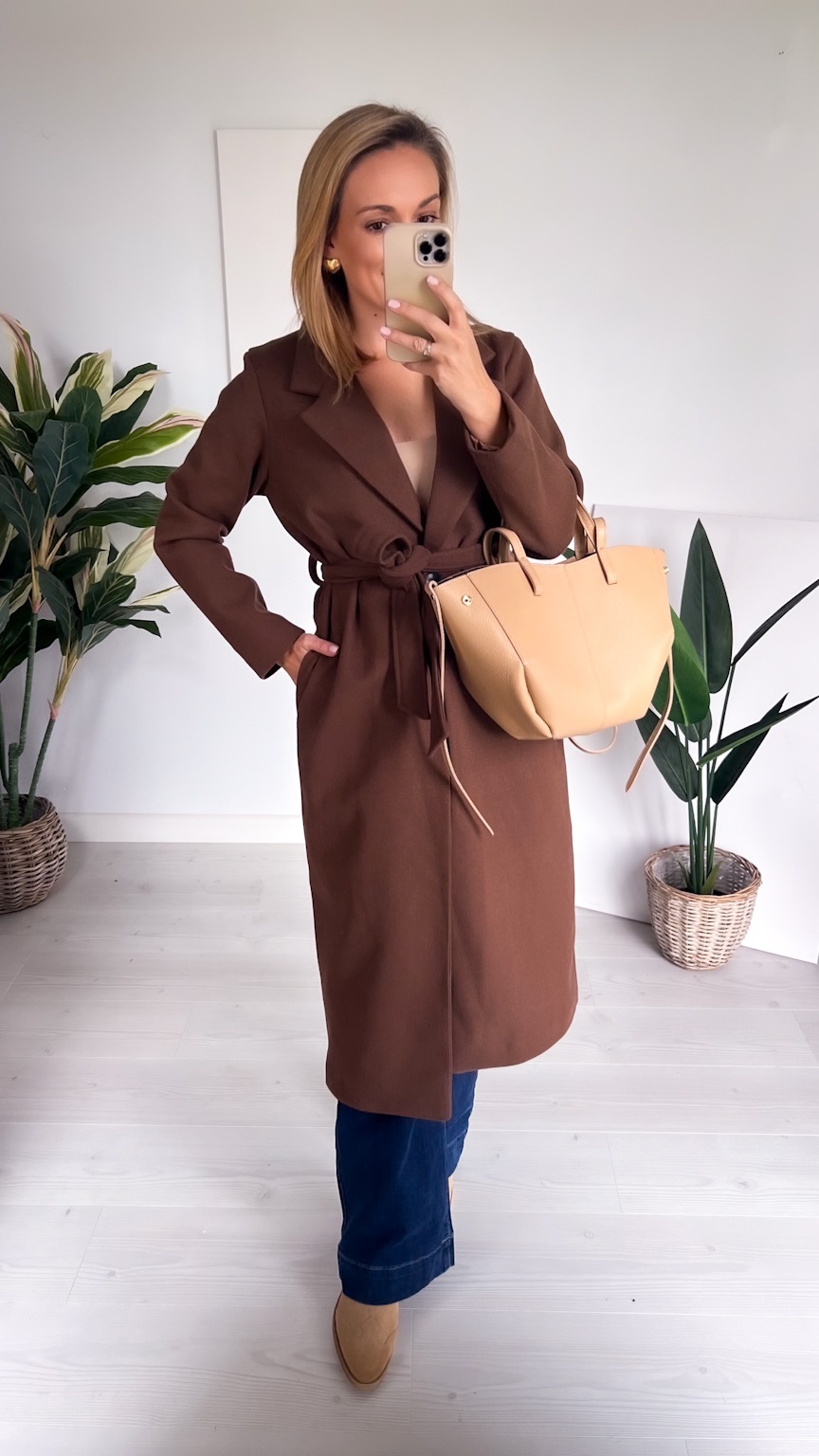 Jesienny czekoladowy płaszcz – elegancja w ciepłym odcieniu