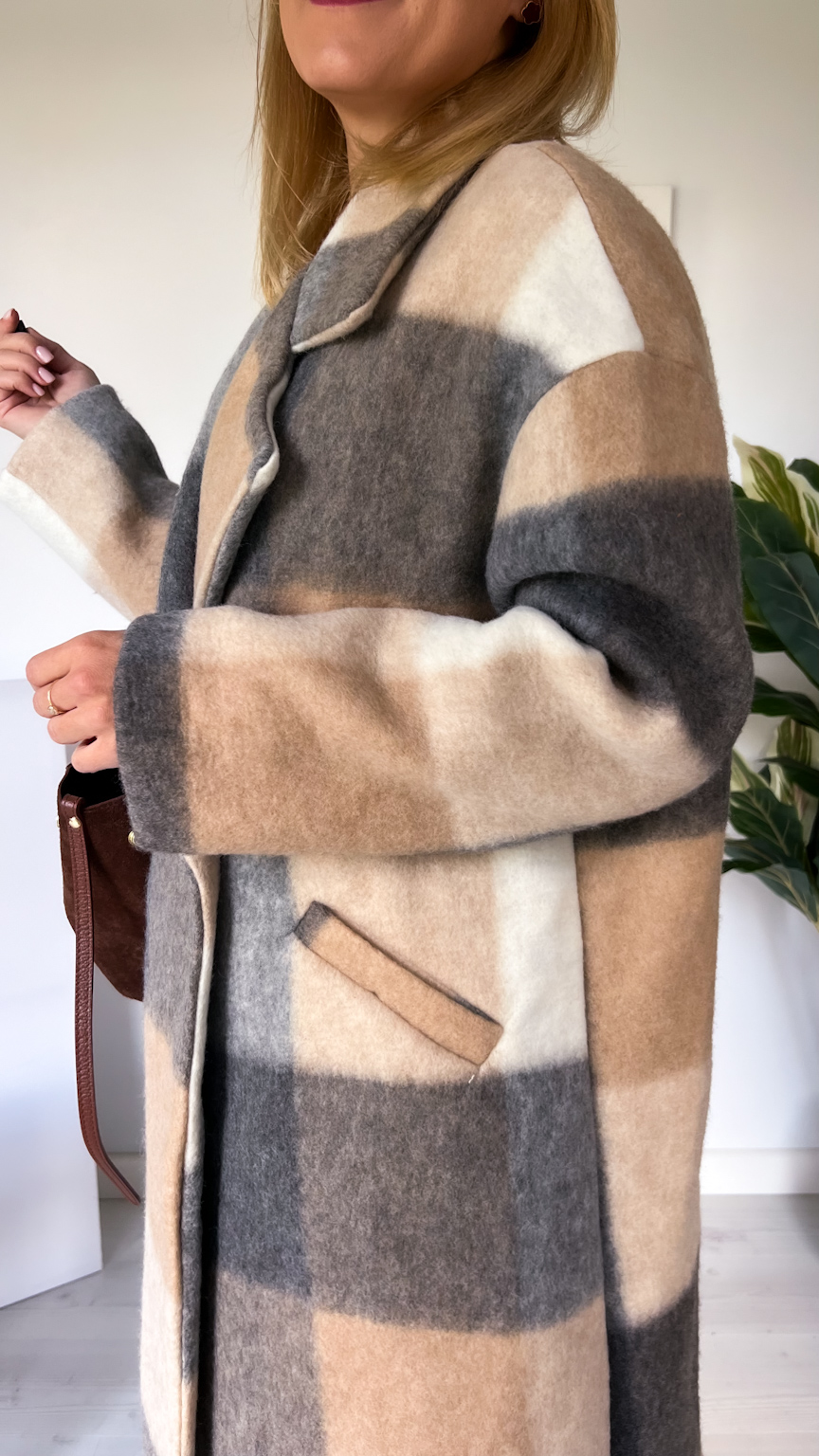 Postaw na ponadczasową elegancję i ciepło w chłodniejsze dni. Ten długi płaszcz wykonany z wysokiej jakości wełny to idealne połączenie stylu i funkcjonalności. Klasyczny wzór w kratę dodaje mu charakteru i sprawia, że każda stylizacja zyskuje wyjątkowy, modowy akcent.