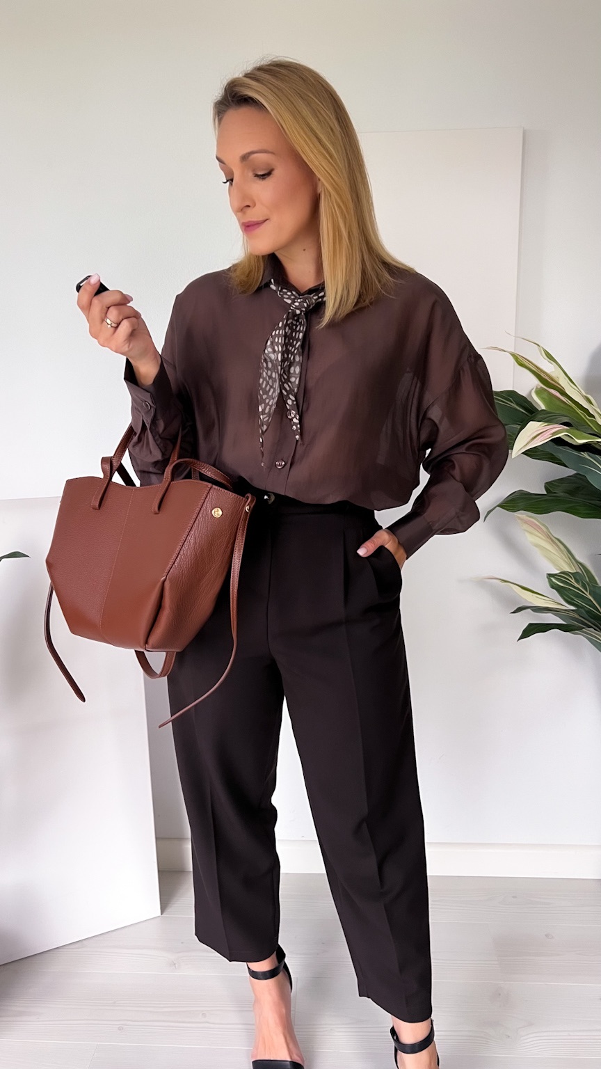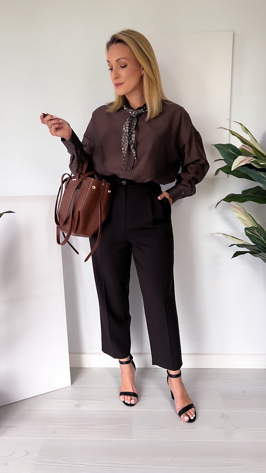 Nadaj swojej stylizacji wyjątkowej klasy dzięki eleganckim spodniom o długości do kostki. Model z perfekcyjnie zaprasowaną nogawką w kant pięknie wydłuża sylwetkę i podkreśla jej proporcje. Wysmakowany odcień głębokiej czekolady dodaje im szlachetności, a jednocześnie jest niezwykle uniwersalny – doskonale sprawdzi się zarówno w stylizacjach biznesowych, jak i wieczorowych.