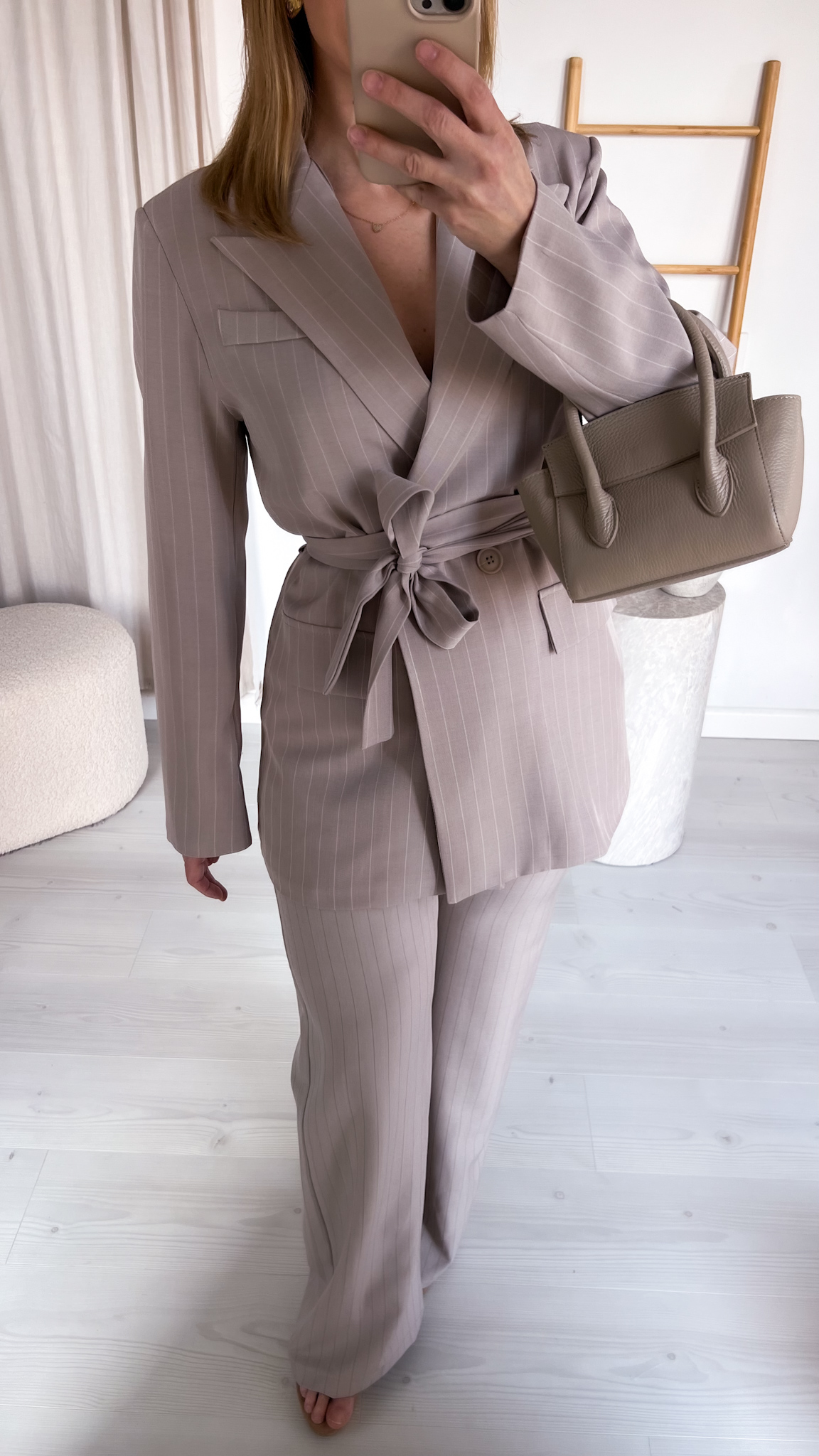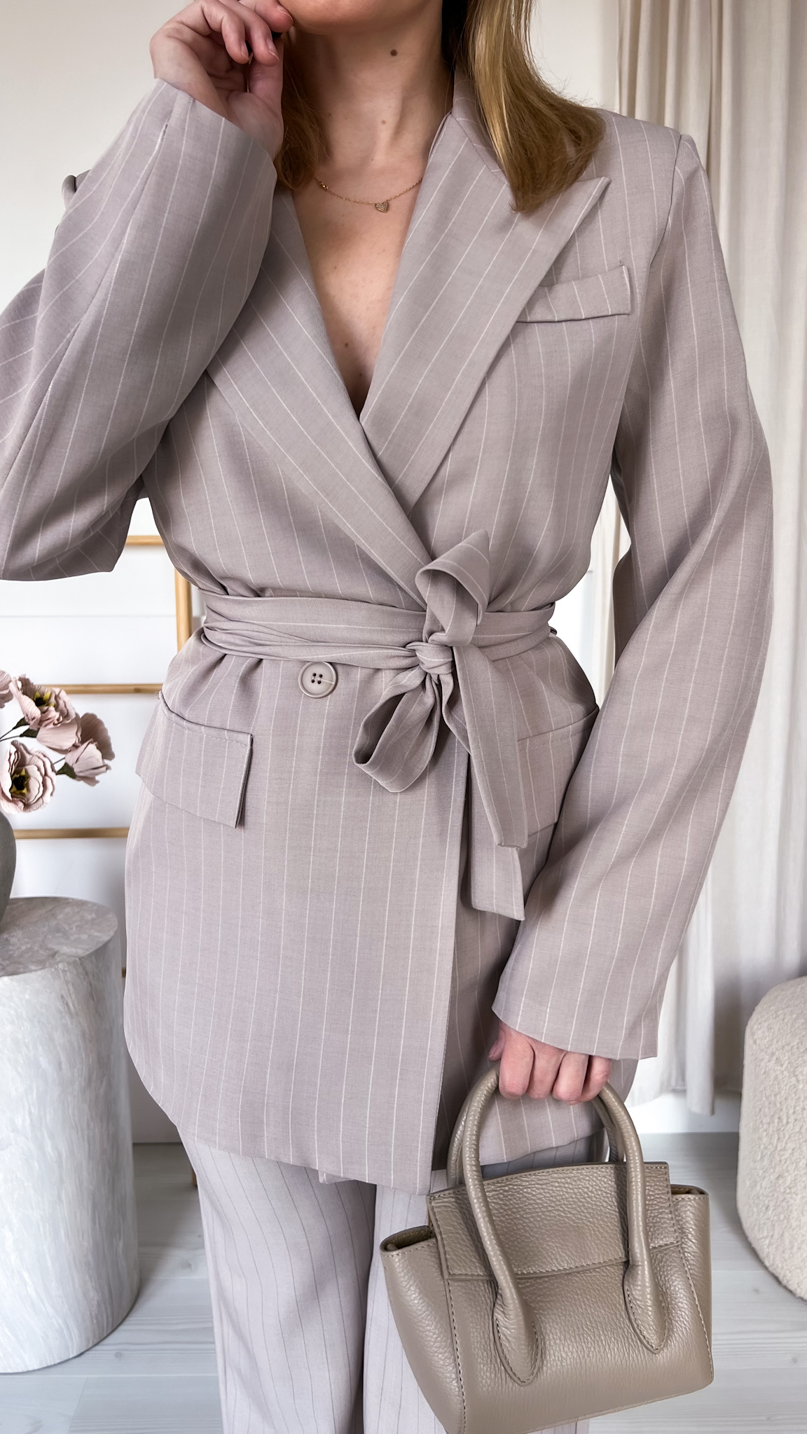 Garnitur w drobne pionowe paski to stylowy i ponadczasowy komplet, który łączy elegancję z nowoczesnym luzem. W zestawie znajduje się dopasowana marynarka oraz spodnie o klasycznym kroju, tworzące harmonijną całość idealną zarówno na co dzień, jak i na bardziej formalne okazje. Subtelny wzór w pionowe paski optycznie wysmukla sylwetkę i dodaje całości wyrafinowanego charakteru.