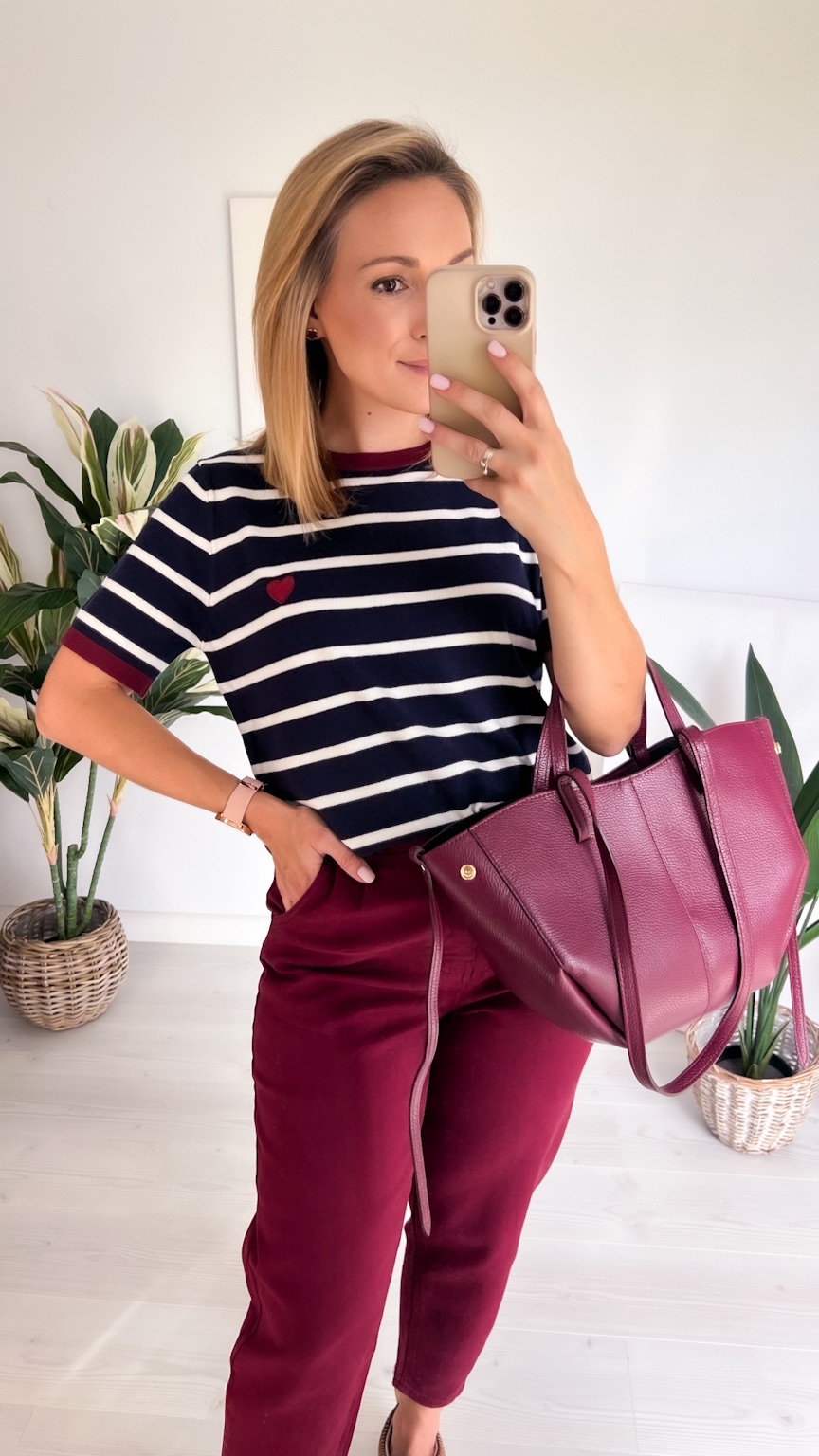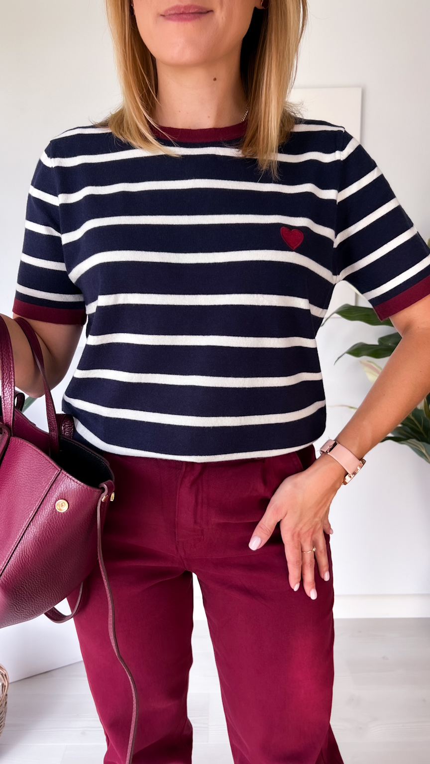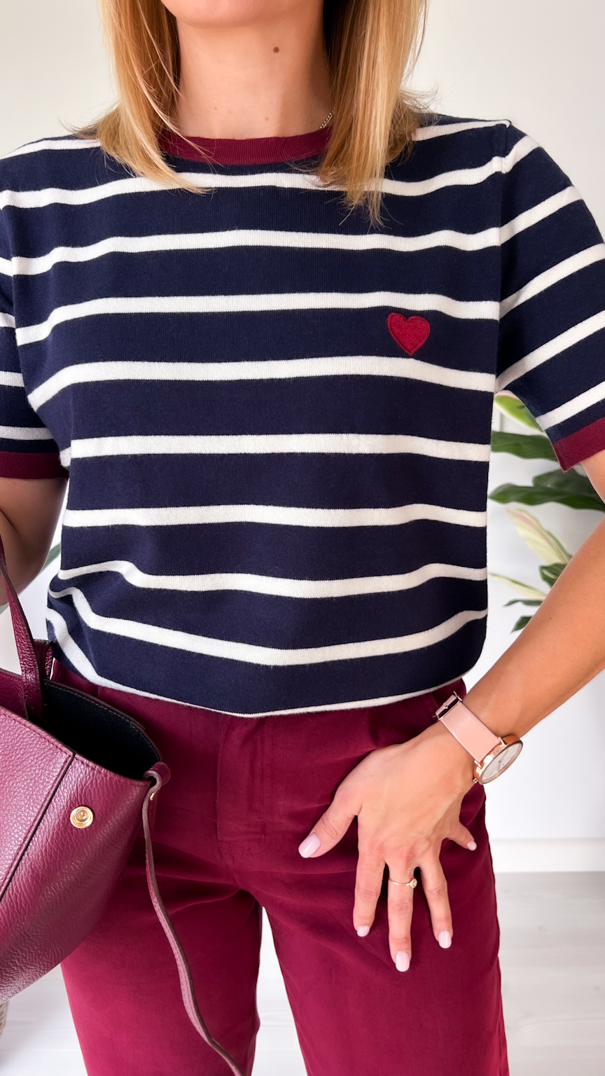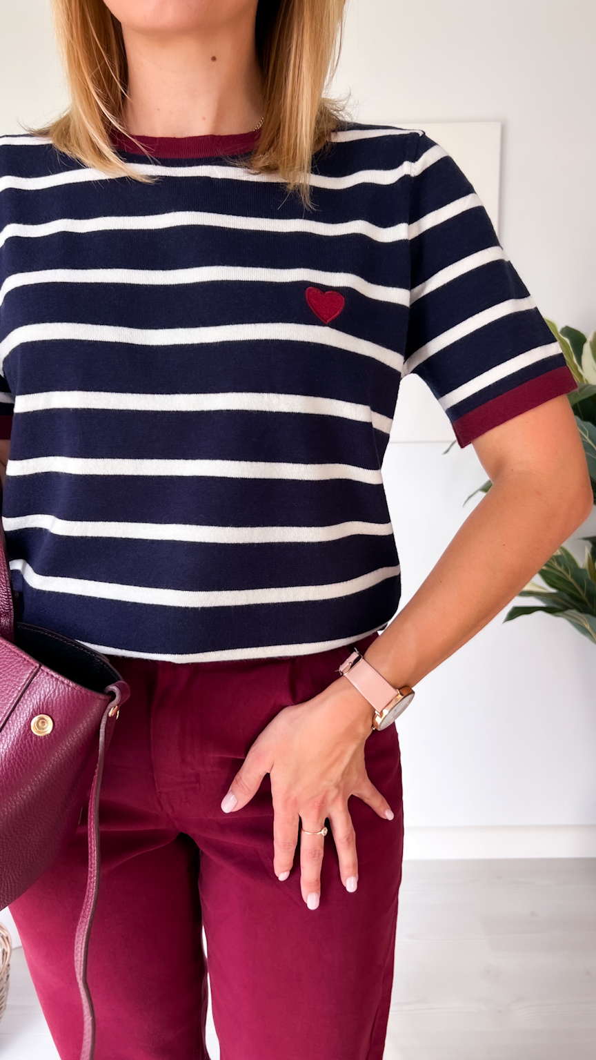 Jesienny sweterek z dzianiny w paski z uroczym serduszkiem