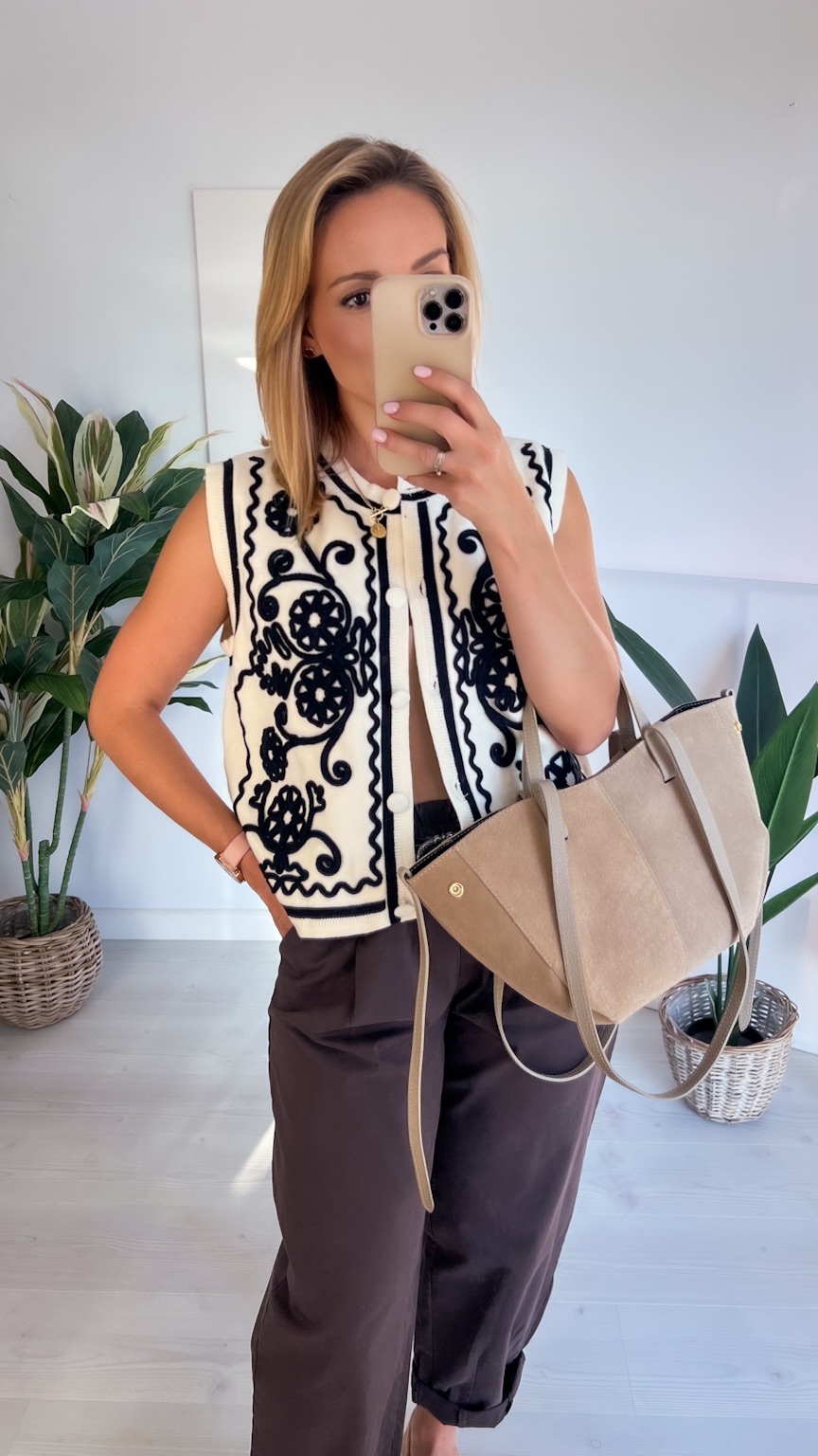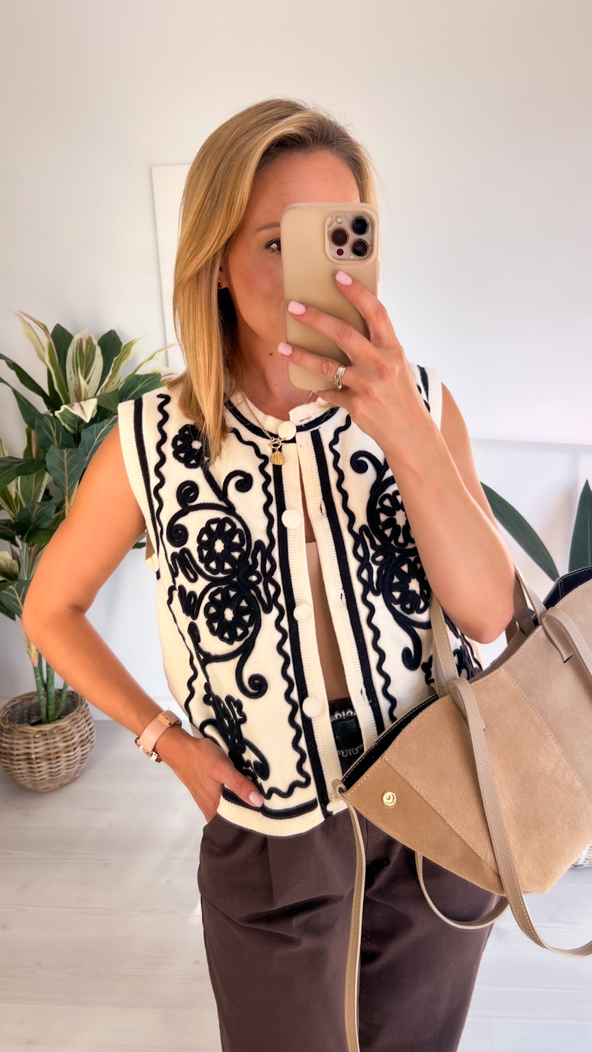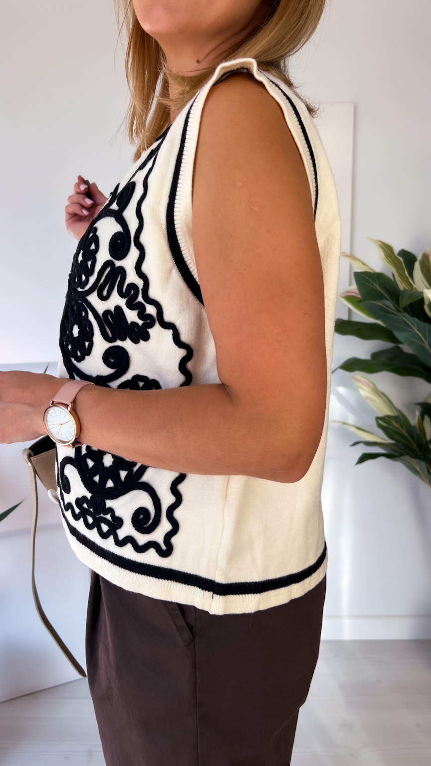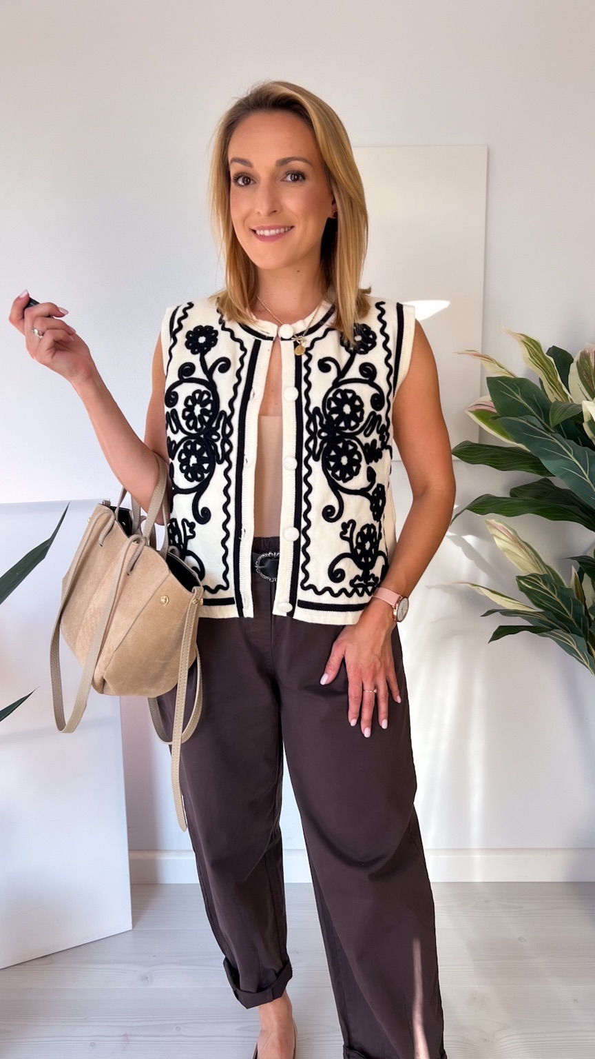 Dzianinowa kamizelka z haftami – idealna na jesień