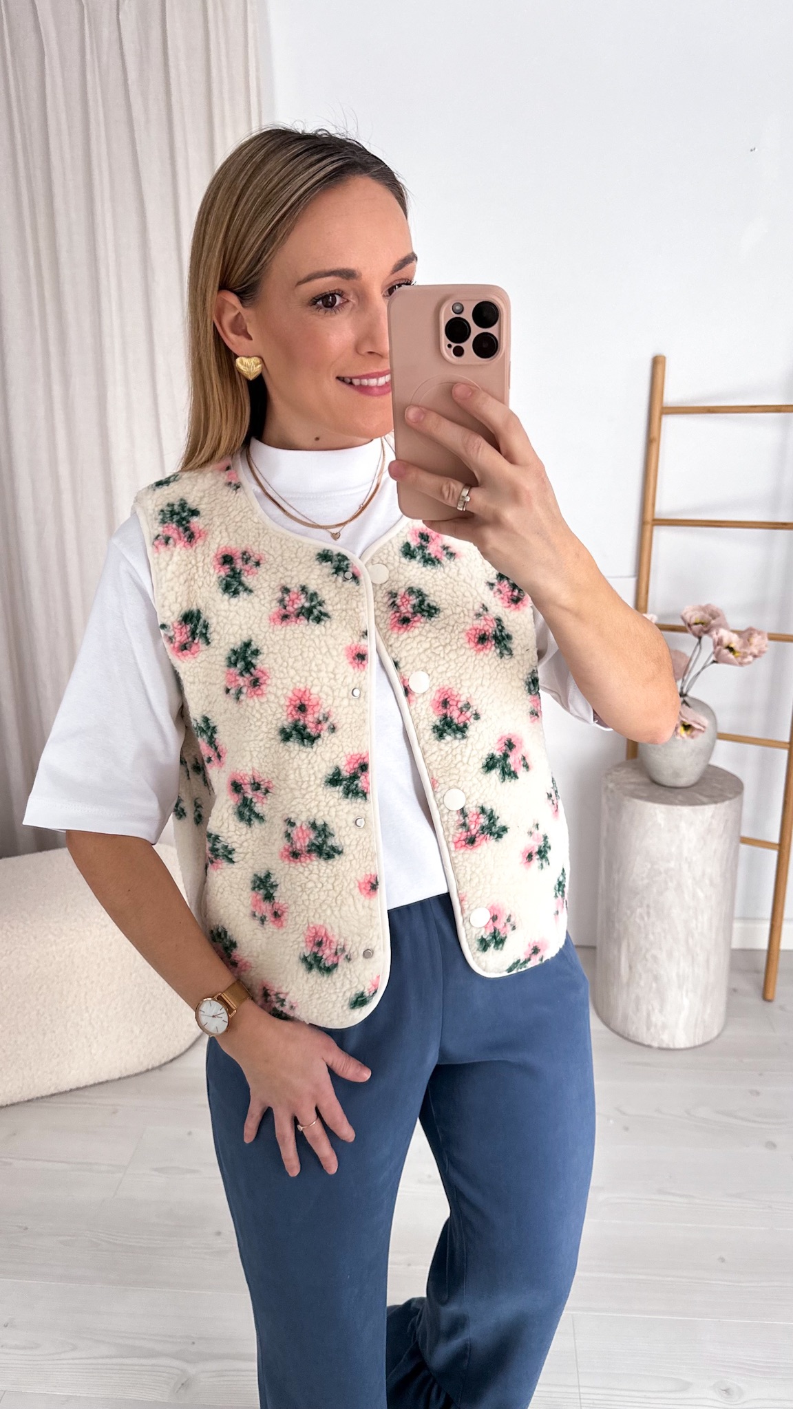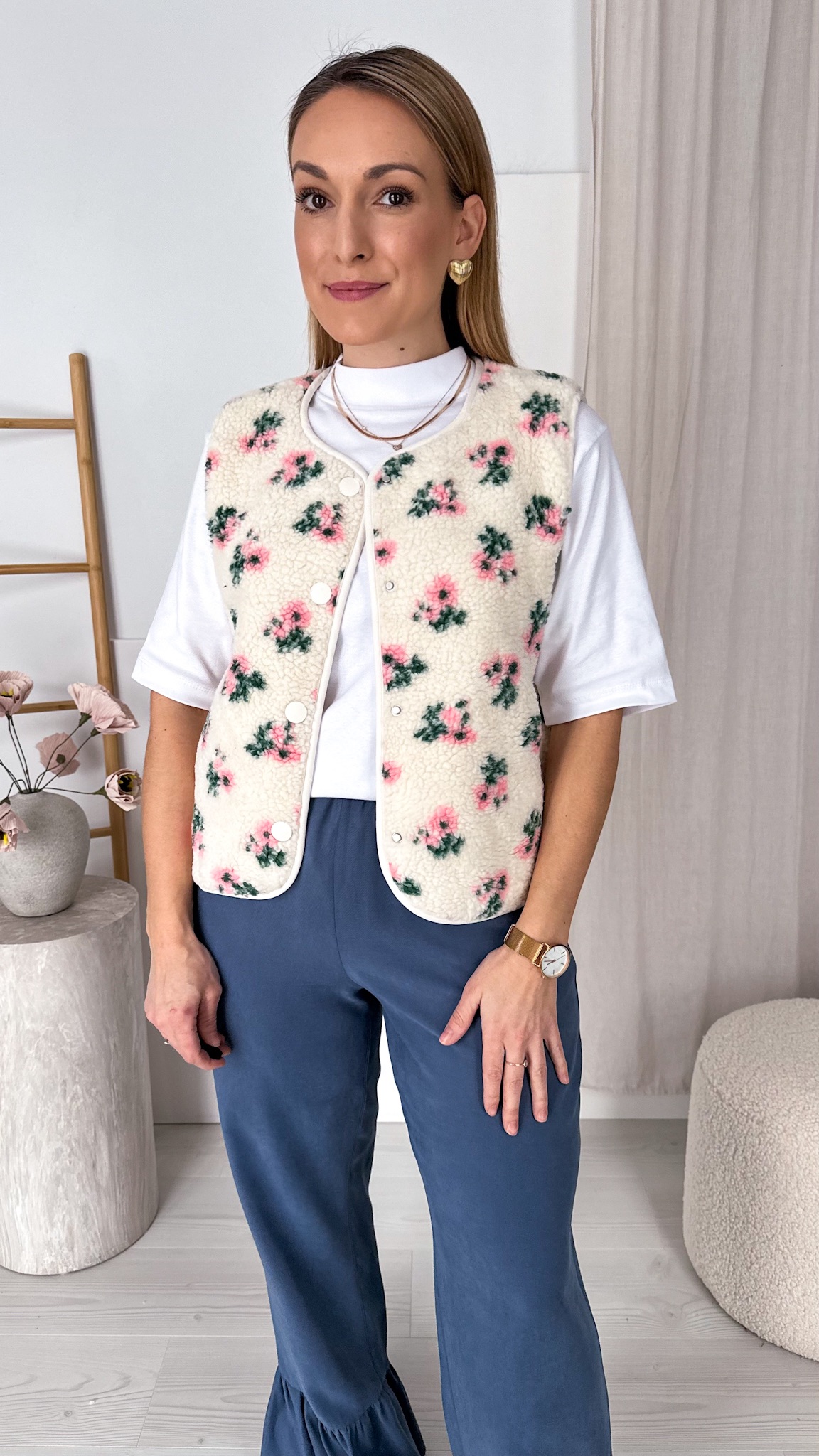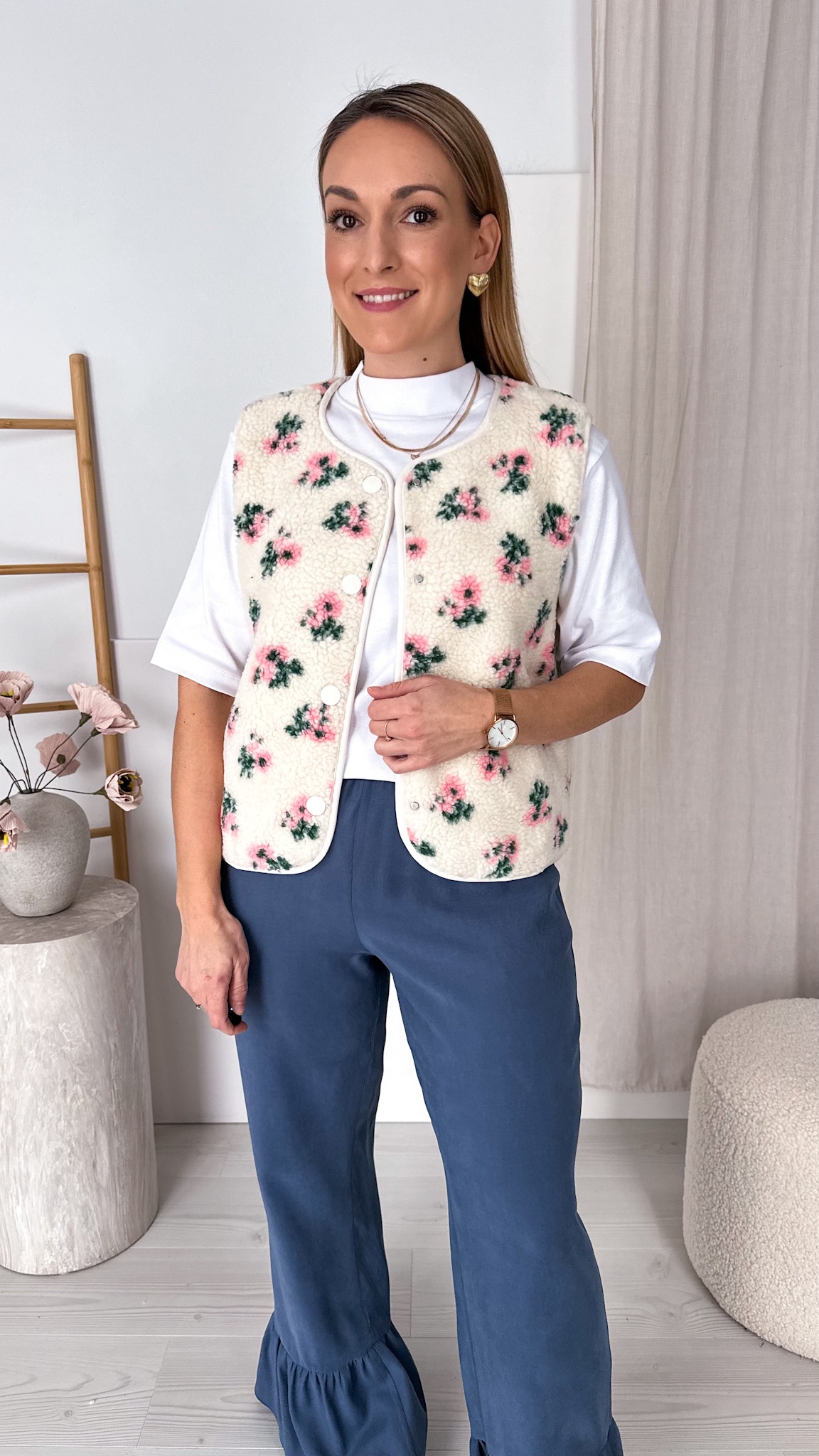 Model został ozdobiony drobniutkimi pudrowymi kwiatuszkami, które pięknie kontrastują z miękką, puszystą strukturą materiału, nadając całości niezwykle subtelnego i romantycznego wyglądu. Kamizelka zapinana jest na praktyczne napy, dzięki czemu jest wygodna w codziennym noszeniu i świetnie sprawdzi się jako warstwa w chłodniejsze dni.