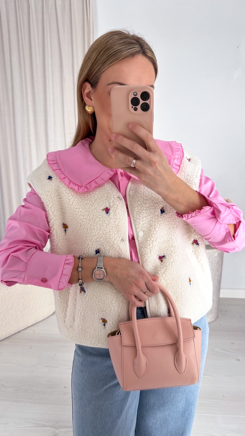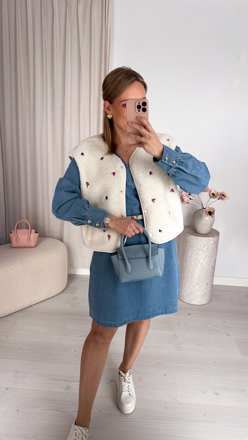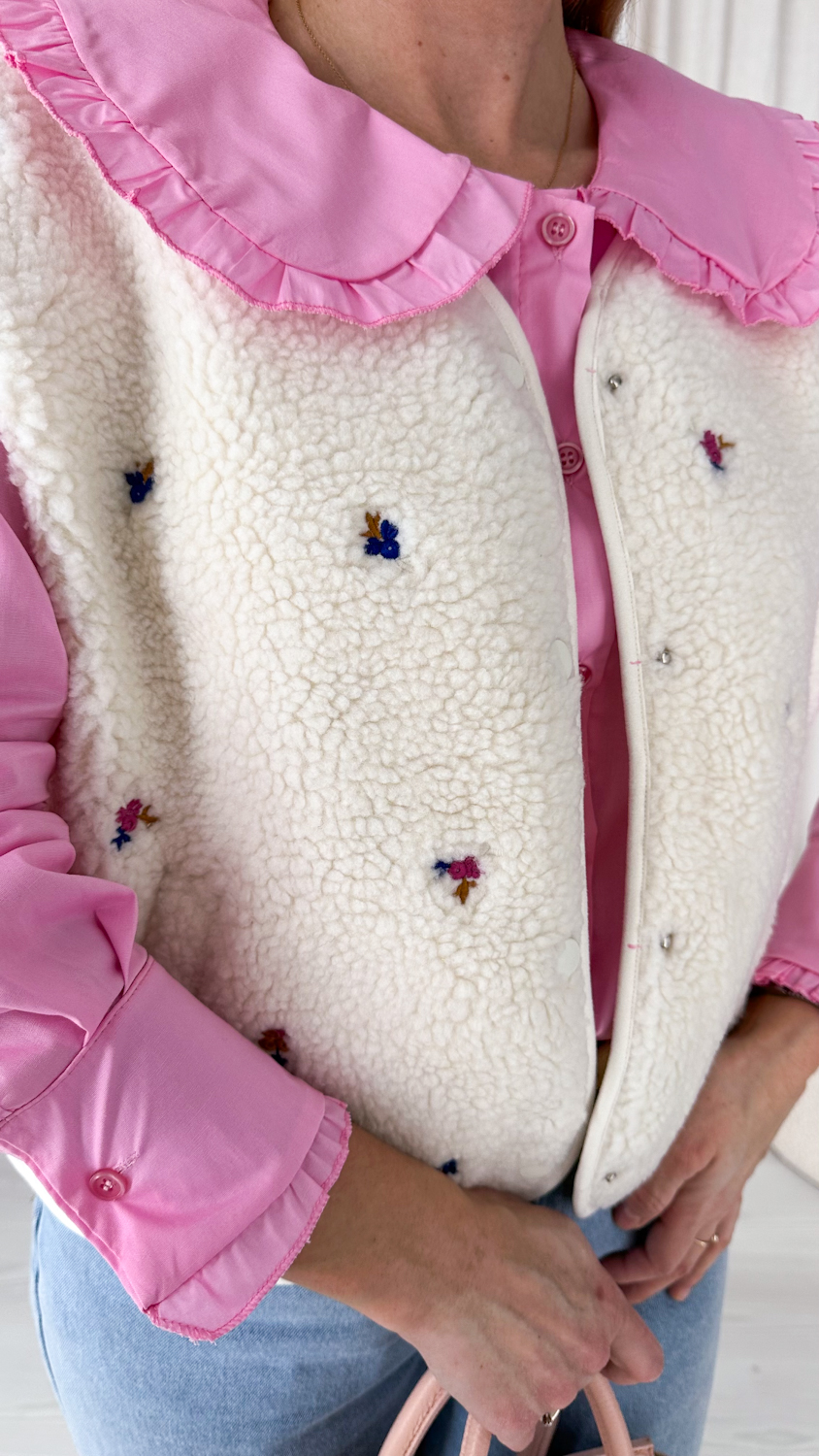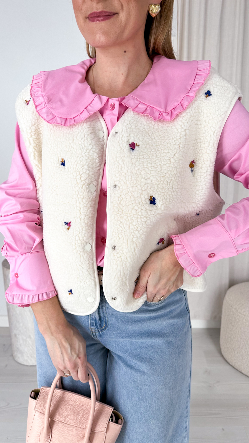 Kamizelka typu baranek w haftowane kwiatuszki to propozycja dla miłośniczek ciepłych, stylowych dodatków z romantycznym akcentem. Miękka, puszysta faktura pięknie otula sylwetkę, a subtelne haftowane kwiaty nadają jej dziewczęcego i niepowtarzalnego charakteru.