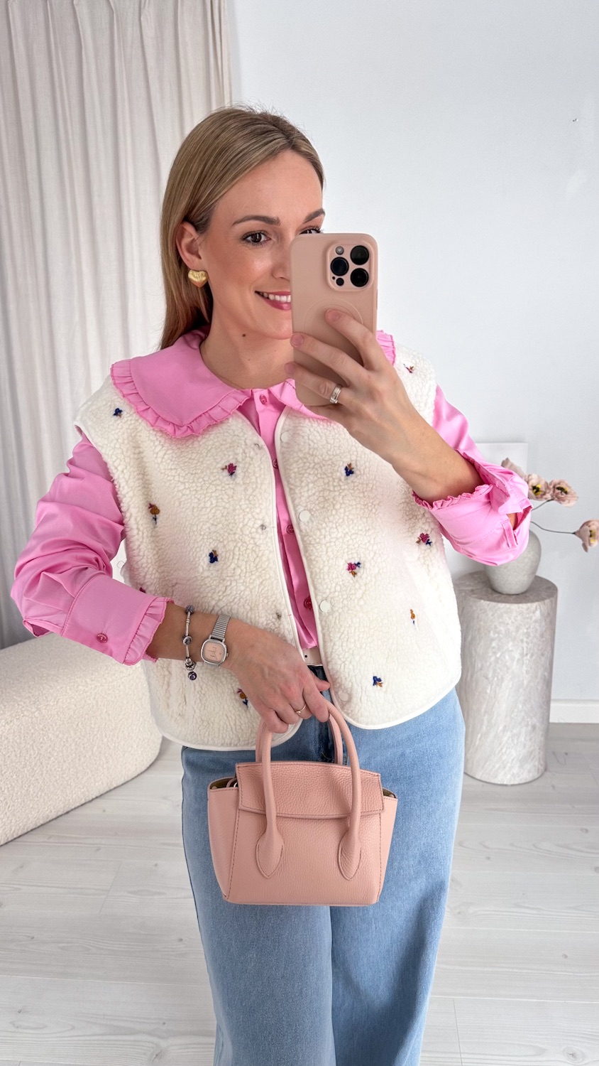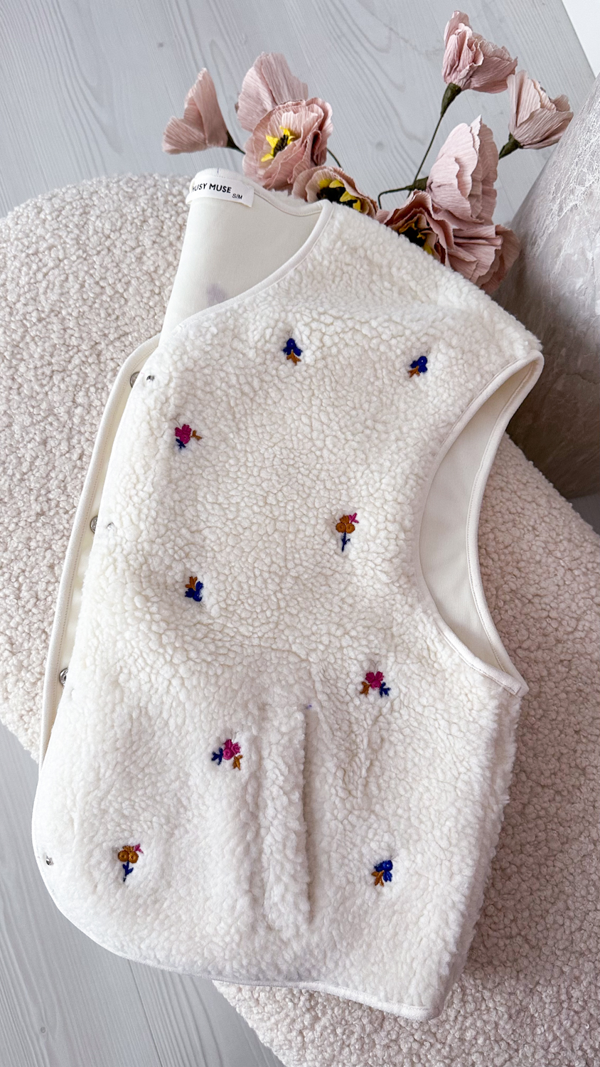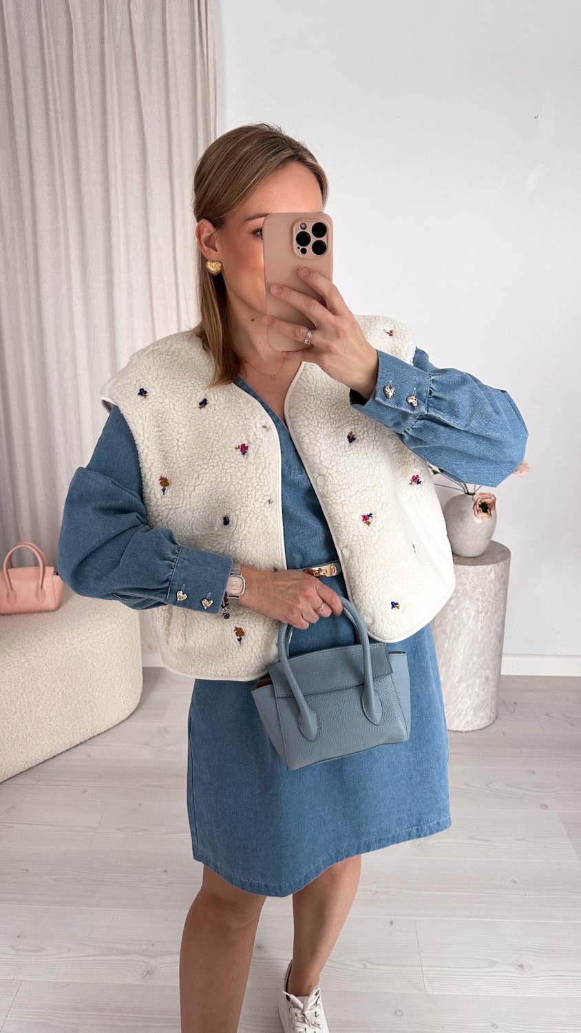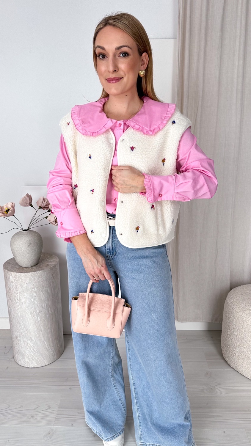 Kamizelka typu baranek w haftowane kwiatuszki to propozycja dla miłośniczek ciepłych, stylowych dodatków z romantycznym akcentem. Miękka, puszysta faktura pięknie otula sylwetkę, a subtelne haftowane kwiaty nadają jej dziewczęcego i niepowtarzalnego charakteru.
