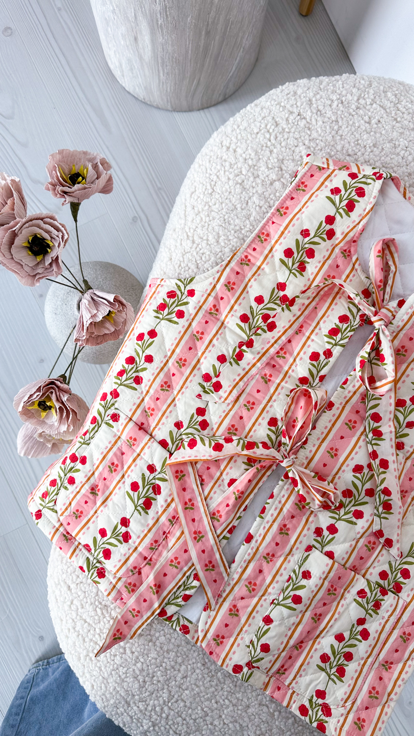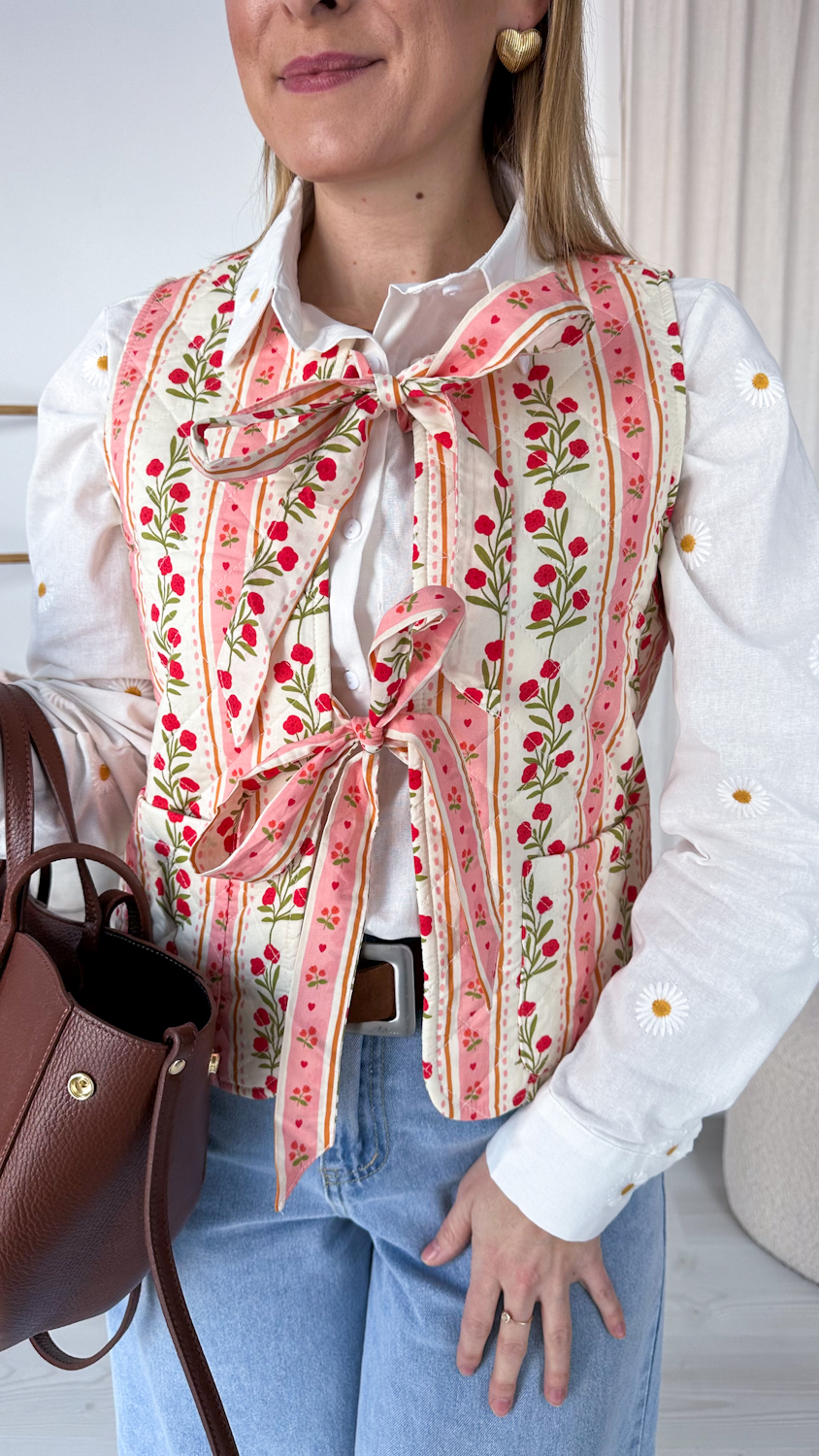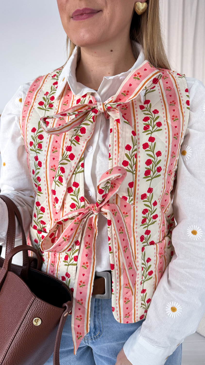 Urocza pikowana kamizelka ozdobiona subtelnym motywem wiosennej łączki to wyjątkowa propozycja dla miłośniczek romantycznych detali. Delikatny, kwiatowy wzór wprowadza świeżość i lekkość do każdej stylizacji, a wiązania z przodu w formie kokardek dodają całości dziewczęcego uroku.
