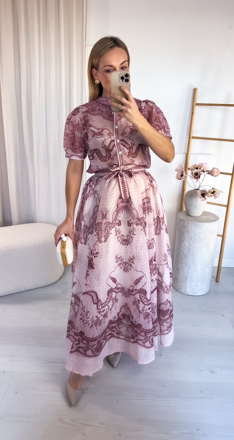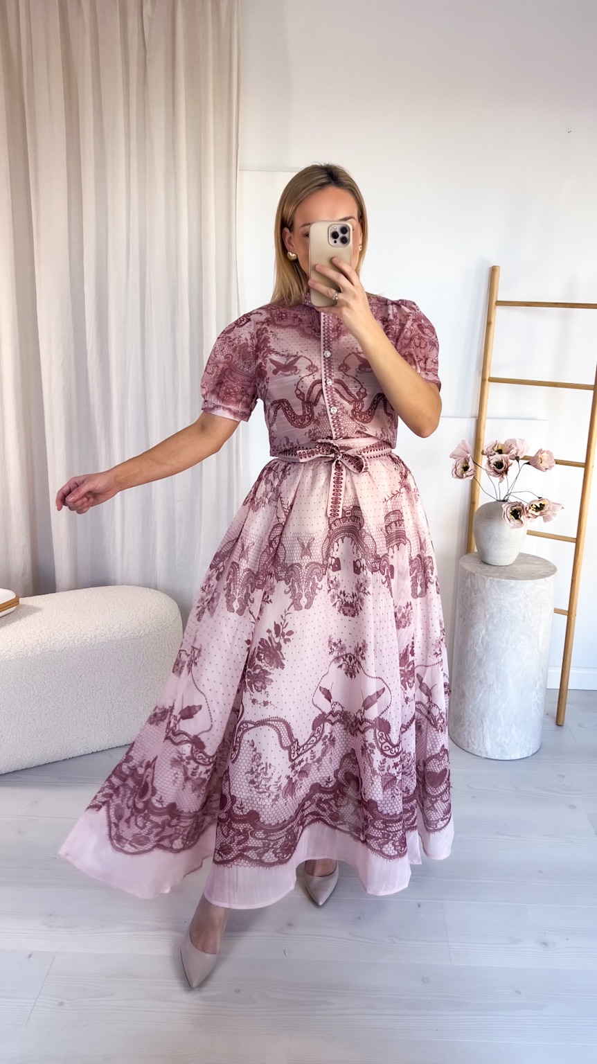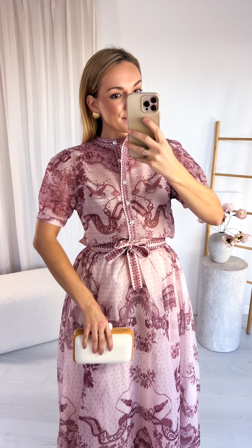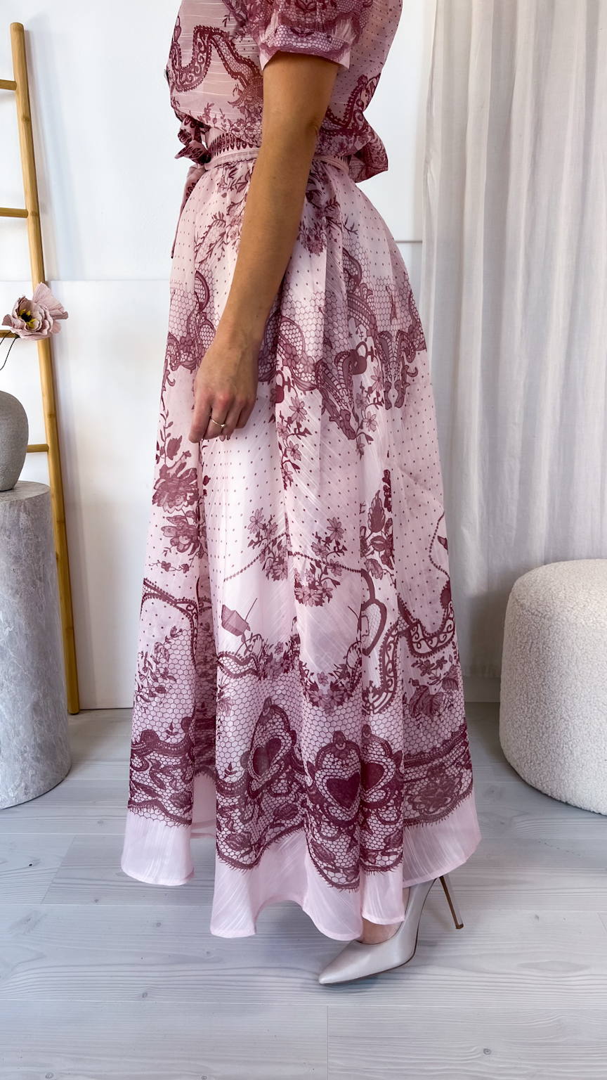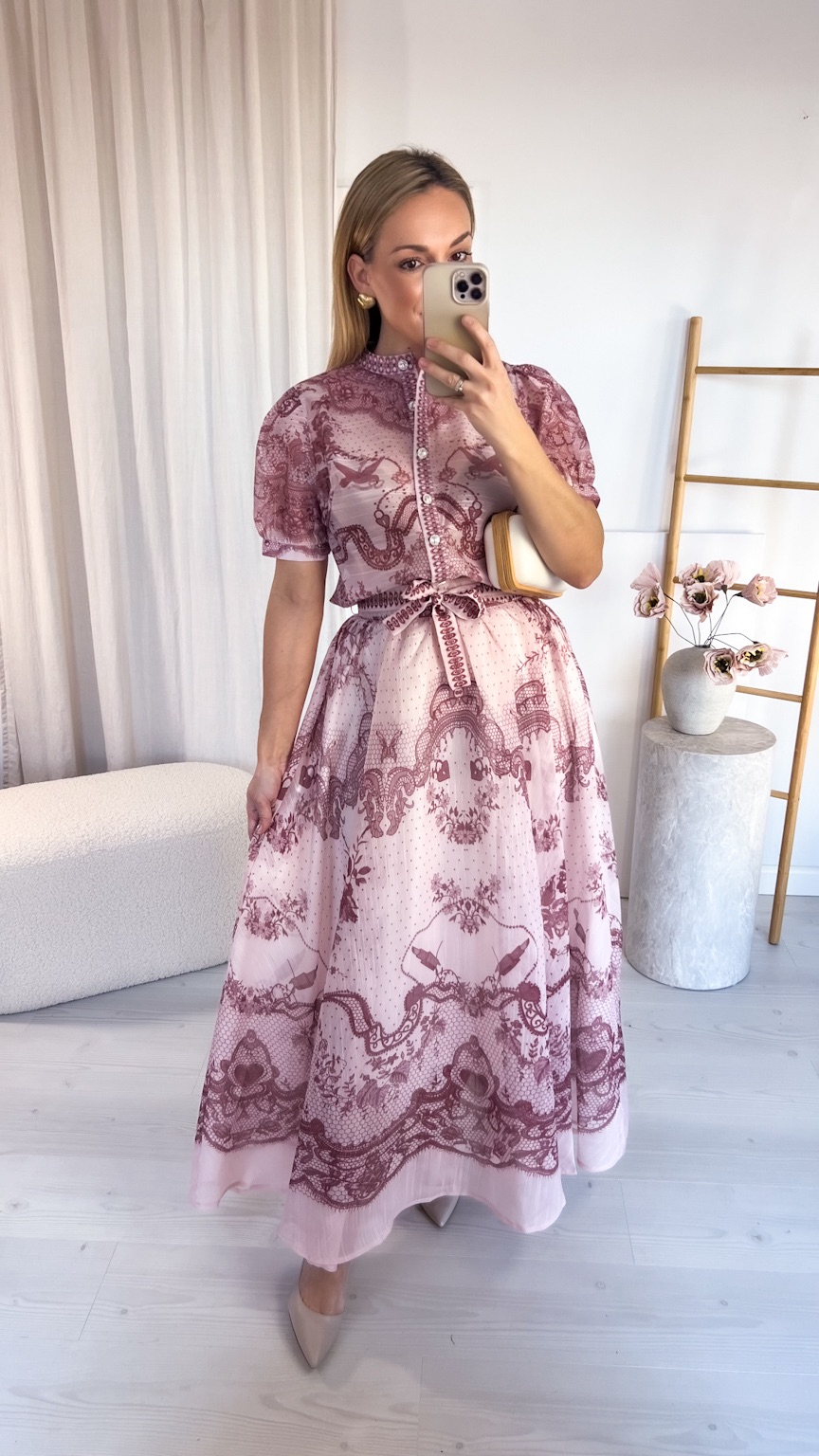 Koszula prezentuje się elegancko i kobieco, a spódnica pięknie układa się na sylwetce, podkreślając talię. Dodatkowo komplet wyposażony jest w pasek do przewiązania w pasie, który pozwala idealnie dopasować stylizację i zaakcentować kobiece proporcje.