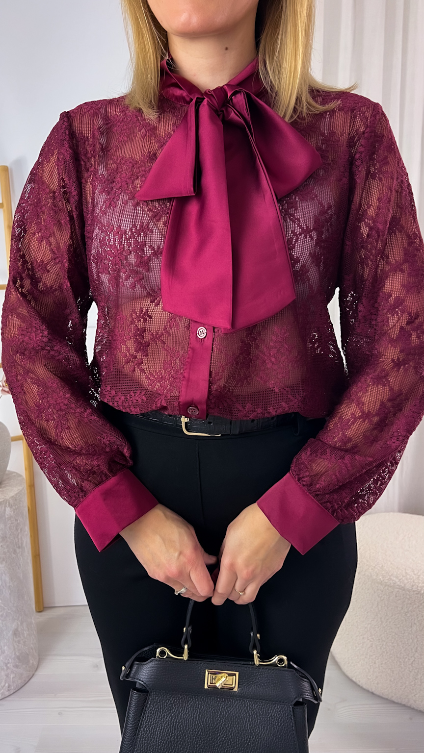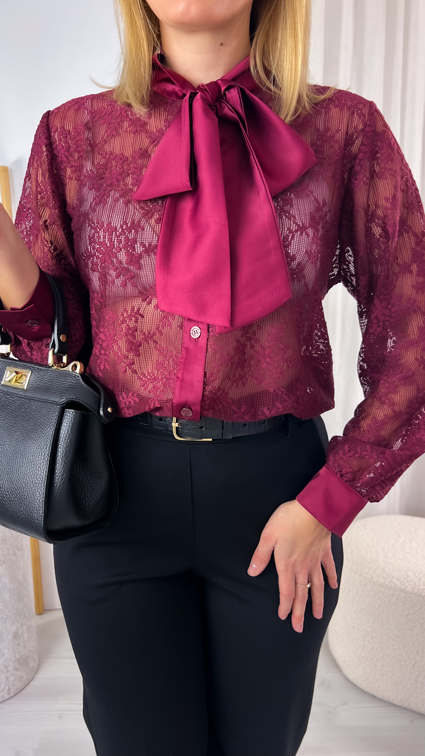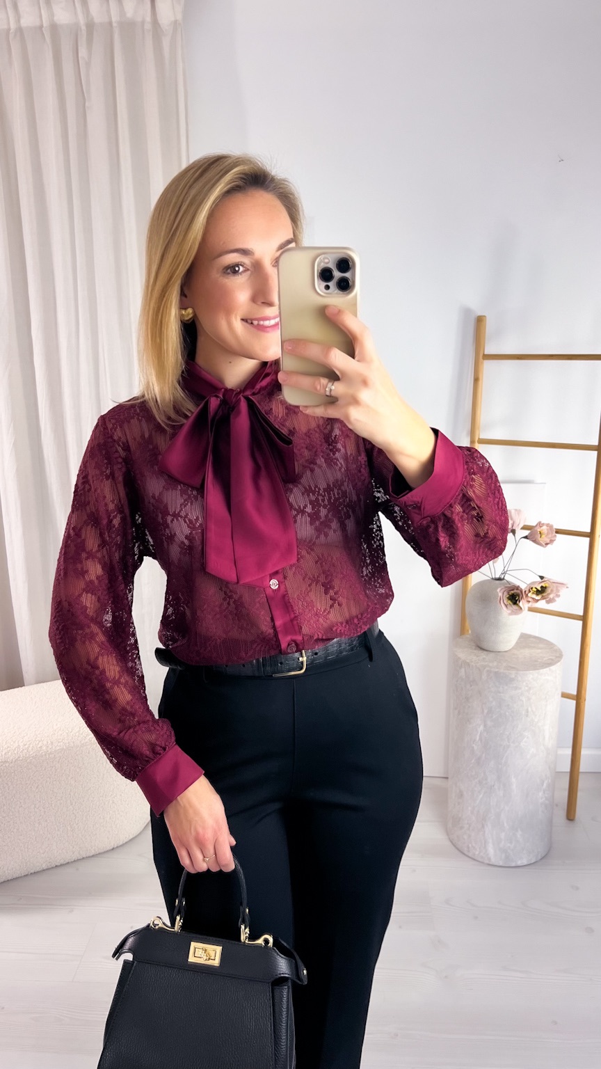 Koronkowa koszula z satynowym wiązaniem pod szyją to propozycja idealna na świąteczne spotkania i wyjątkowe okazje. Delikatna, misternie wykonana koronka nadaje bluzce wyrafinowanego uroku, a satynowa kokarda wiązana pod szyją dodaje jej klasycznego, eleganckiego charakteru.