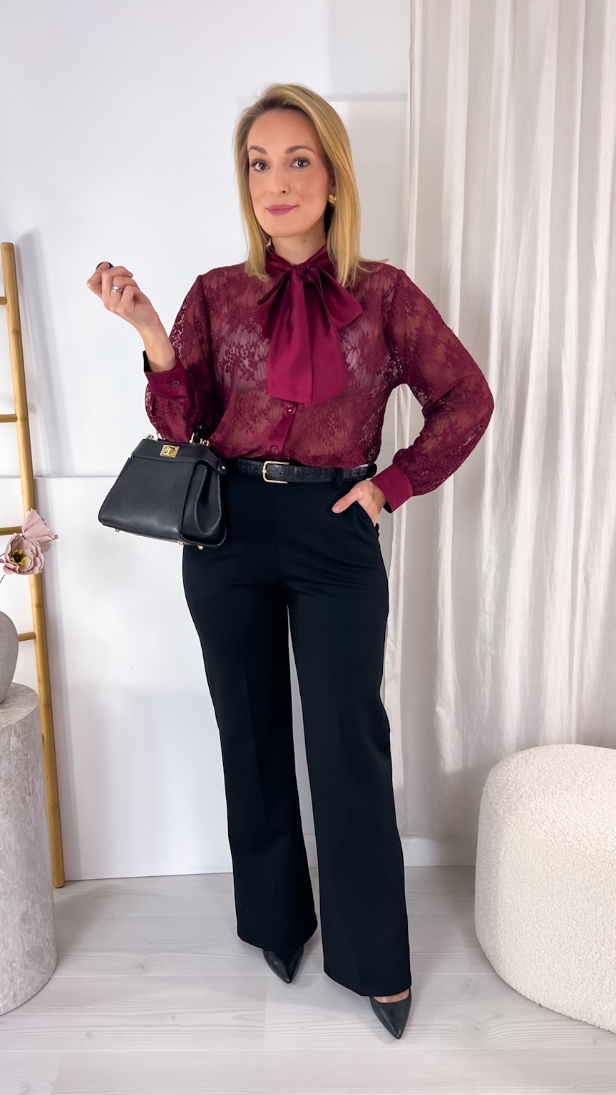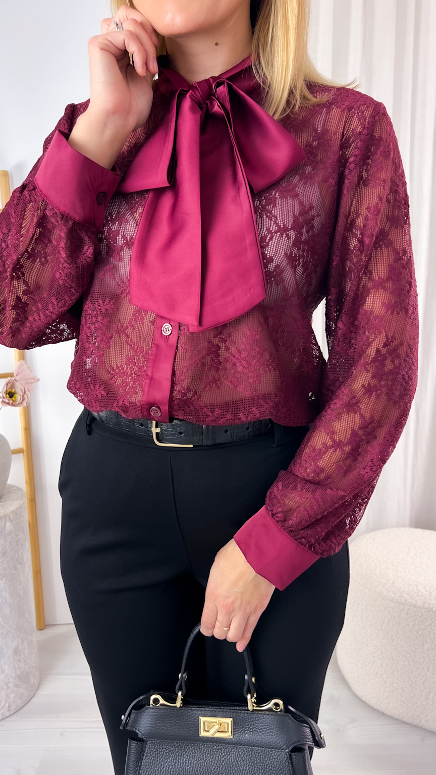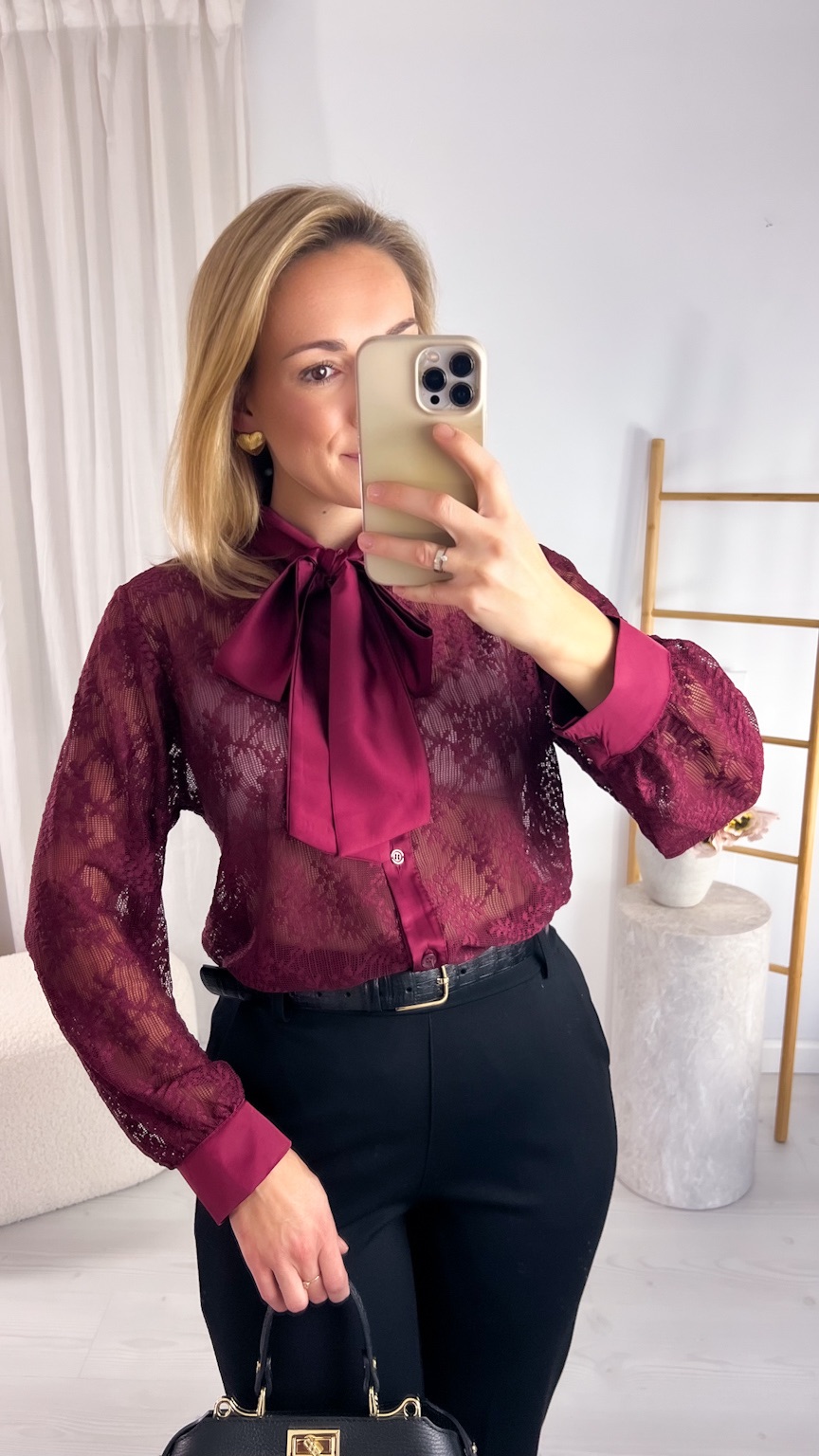 Koronkowa koszula z satynowym wiązaniem pod szyją to propozycja idealna na świąteczne spotkania i wyjątkowe okazje. Delikatna, misternie wykonana koronka nadaje bluzce wyrafinowanego uroku, a satynowa kokarda wiązana pod szyją dodaje jej klasycznego, eleganckiego charakteru.