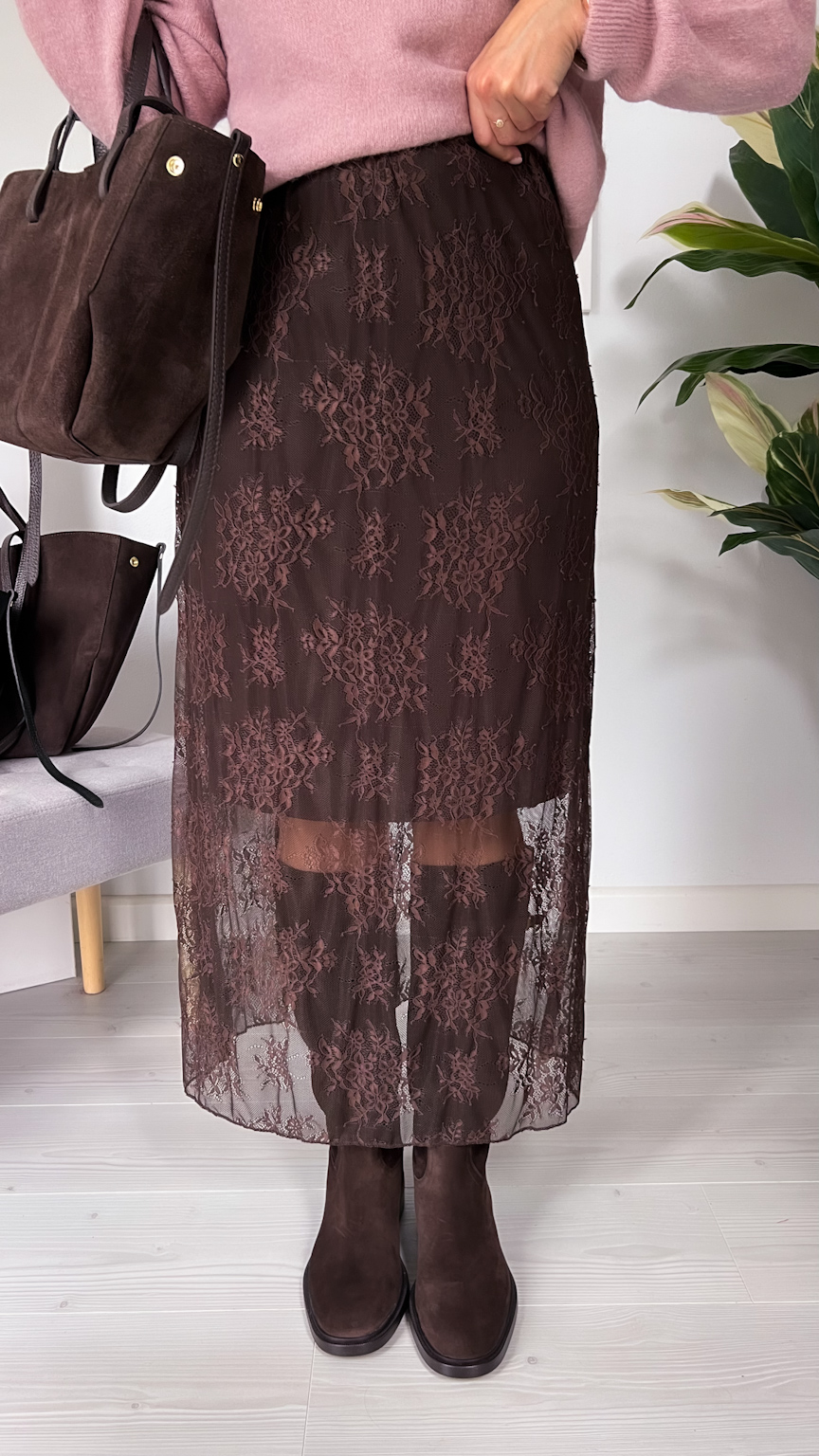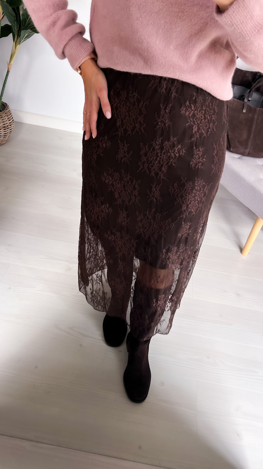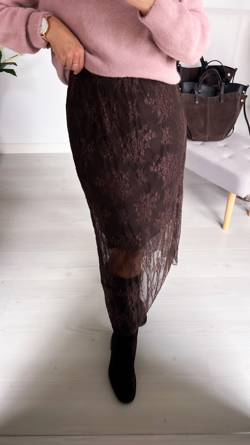 Jeśli szukasz spódnicy, która będzie uniwersalna, kobieca i pełna jesiennego ciepła, ten model z koronki czekoladowej będzie strzałem w dziesiątkę.
