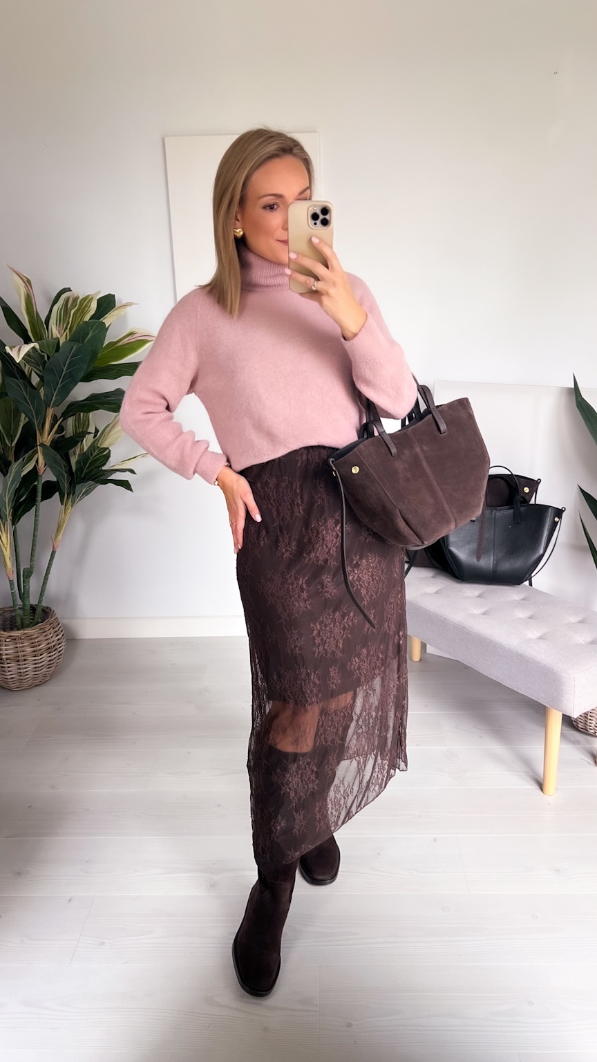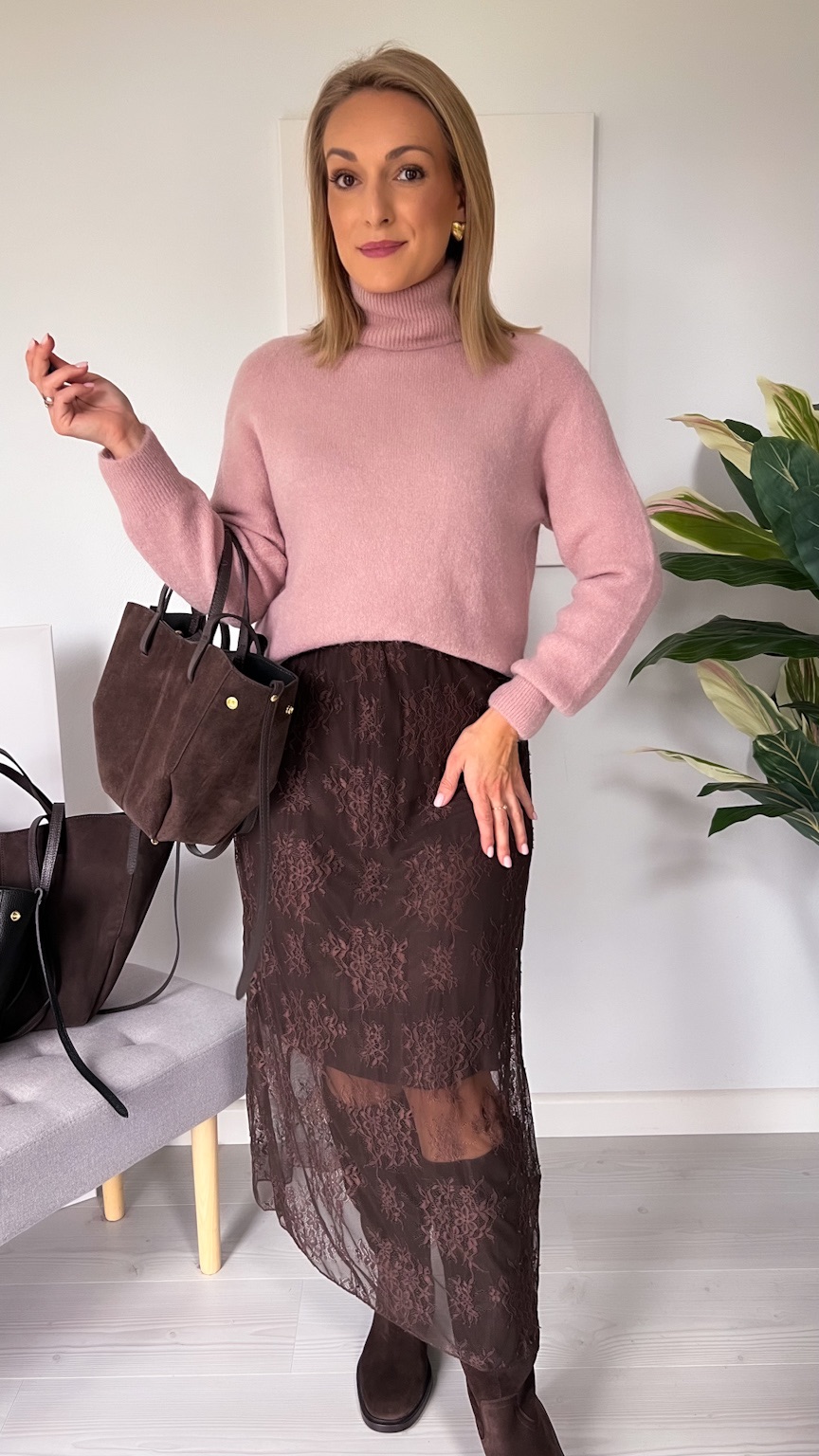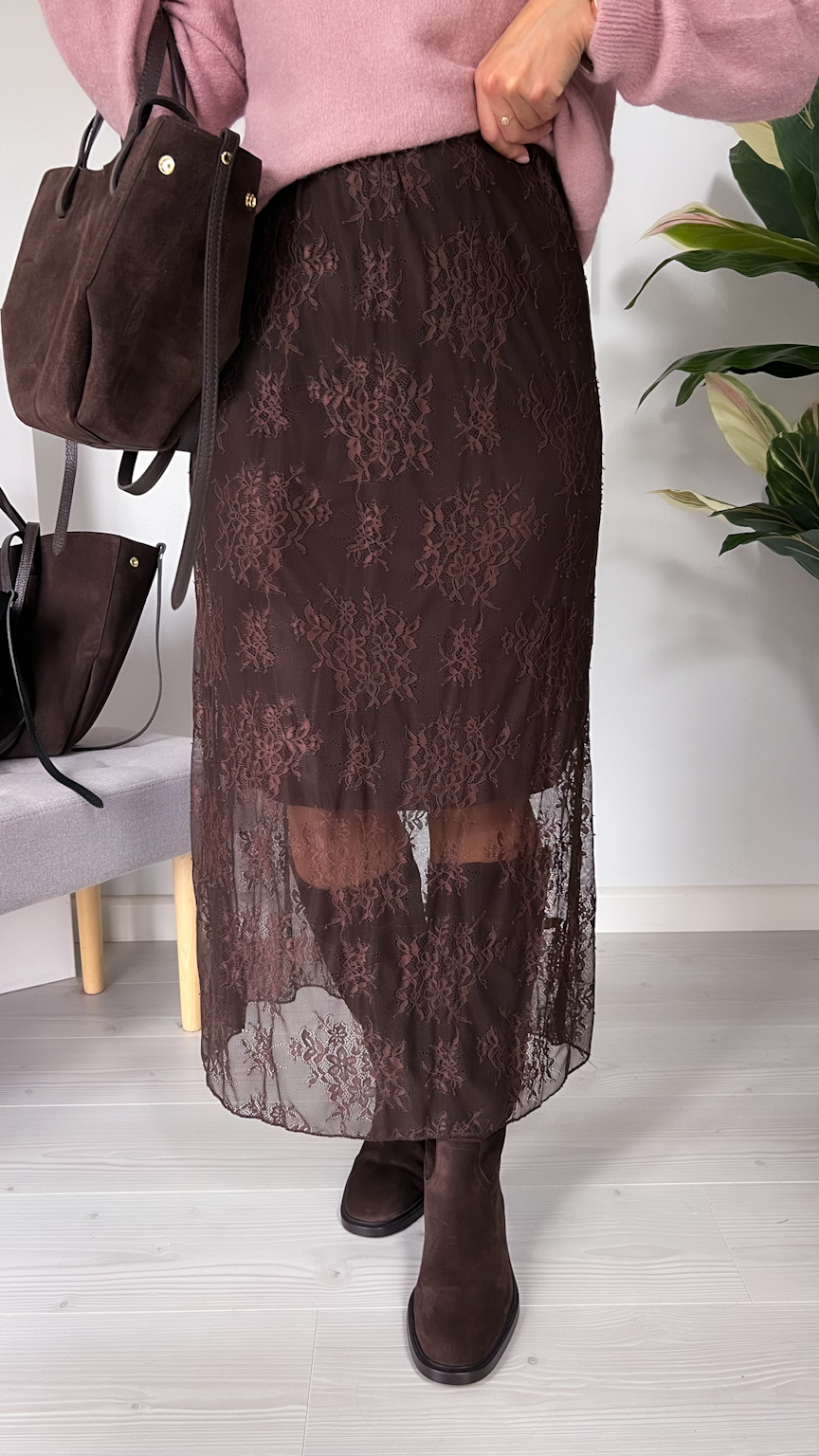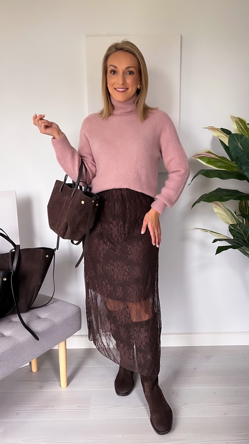 Jeśli szukasz spódnicy, która będzie uniwersalna, kobieca i pełna jesiennego ciepła, ten model z koronki czekoladowej będzie strzałem w dziesiątkę.