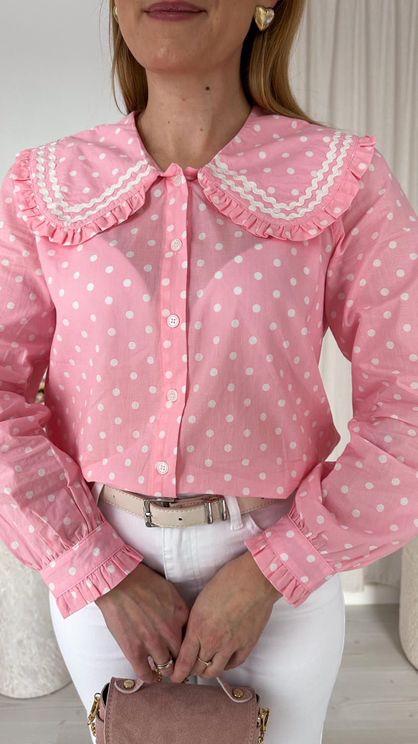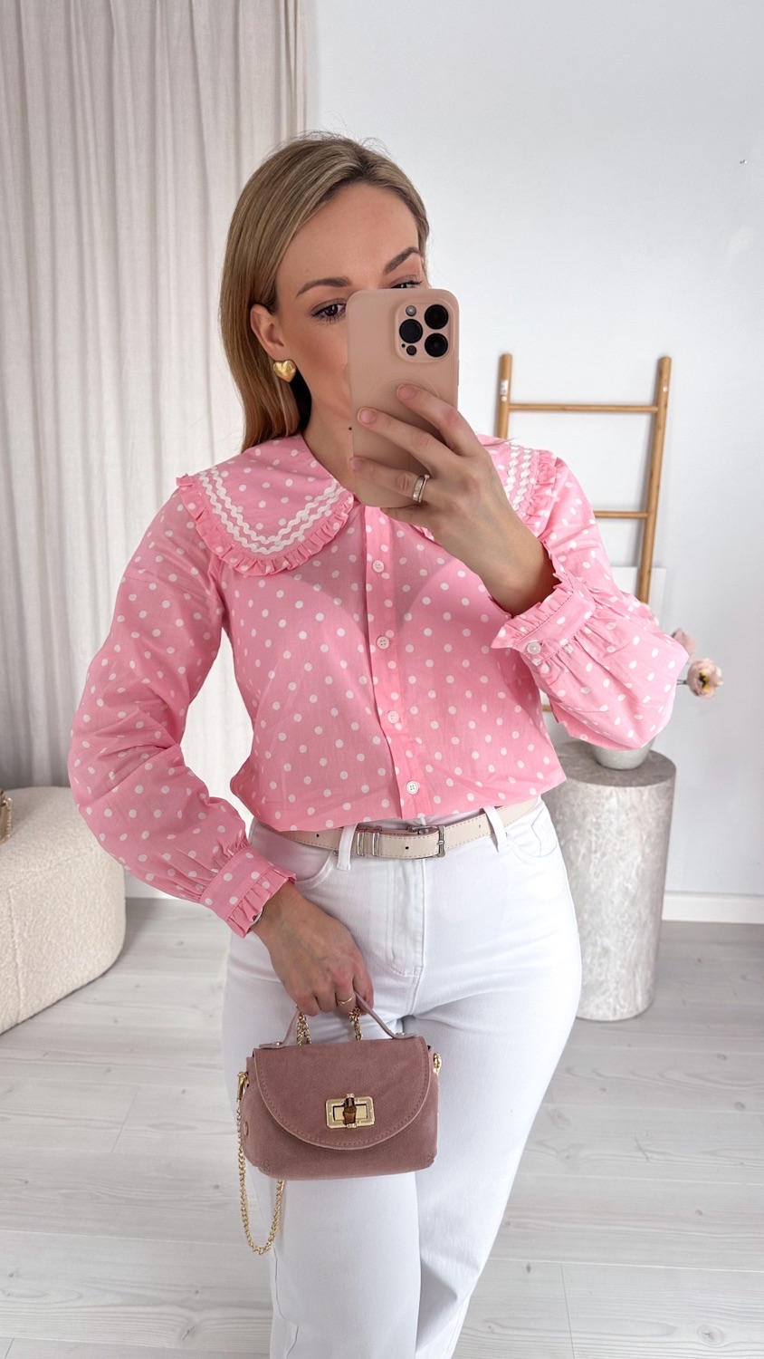 Koralowa koszula z dużym kołnierzem w białe groszki to wyjątkowy model, który łączy dziewczęcy urok z modowym charakterem. Energetyczny odcień koralu pięknie ożywia stylizację, a kontrastowe, białe groszki dodają jej lekkości i ponadczasowego wdzięku.