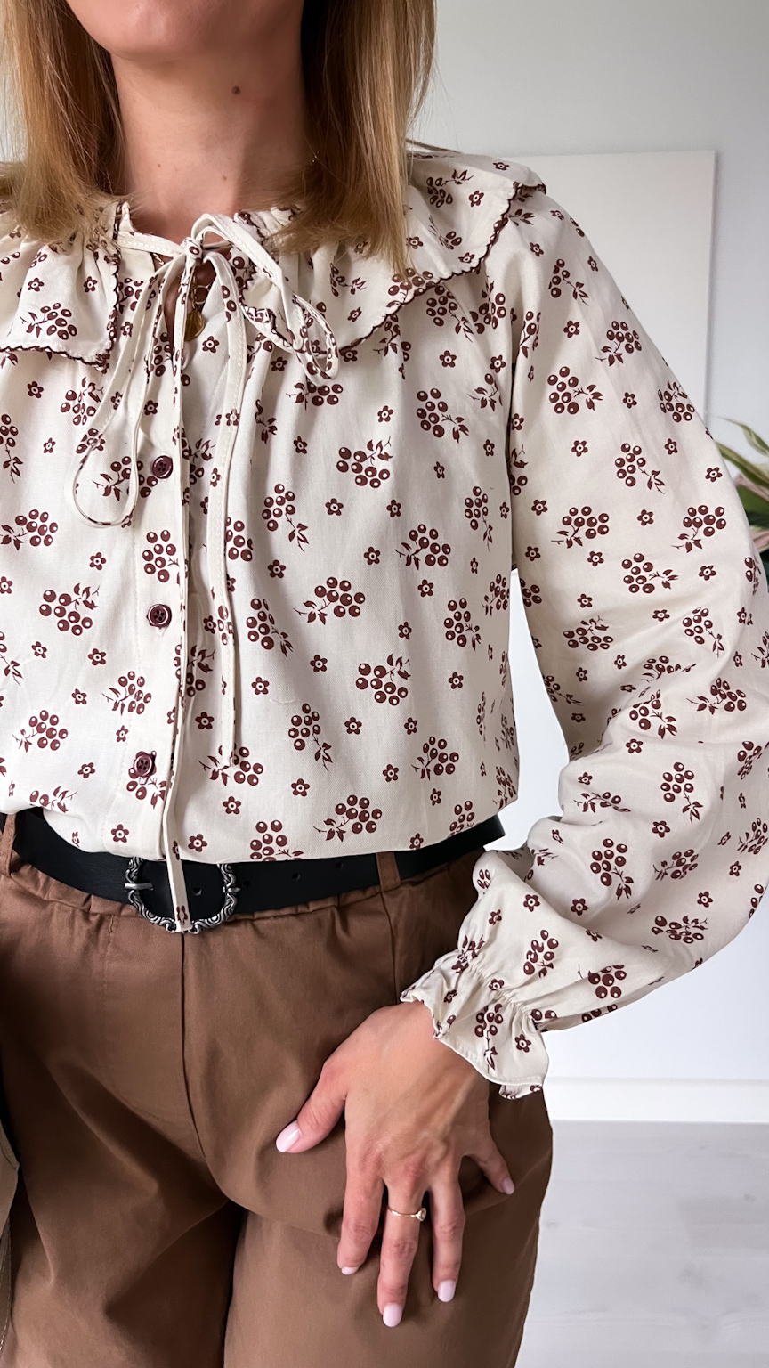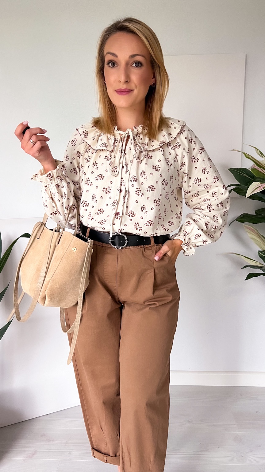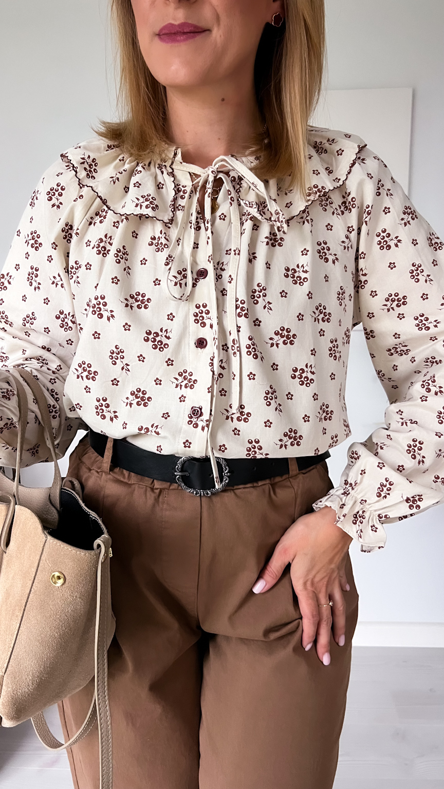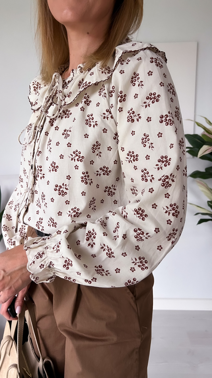Delikatna i pełna uroku koszula w beżowym odcieniu, ozdobiona subtelnym wzorem czekoladowych kwiatuszków. Jej wyjątkowym atutem jest piękny kołnierz z możliwością zawiązania na kokardkę – dodaje on całości romantycznego i kobiecego charakteru.