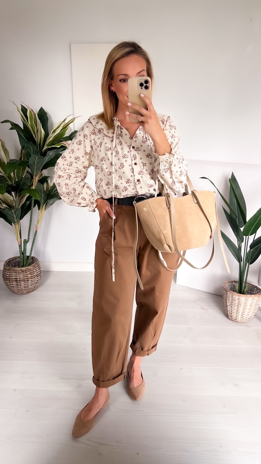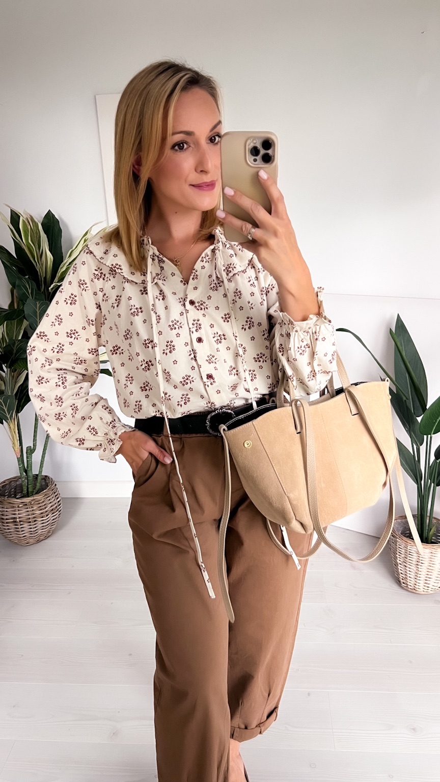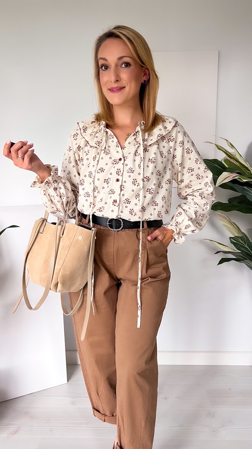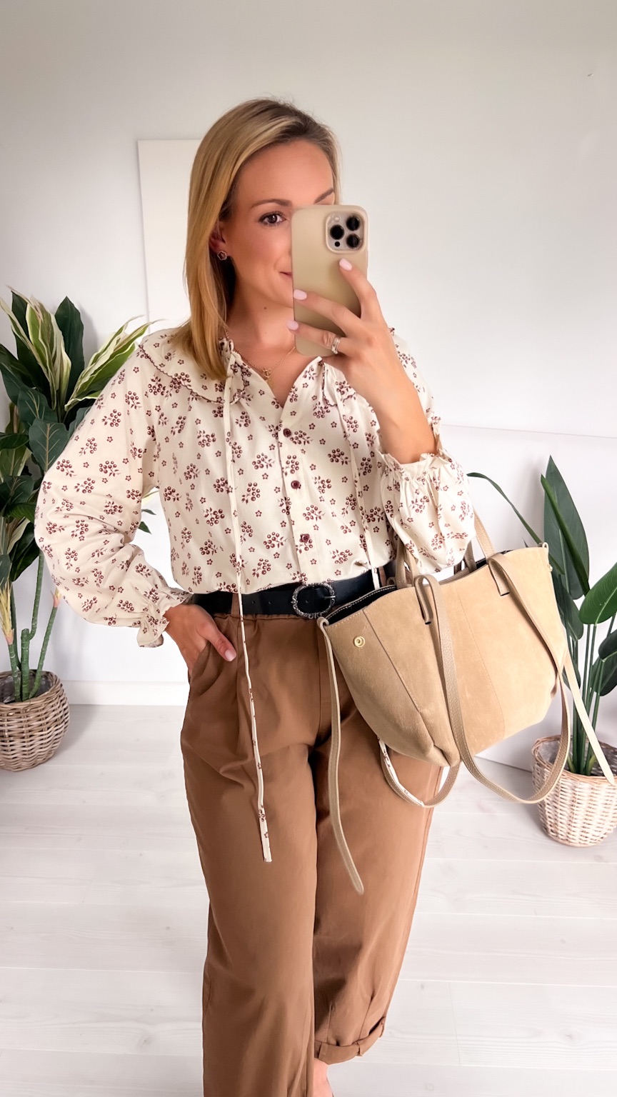 Delikatna i pełna uroku koszula w beżowym odcieniu, ozdobiona subtelnym wzorem czekoladowych kwiatuszków. Jej wyjątkowym atutem jest piękny kołnierz z możliwością zawiązania na kokardkę – dodaje on całości romantycznego i kobiecego charakteru.