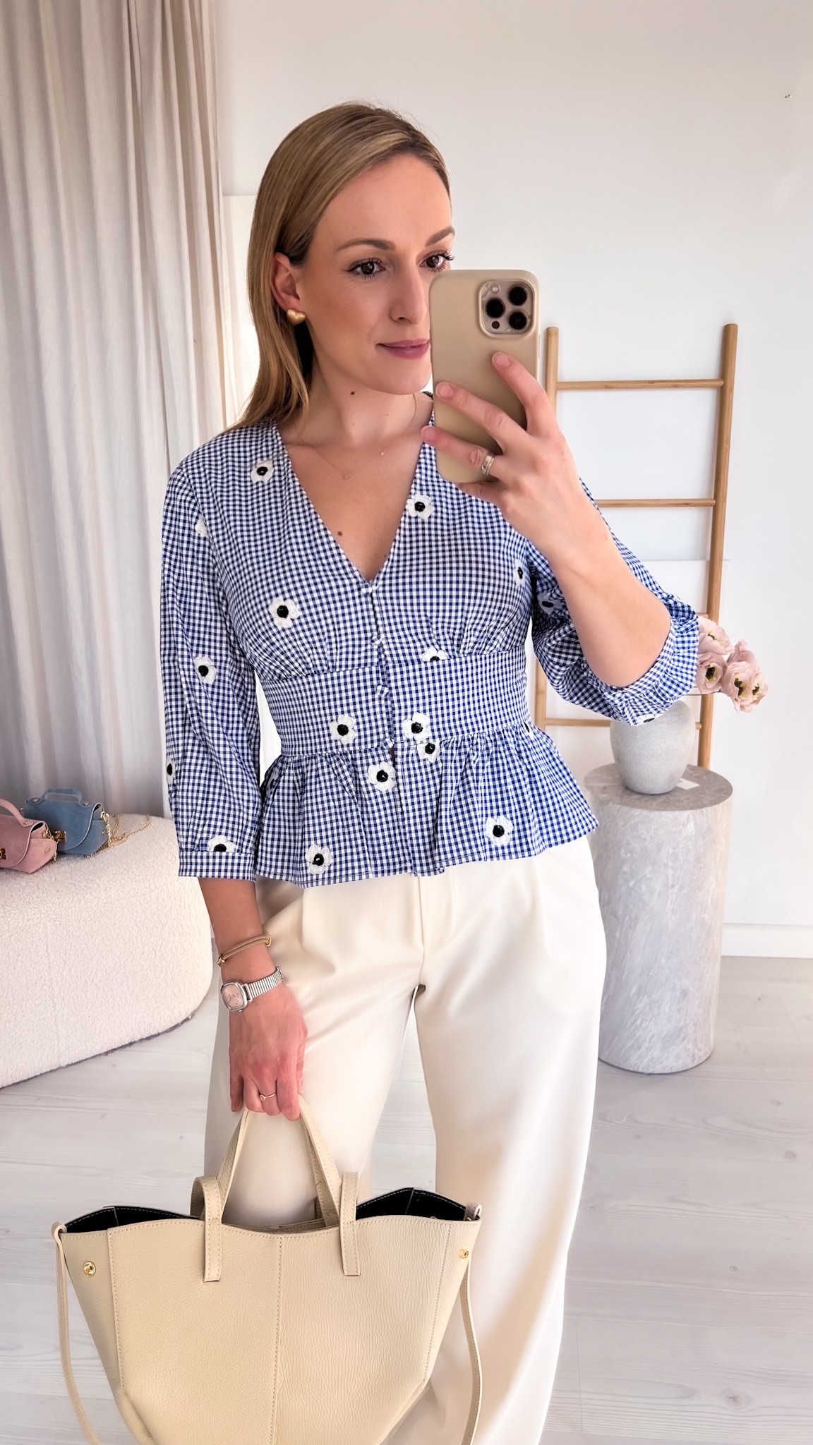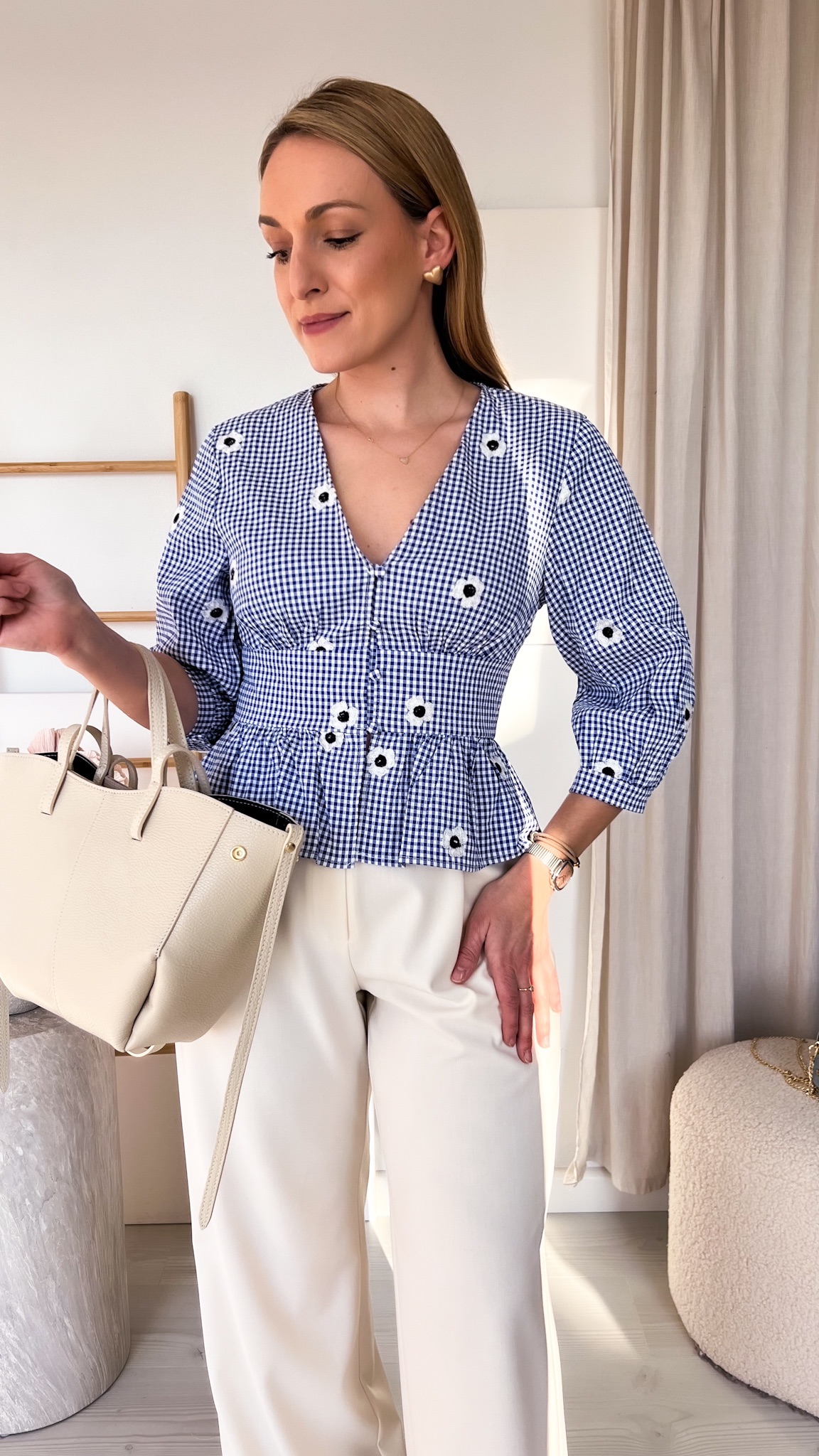 Urocza koszula w drobną niebiesko-białą krateczkę, ozdobiona subtelnymi haftowanymi kwiatuszkami, które nadają jej wyjątkowego, dziewczęcego uroku. Połączenie klasycznego wzoru z delikatnymi detalami tworzy niezwykle stylową i przyciągającą uwagę całość.