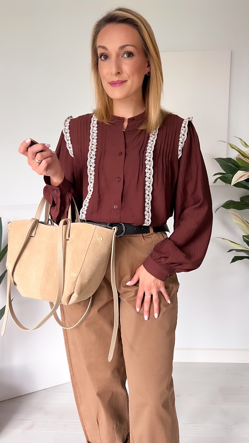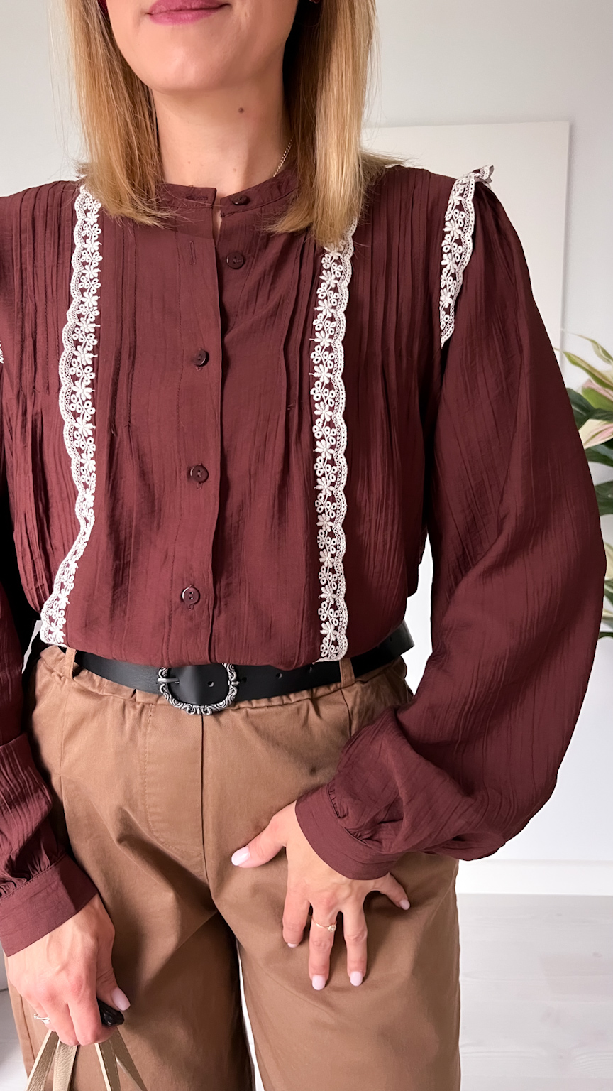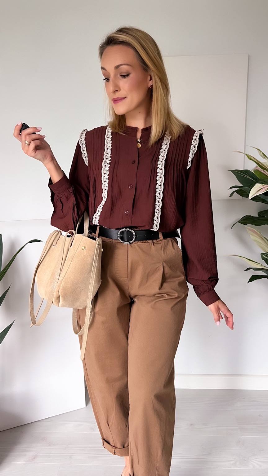 Czekoladowa koszula z koronkową lamówką – elegancja w jesiennym wydaniu