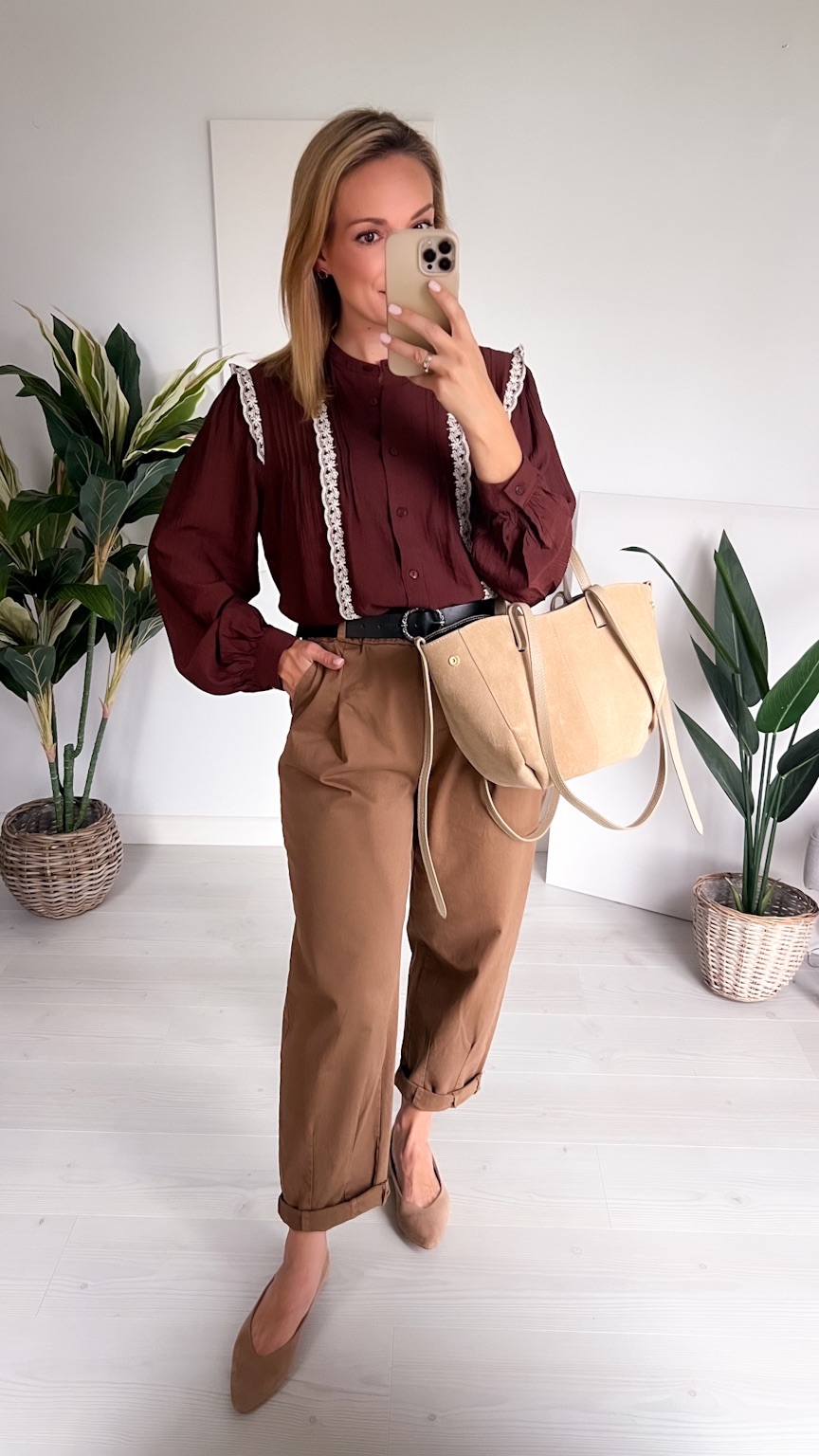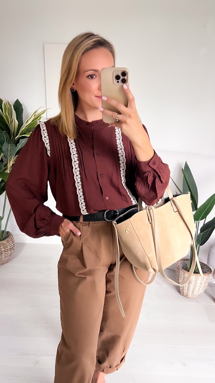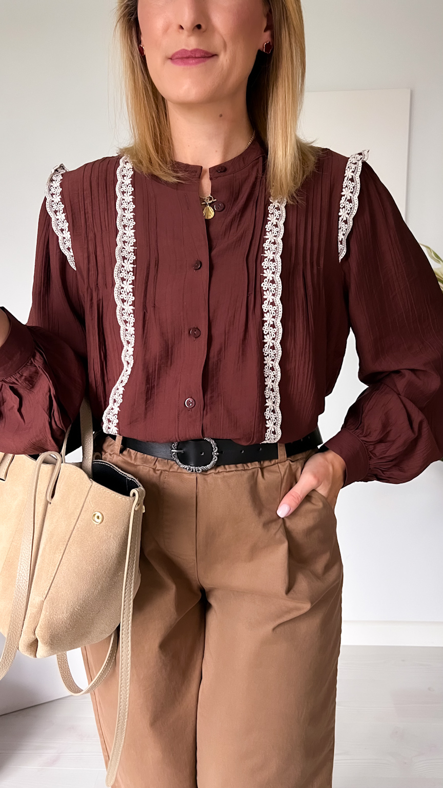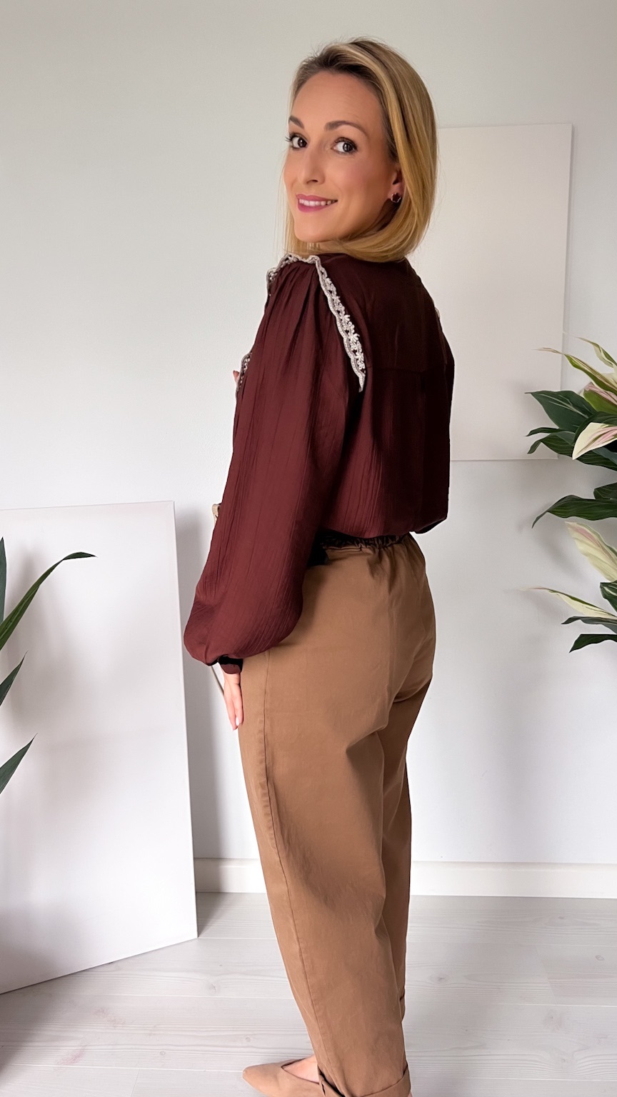 Czekoladowa koszula z koronkową lamówką – elegancja w jesiennym wydaniu