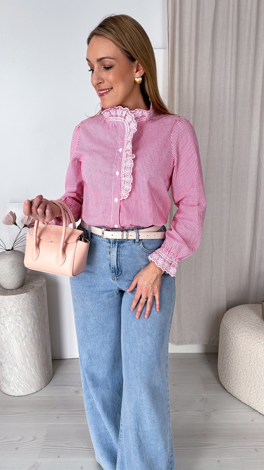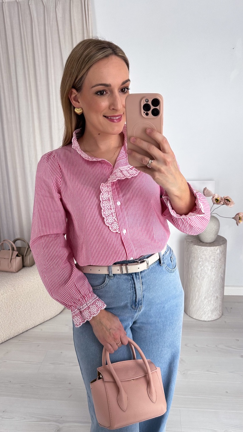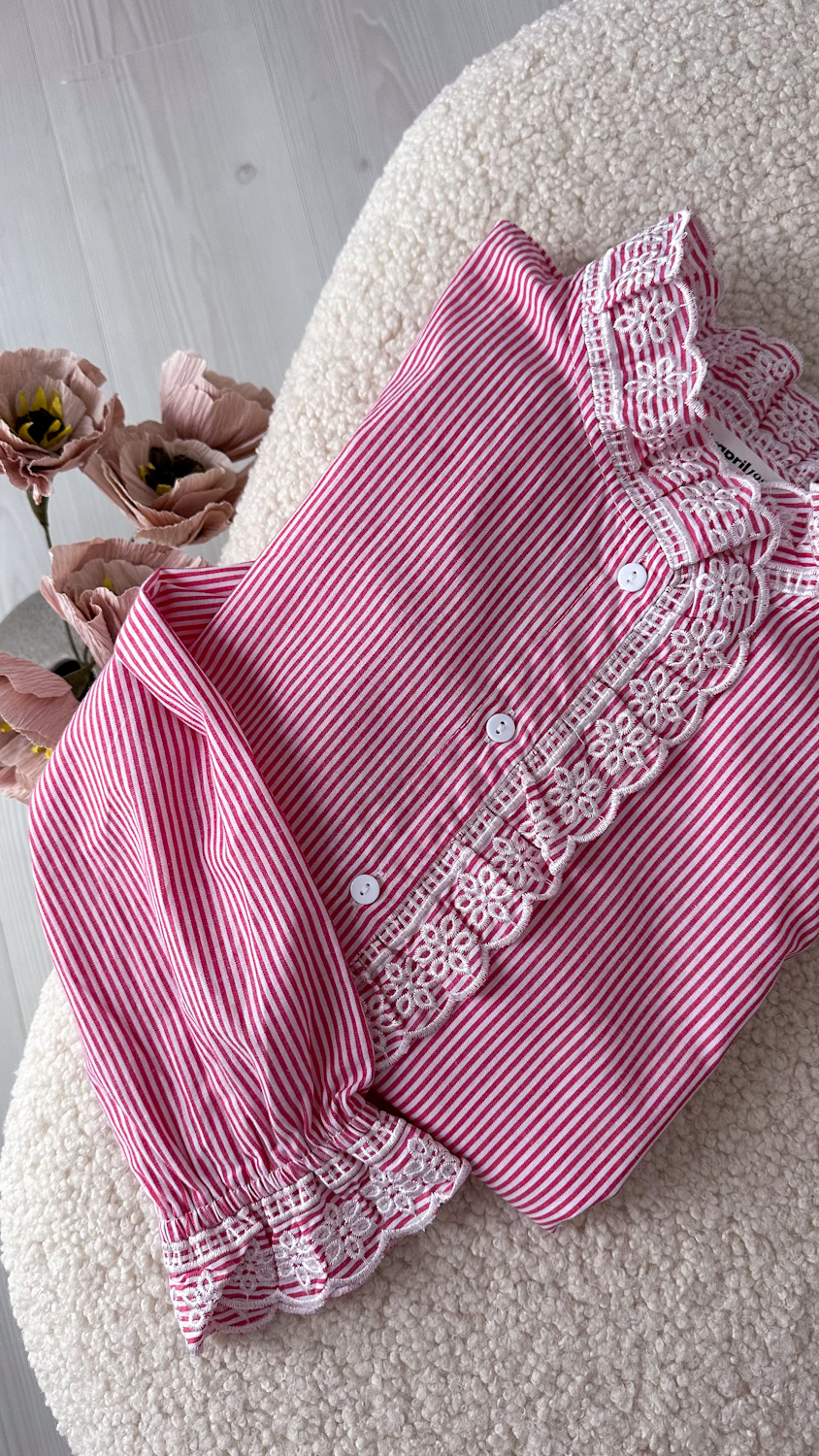 Bawełniana koszula w delikatne paski zachwyca subtelną elegancją i wyjątkowym wykończeniem. Model ze stójką oraz haftowanym żabotem biegnącym wzdłuż guzików nadaje całości romantycznego, a zarazem bardzo stylowego charakteru.