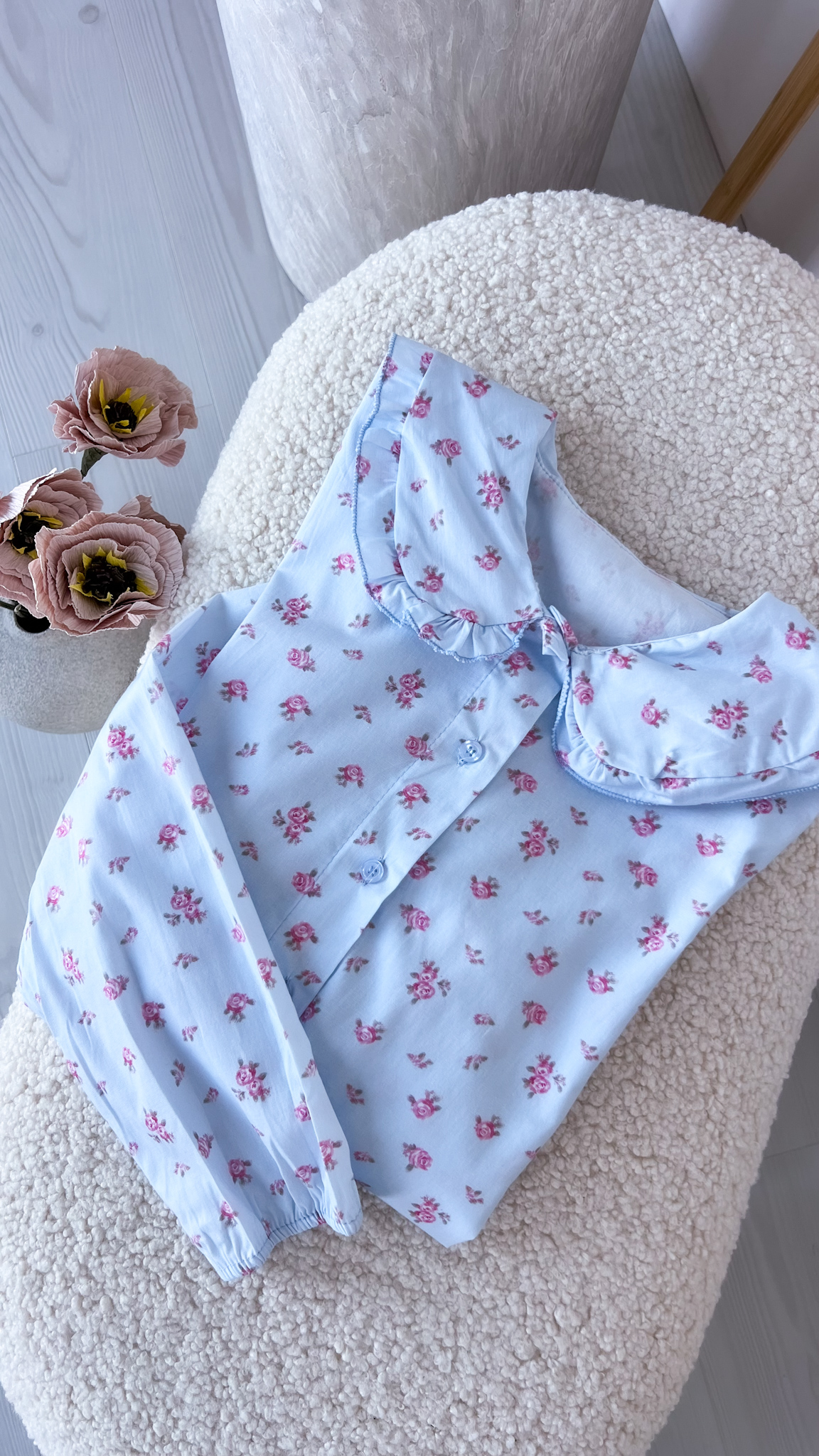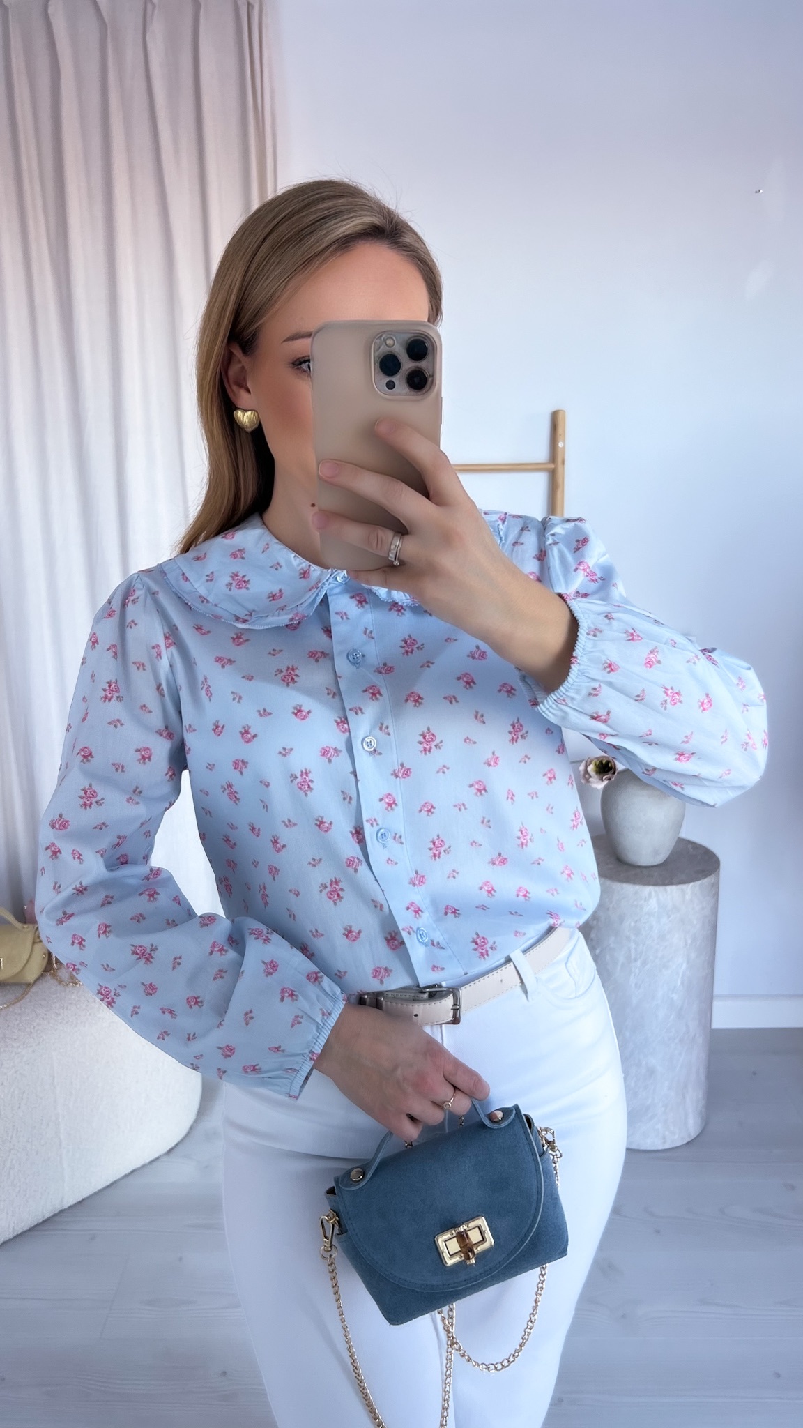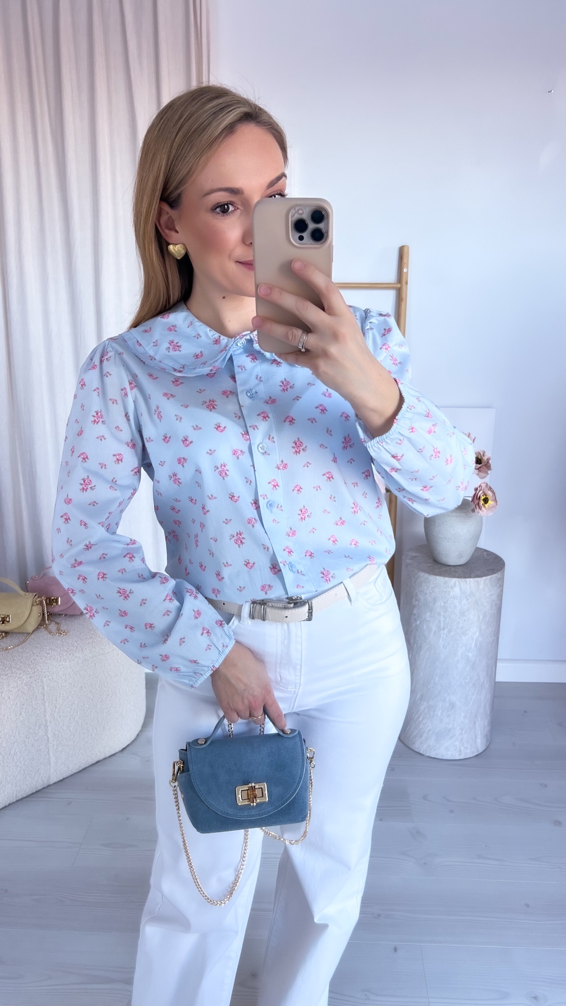 Koszula z dużym, efektownym kołnierzem w drobną łączkę to idealna propozycja na wiosnę dla kobiet, które lubią subtelne wzory i romantyczne detale. Delikatny print w kwiatową łączkę nadaje lekkości i świeżości stylizacji, a wyrazisty kołnierz pięknie podkreśla linię ramion i dodaje całości modowego charakteru.