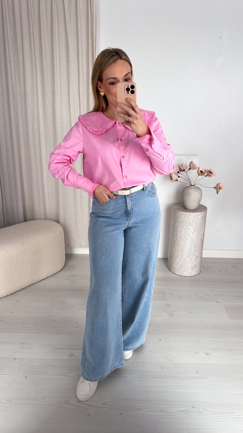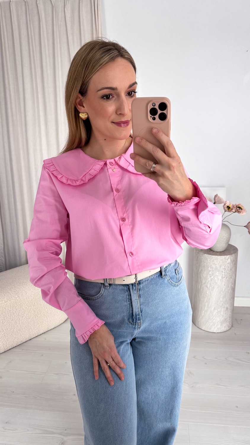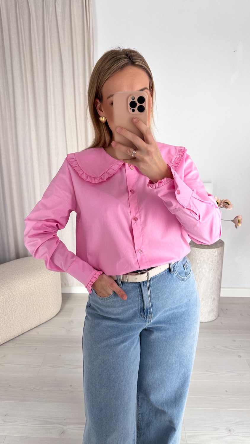 Ponadczasowa elegancja w wyjątkowym wydaniu! Klasyczna koszula z dużym, ozdobnym kołnierzem wykończonym falbanką to model, który przyciąga spojrzenia i nadaje stylizacjom romantycznego charakteru.