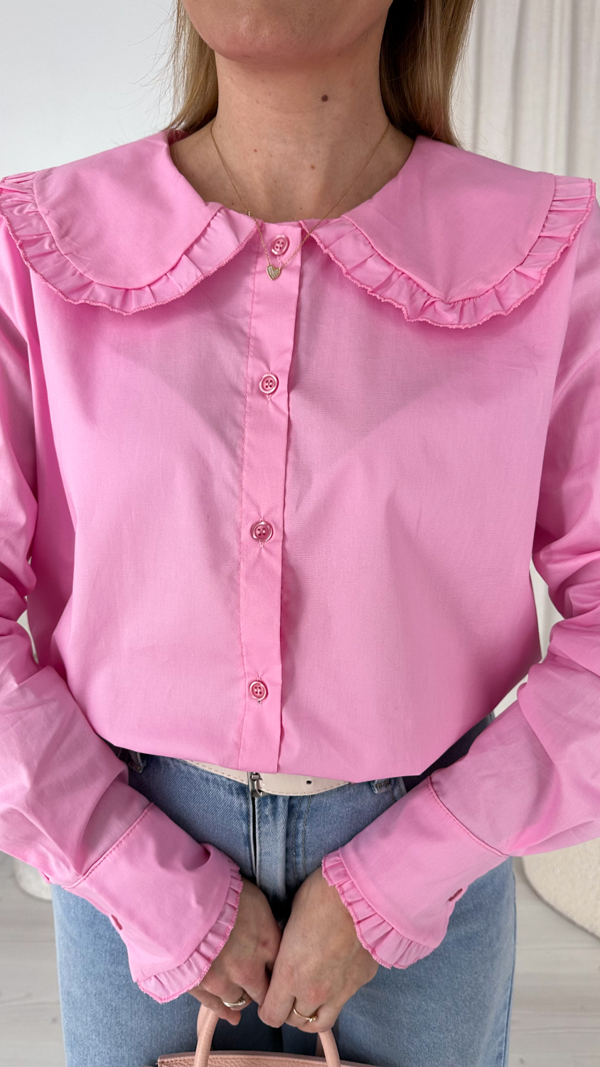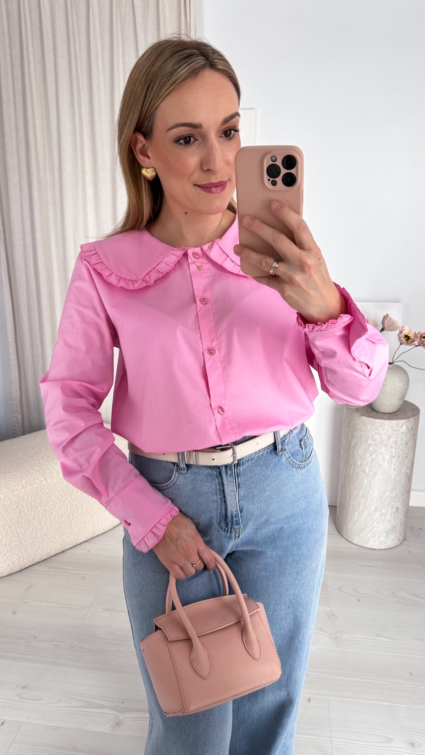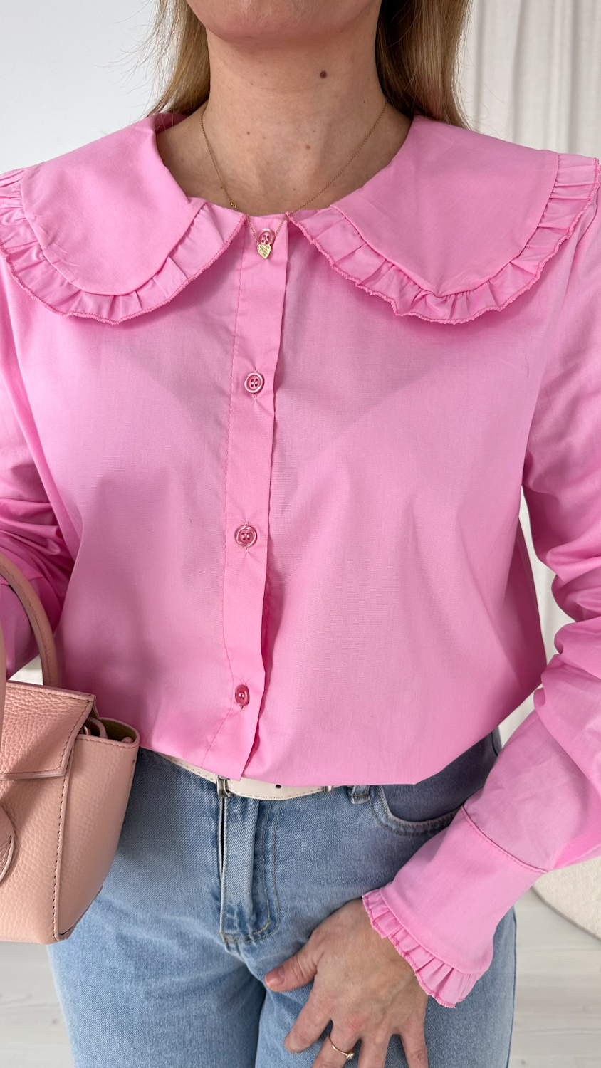Ponadczasowa elegancja w wyjątkowym wydaniu! Klasyczna koszula z dużym, ozdobnym kołnierzem wykończonym falbanką to model, który przyciąga spojrzenia i nadaje stylizacjom romantycznego charakteru.