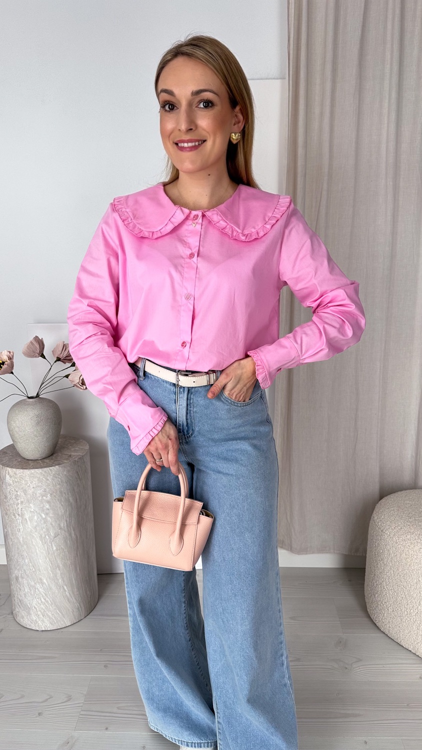 Efektowny kołnierz pięknie podkreśla linię szyi i stanowi główną ozdobę koszuli. Rękawy zakończone mankietem również zostały wykończone subtelną falbanką, co tworzy spójną, niezwykle kobiecą całość. To detal, który dodaje lekkości i wyjątkowości nawet najprostszym zestawieniom.