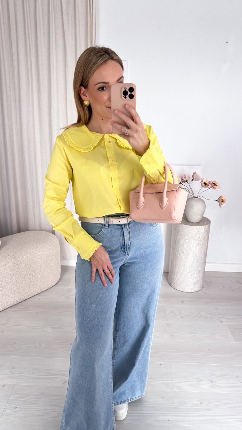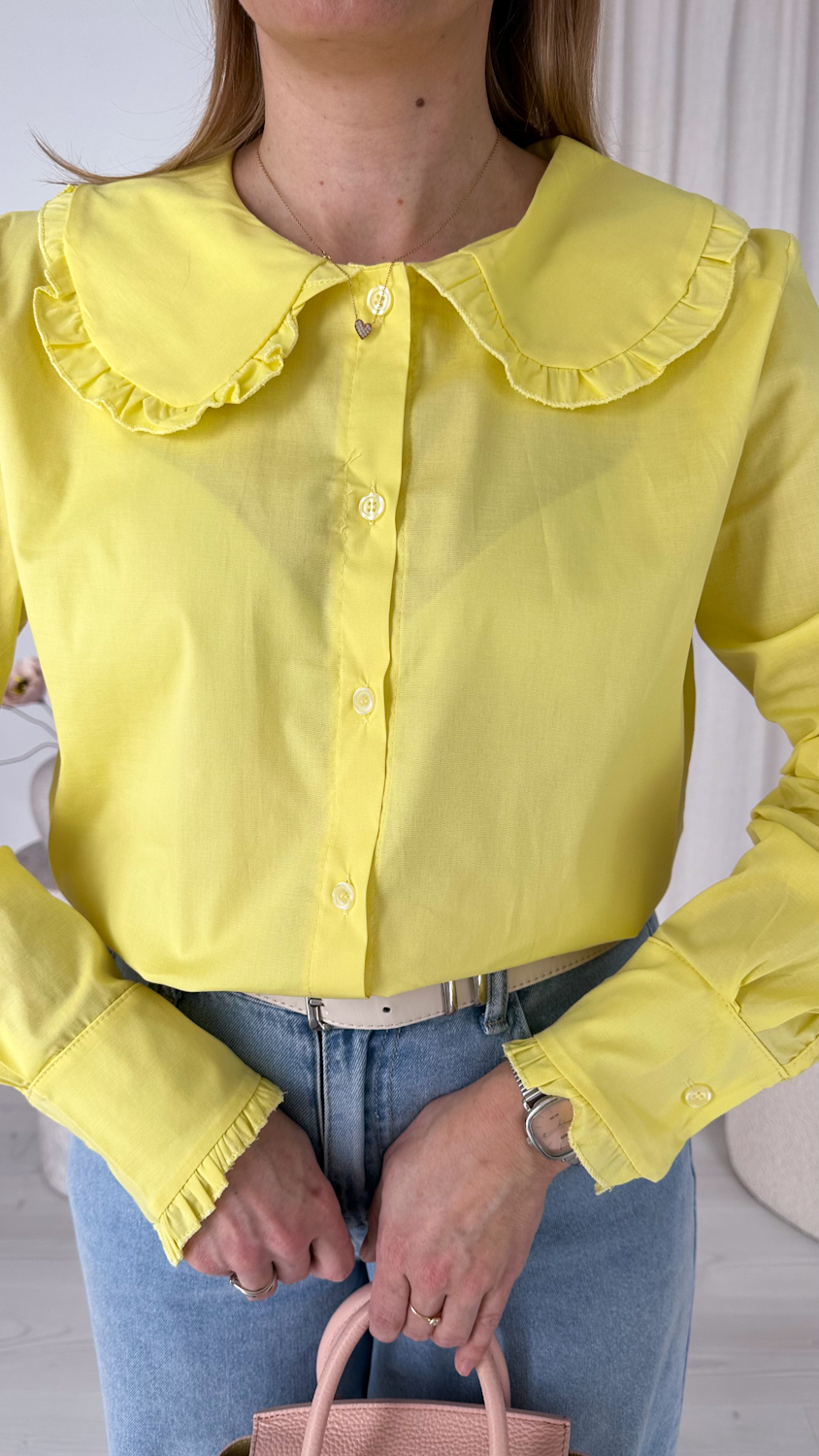 Ponadczasowa elegancja w wyjątkowym wydaniu! Klasyczna koszula z dużym, ozdobnym kołnierzem wykończonym falbanką to model, który przyciąga spojrzenia i nadaje stylizacjom romantycznego charakteru.