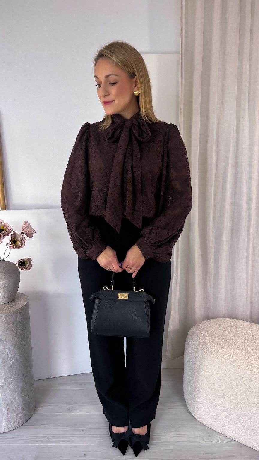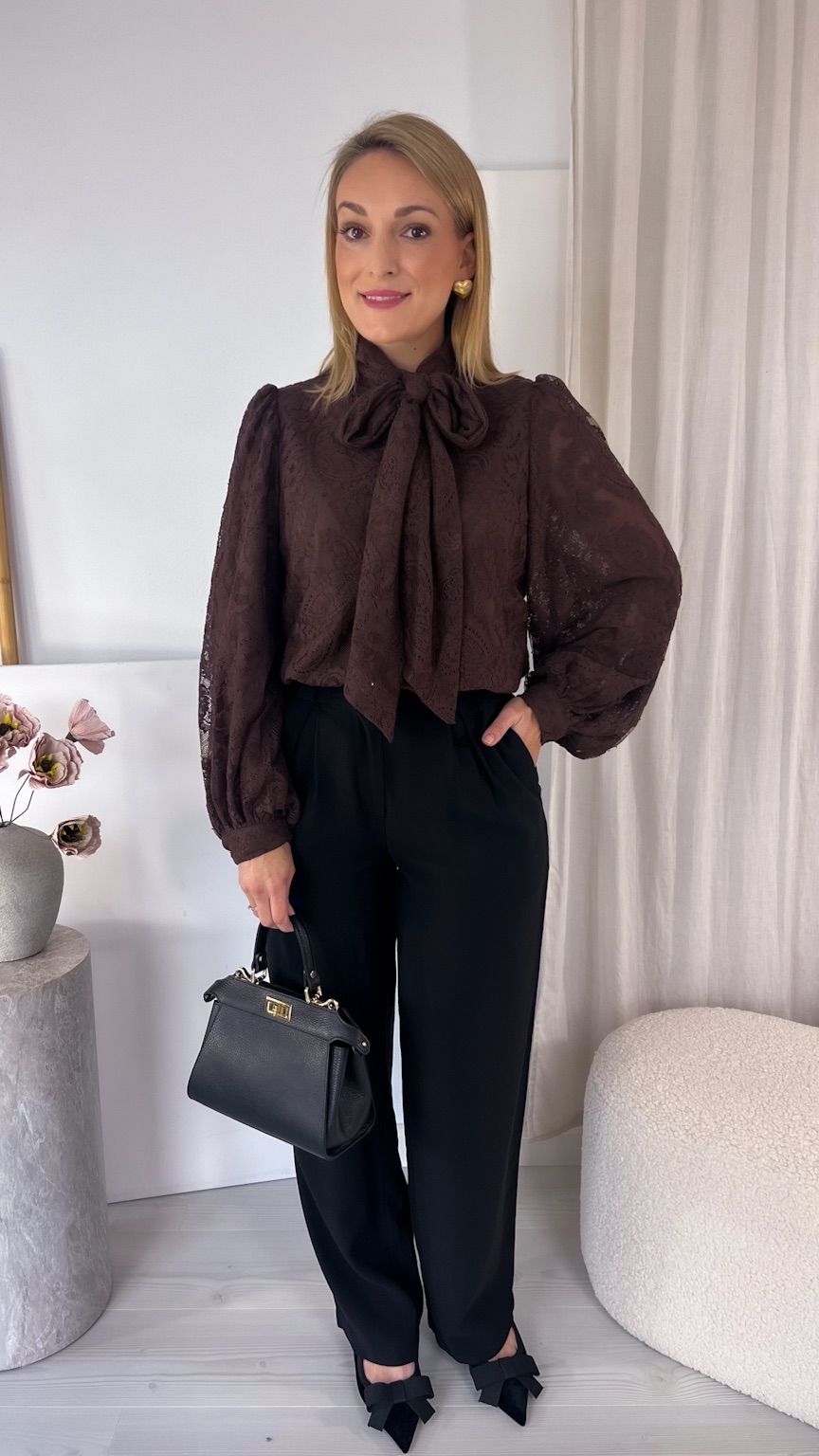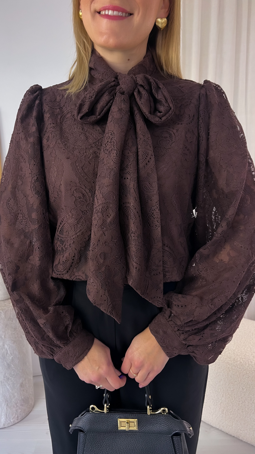 Piękna koszula koronkowa wiązana pod szyją to wyjątkowy model, który przyciąga uwagę swoją finezją i elegancją. Wykonana z delikatnej, misternie tkanej koronki, zachwyca subtelnym wzorem i lekkością materiału. Jej najbardziej efektownym elementem jest duża, dekoracyjna kokarda pod szyją, która nadaje całości wyrafinowanego, kobiecego charakteru.
