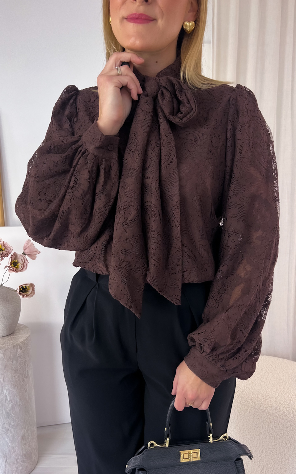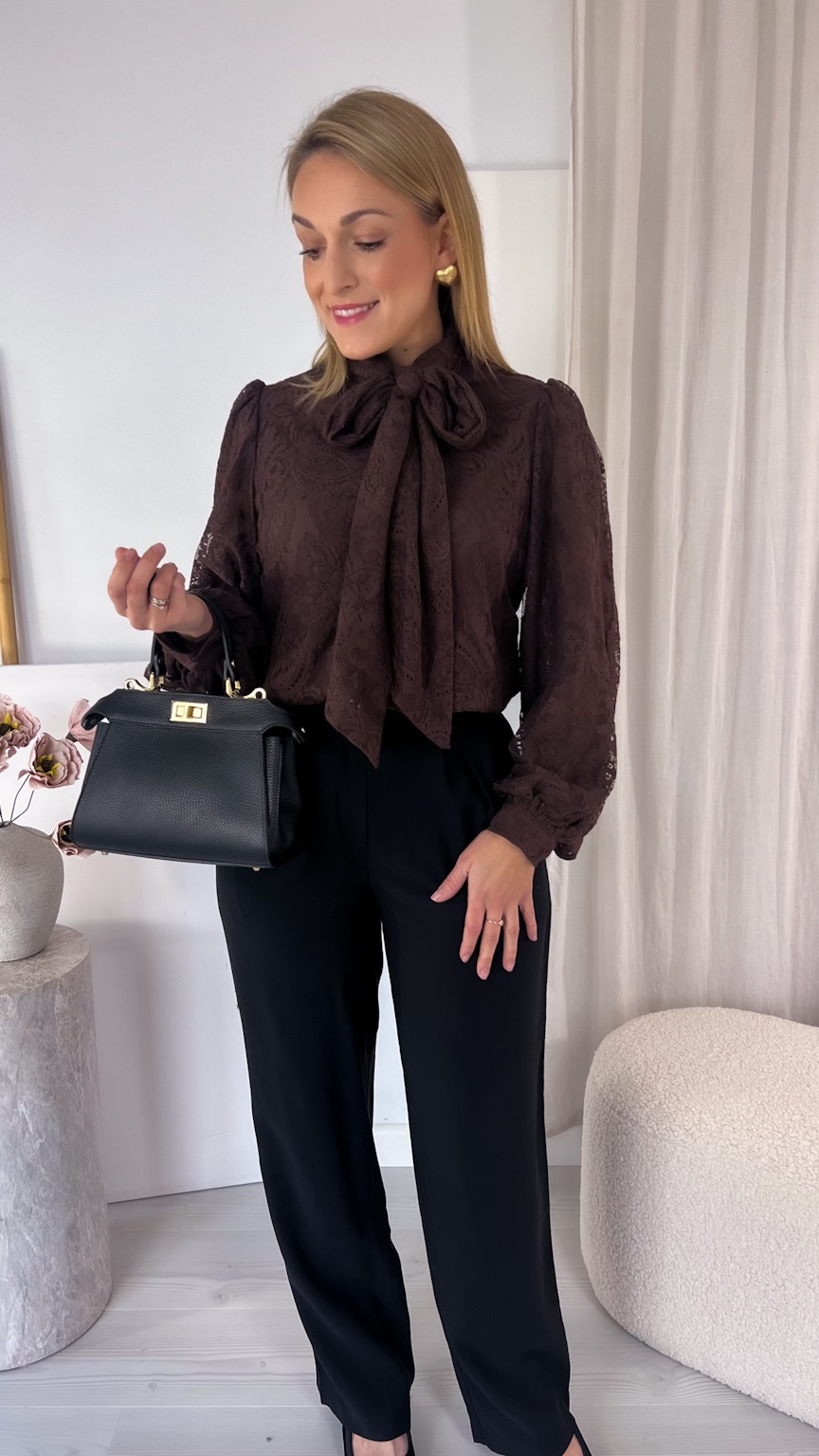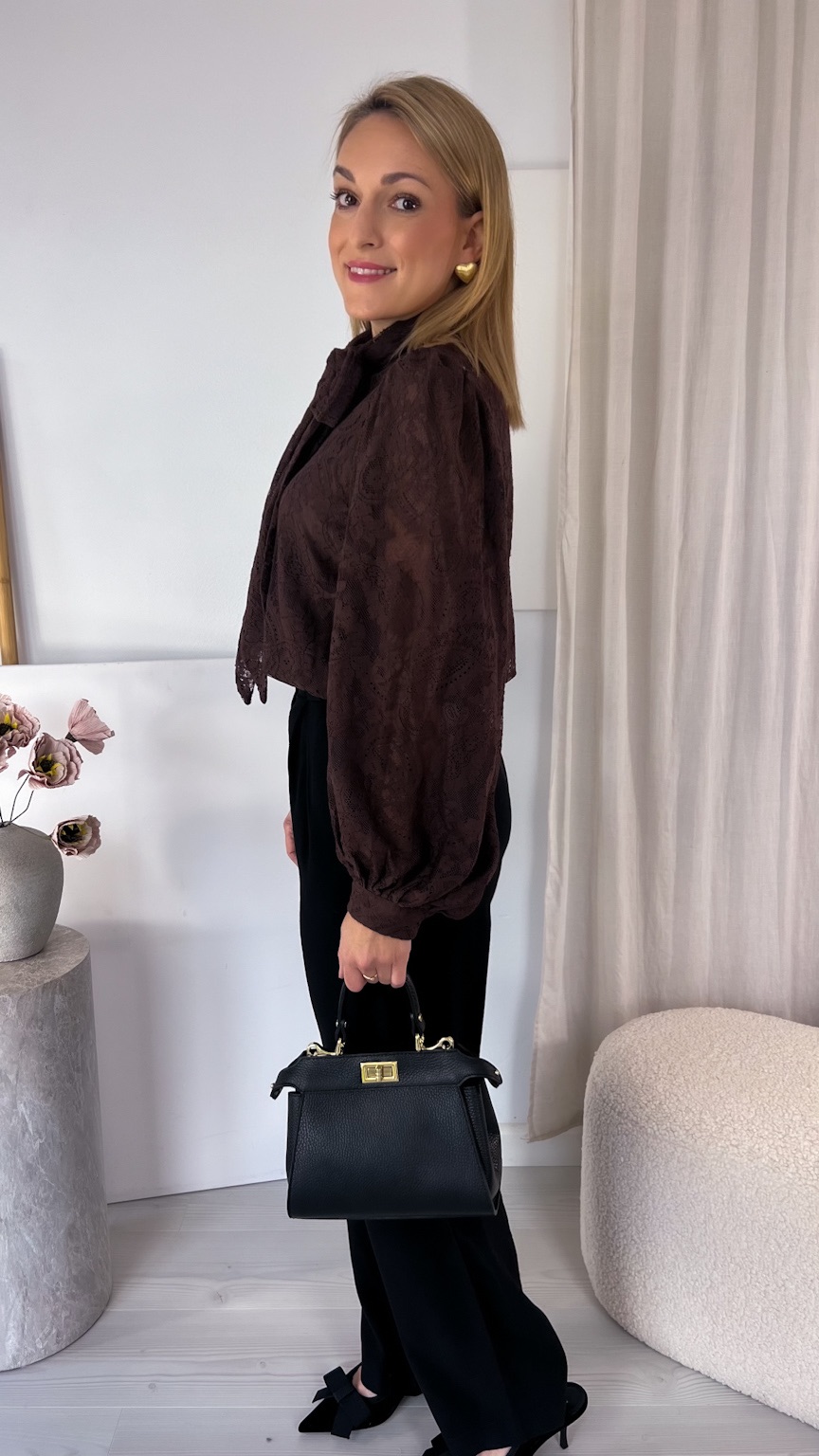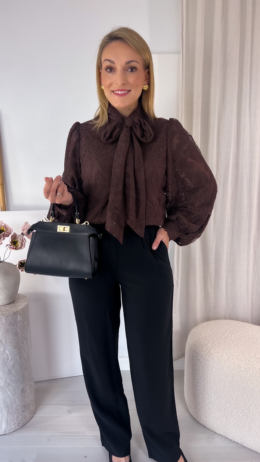 Piękna koszula koronkowa wiązana pod szyją to wyjątkowy model, który przyciąga uwagę swoją finezją i elegancją. Wykonana z delikatnej, misternie tkanej koronki, zachwyca subtelnym wzorem i lekkością materiału. Jej najbardziej efektownym elementem jest duża, dekoracyjna kokarda pod szyją, która nadaje całości wyrafinowanego, kobiecego charakteru.