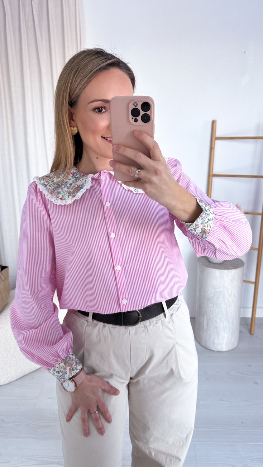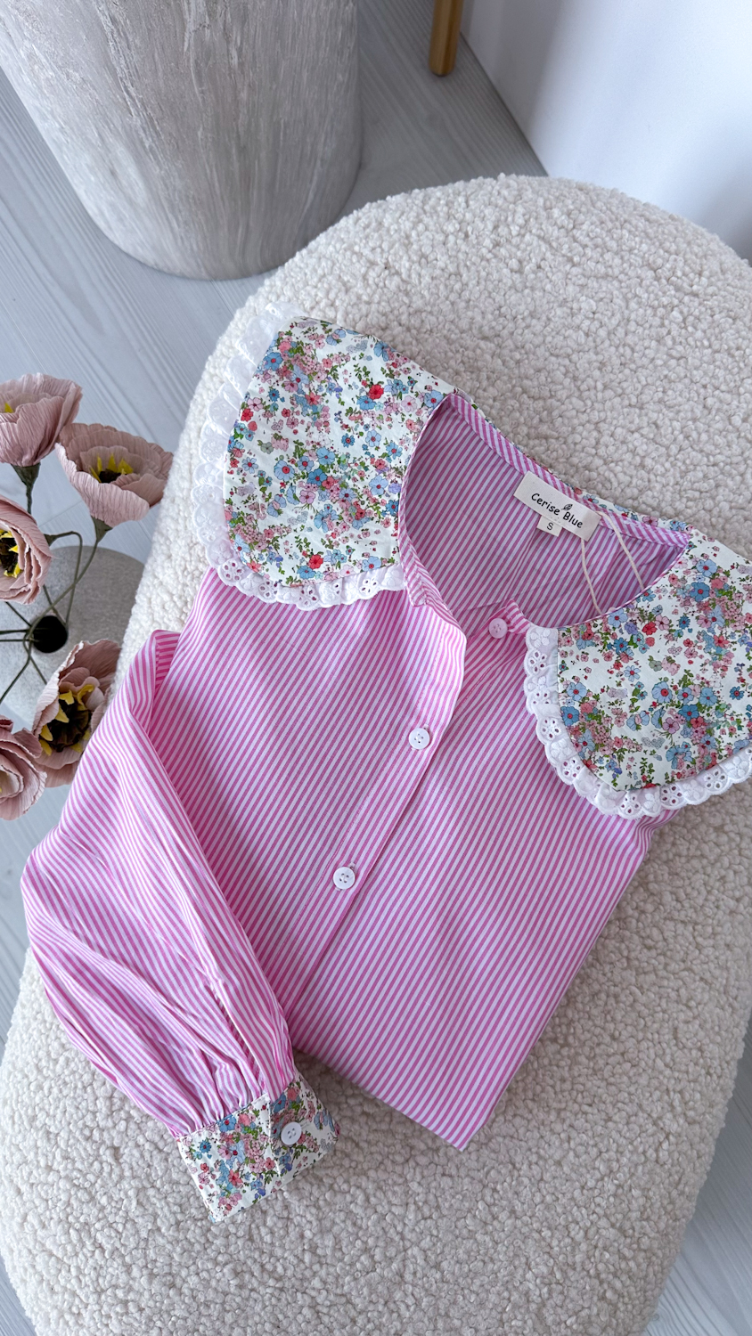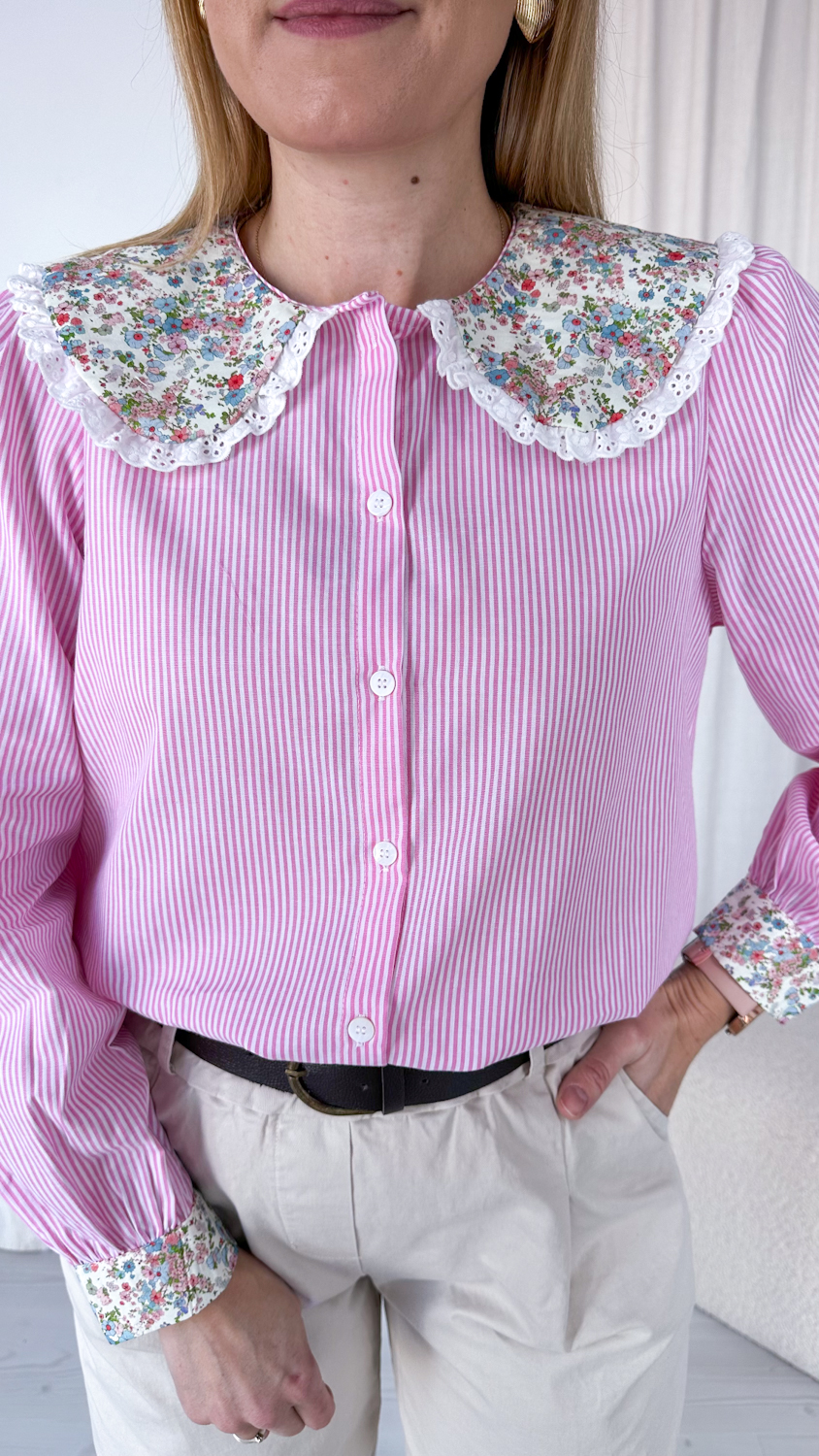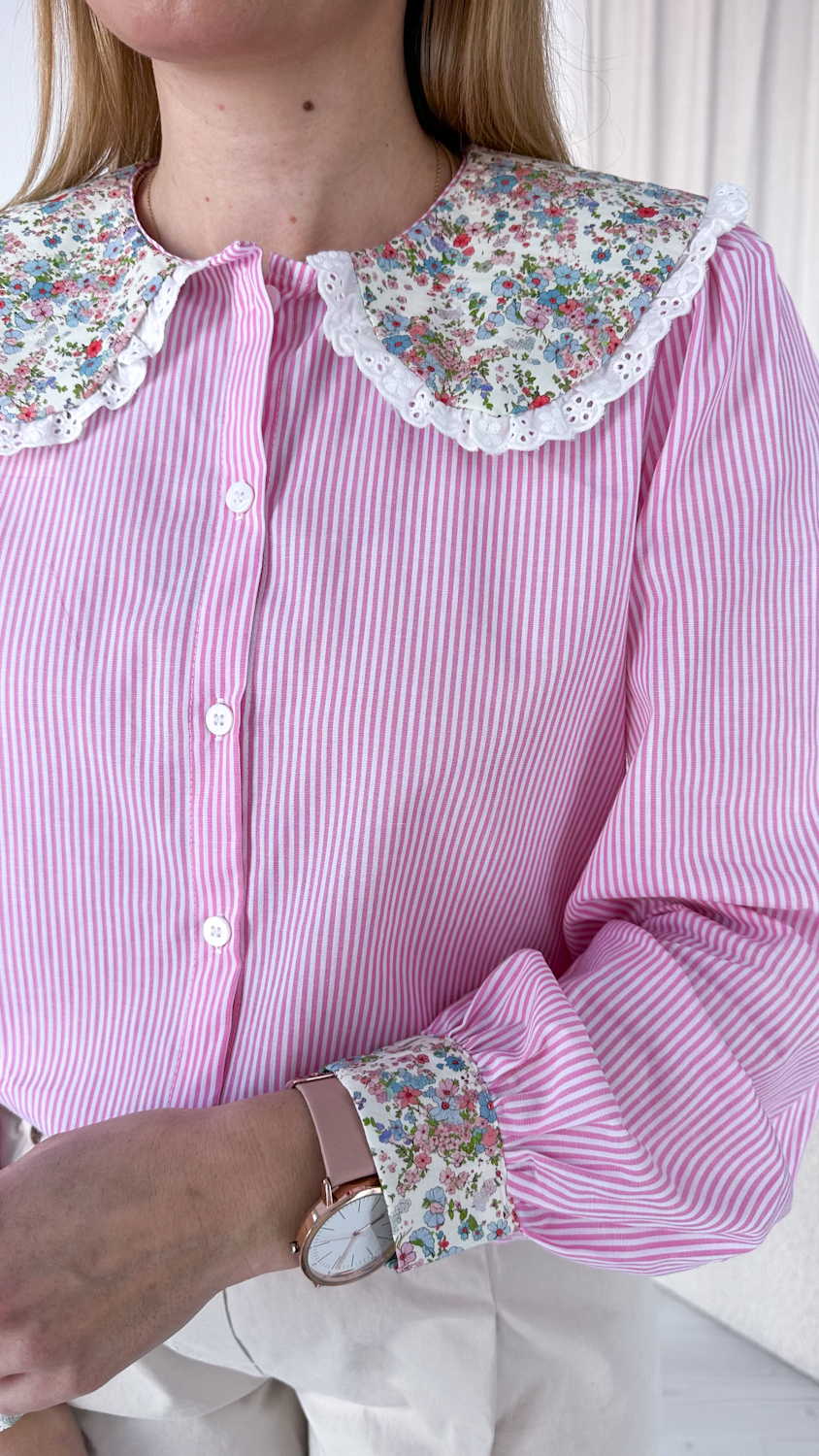 Wyjątkowa bawełniana koszula w paseczki to idealna propozycja dla miłośniczek oryginalnych detali i świeżych, wiosennych stylizacji. Uszyta z wysokiej jakości, oddychającej bawełny, zachwyca nie tylko komfortem noszenia, ale też niezwykle efektownym designem. Klasyczne paseczki pięknie kontrastują z dużym, dekoracyjnym kołnierzem w motyw kolorowej łączki, który dodaje całości artystycznego charakteru i subtelnej romantyczności. To model, który przyciąga spojrzenia i nadaje stylizacji lekkości oraz wyjątkowego wyrazu — idealny zarówno do jeansów, jak i spódnic czy eleganckich spodni. Stworzona z myślą o wiośnie, ale zachwyci przez cały sezon ✨