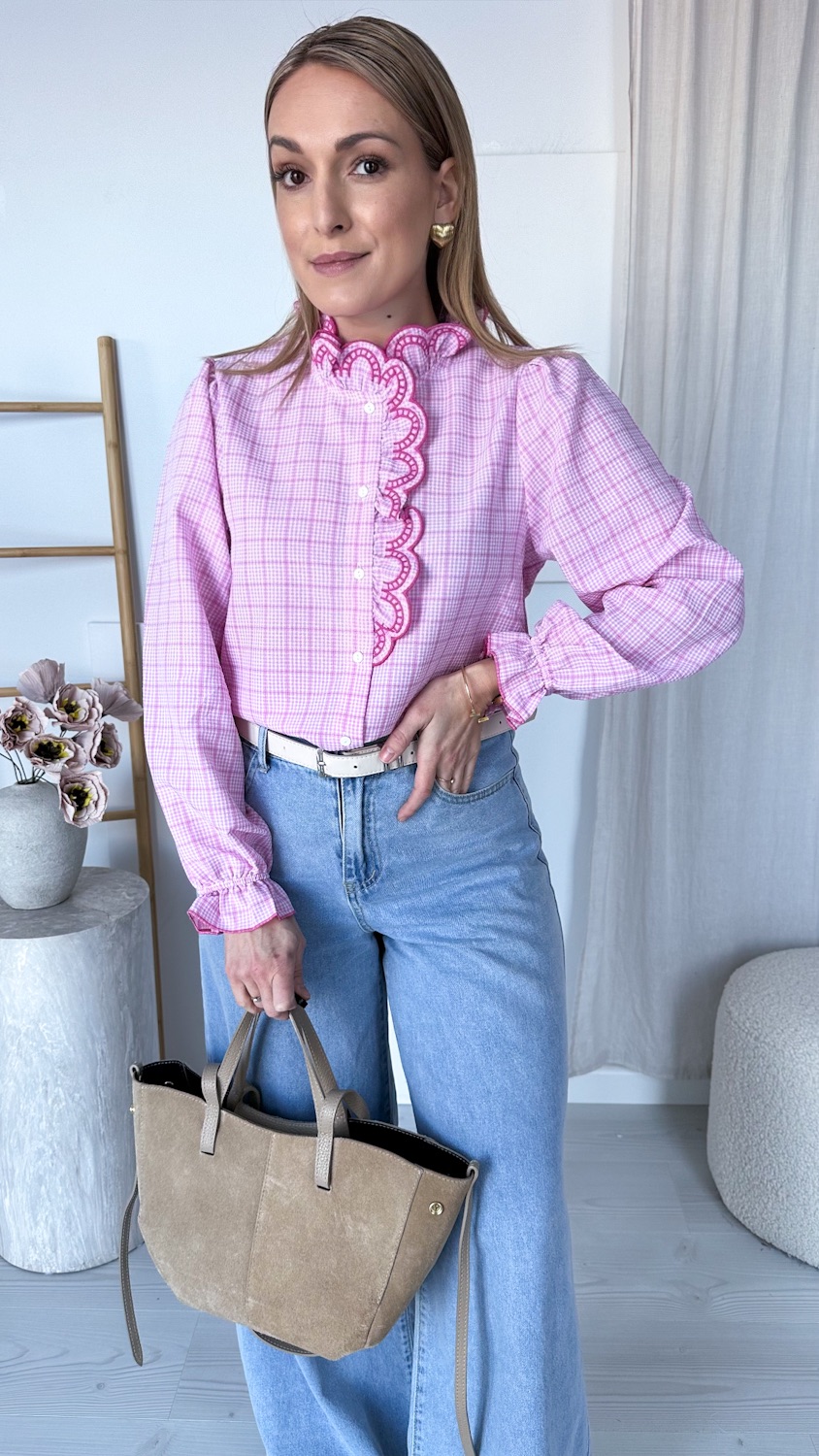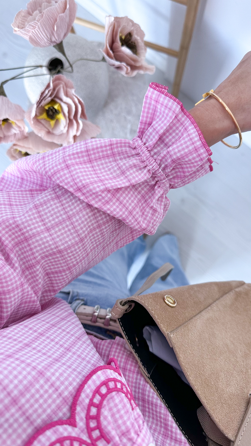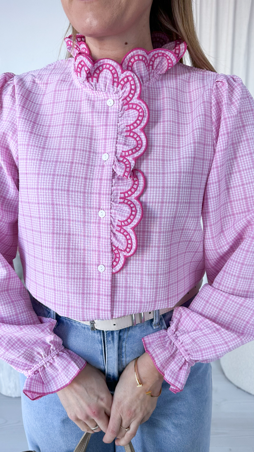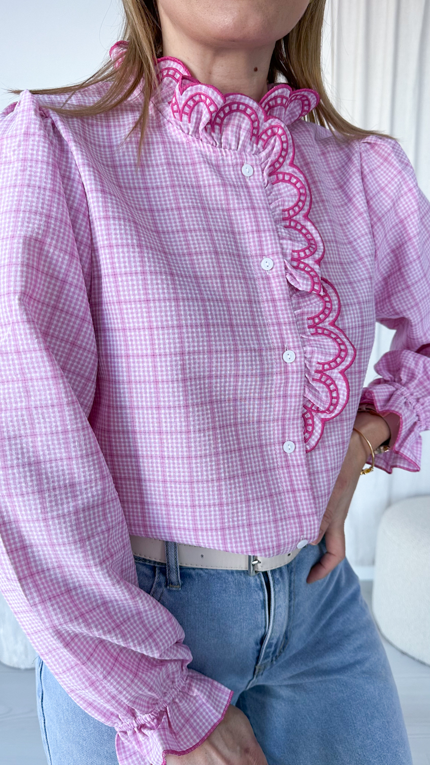 Koszula w różową kratę z haftowaną stójką to model, który zachwyca od pierwszego spojrzenia. Klasyczny wzór kraty został tu przełamany eleganckimi detalami – ozdobną, haftowaną stójką oraz subtelną lamówką biegnącą wzdłuż guzików. To właśnie te wykończenia nadają koszuli wyjątkowego, dopracowanego charakteru.