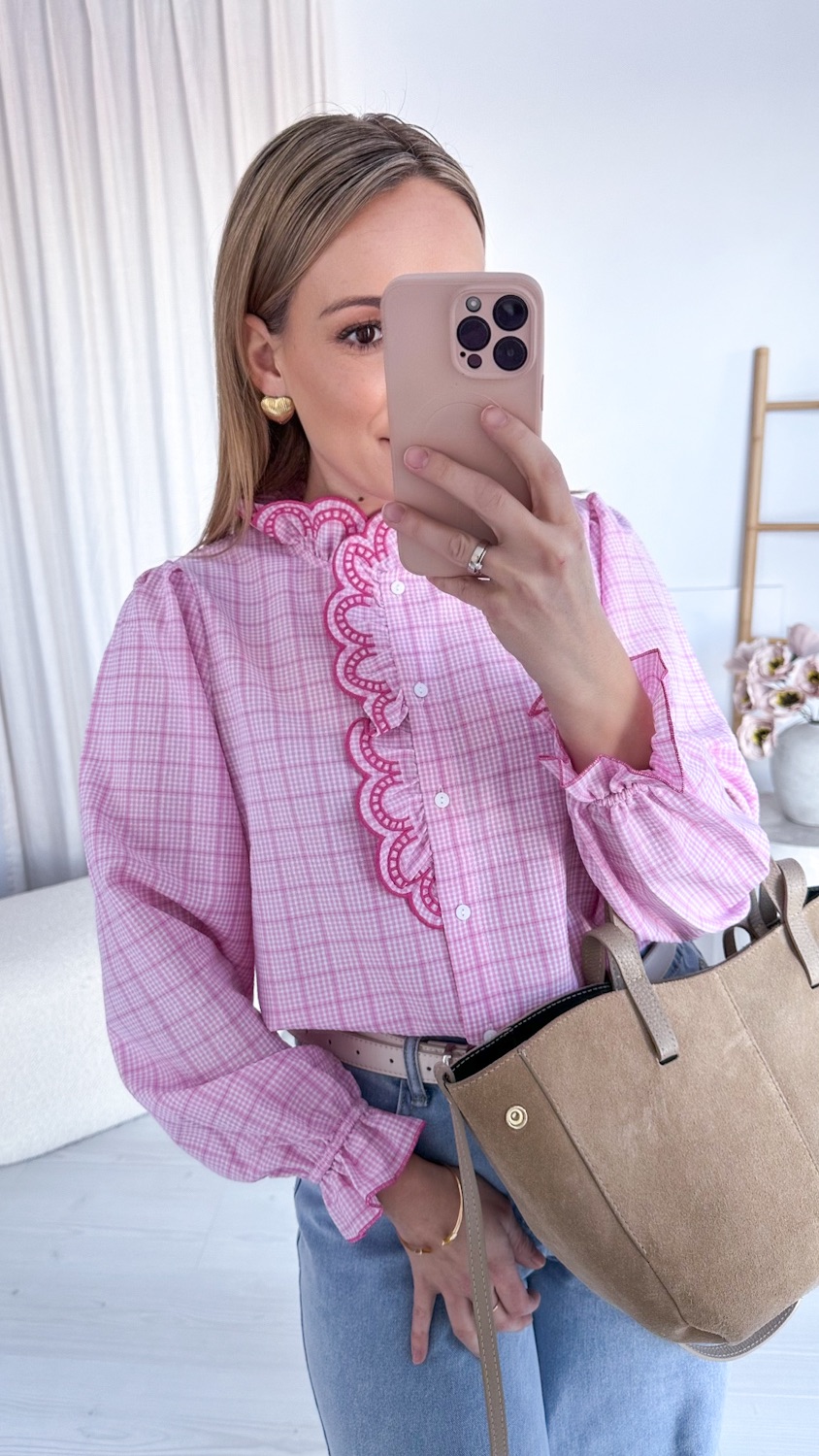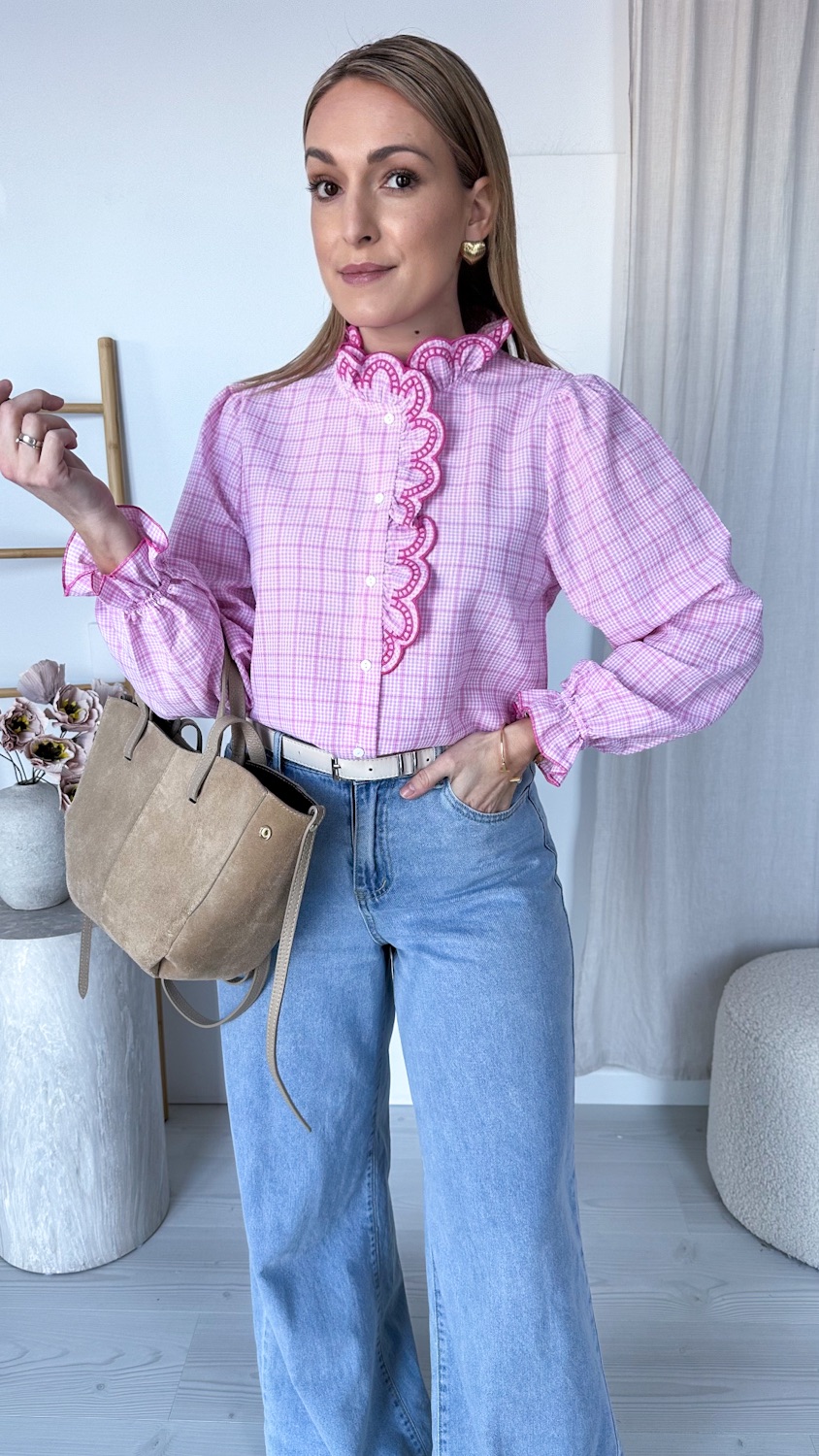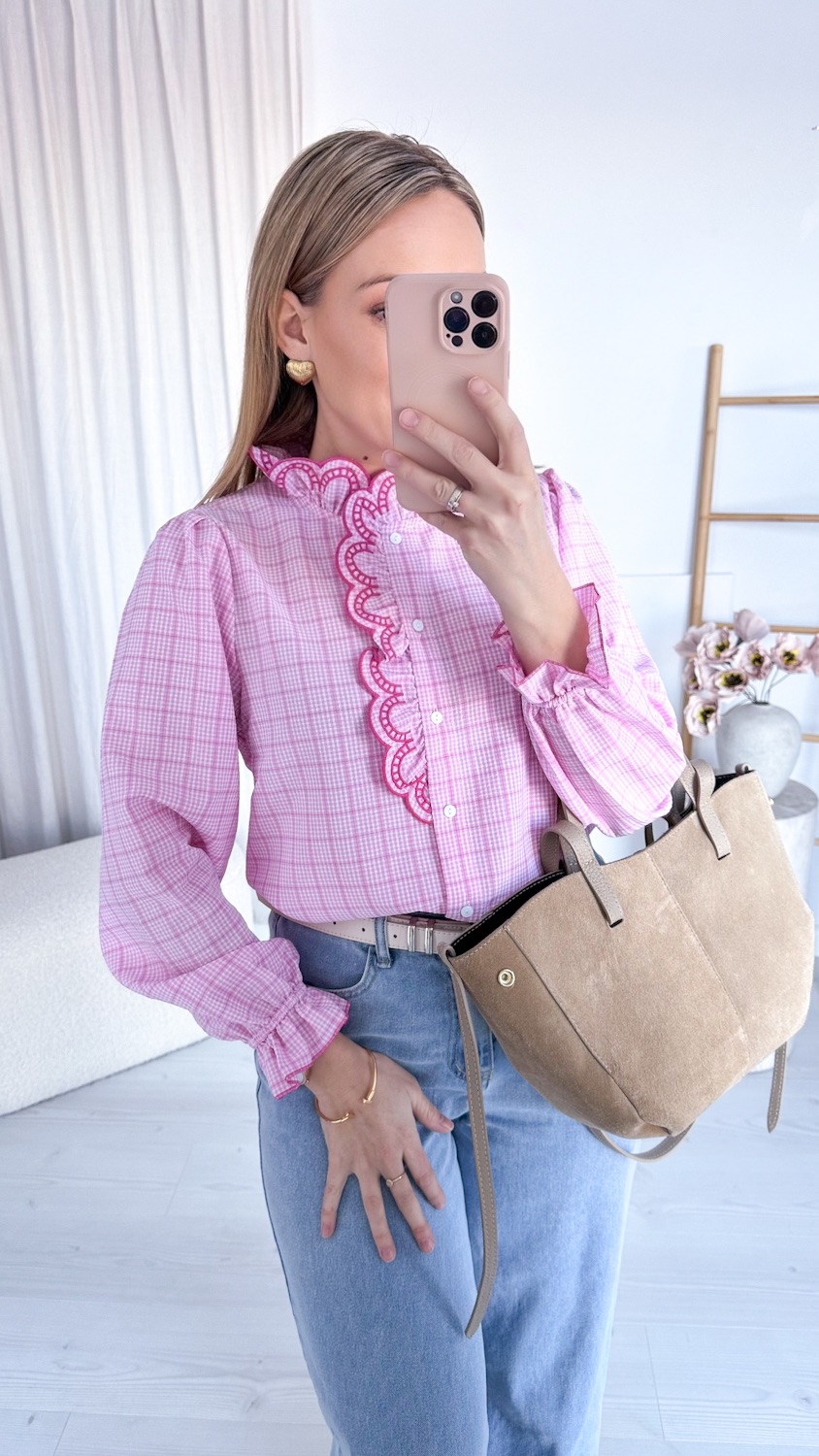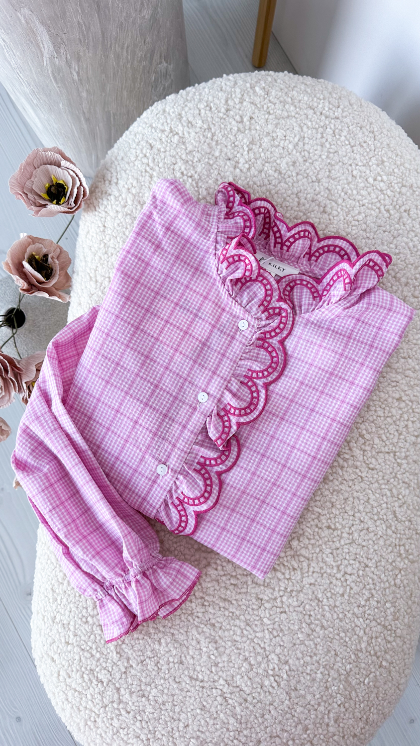 Koszula w różową kratę z haftowaną stójką to model, który zachwyca od pierwszego spojrzenia. Klasyczny wzór kraty został tu przełamany eleganckimi detalami – ozdobną, haftowaną stójką oraz subtelną lamówką biegnącą wzdłuż guzików. To właśnie te wykończenia nadają koszuli wyjątkowego, dopracowanego charakteru.