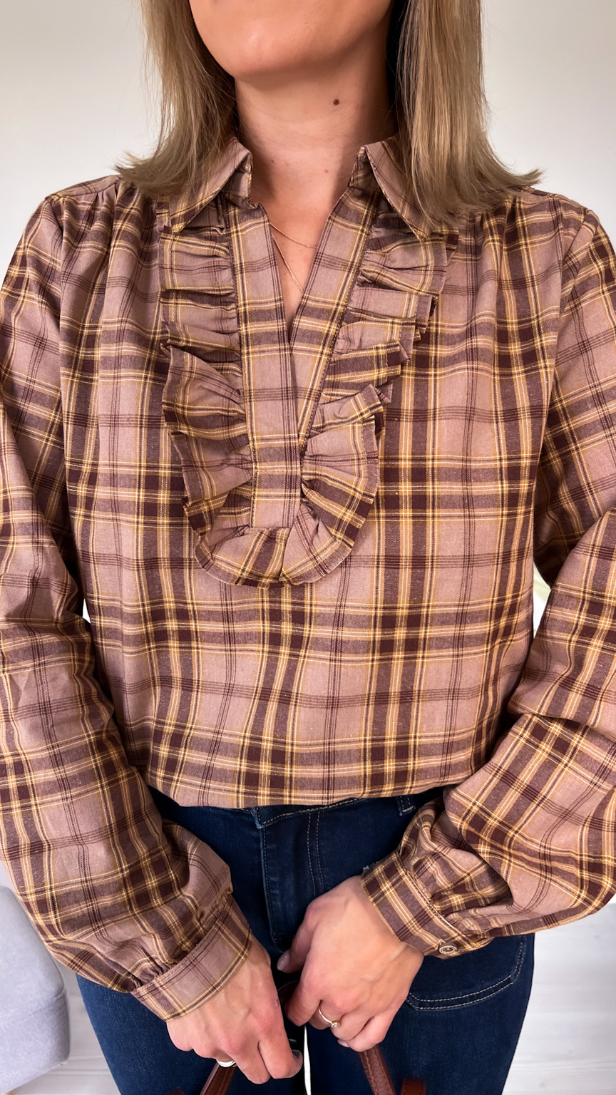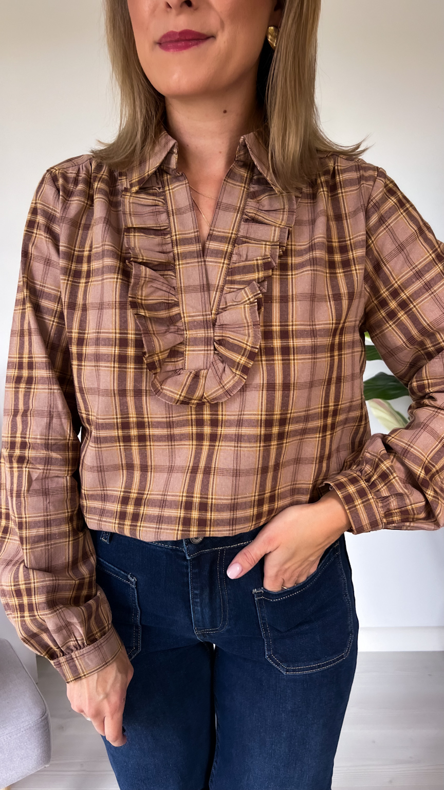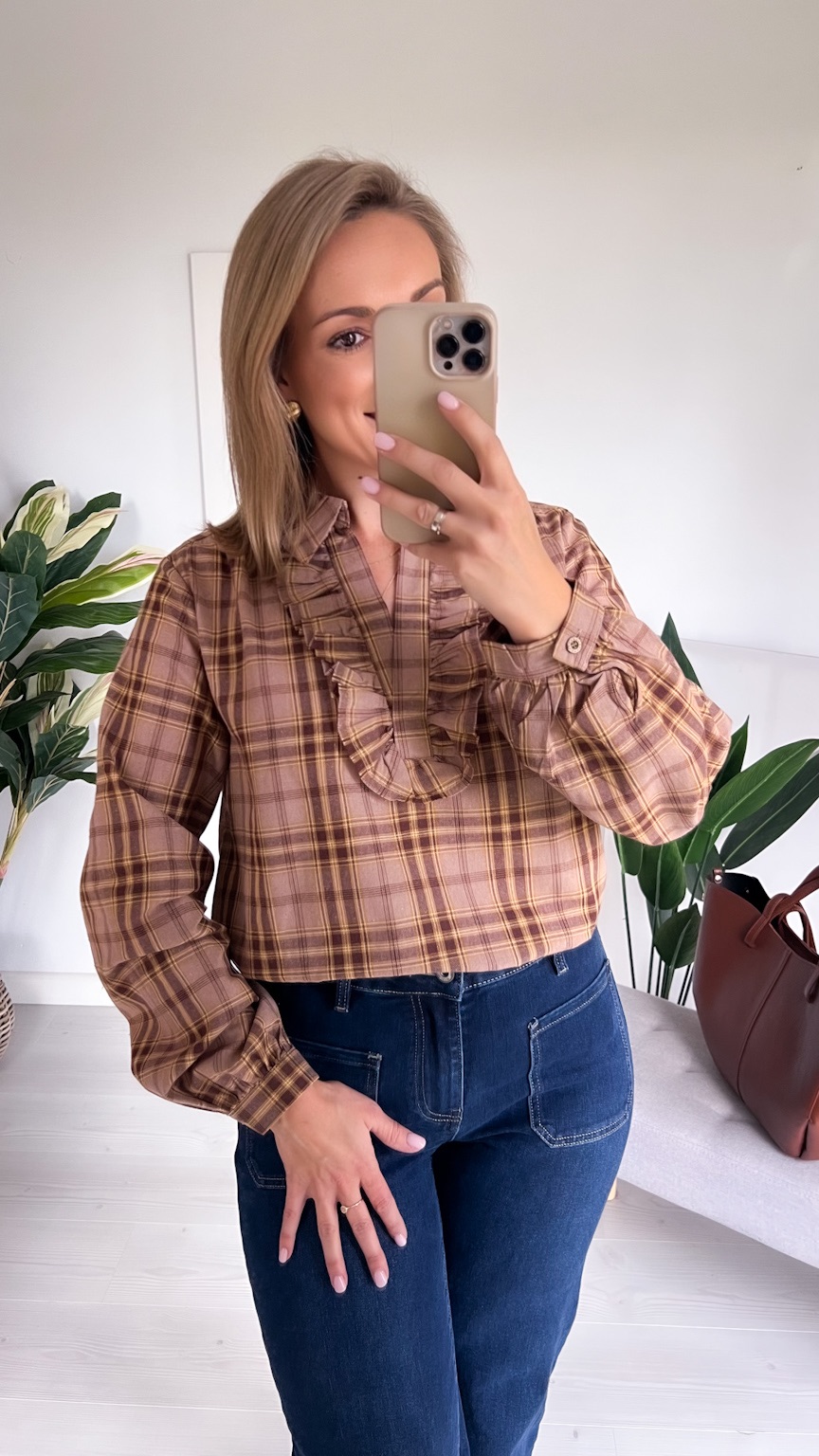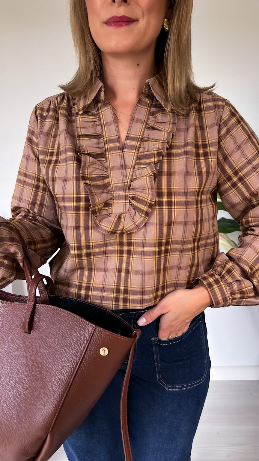Ta koszula zakładana przez głowę w kratę z pięknymi żabotami to wyjątkowe połączenie klasycznego wzoru i kobiecego detalu. Delikatne falbany przy dekolcie dodają jej subtelnej elegancji i romantycznego charakteru, a ponadczasowa krata w ciepłych odcieniach sprawia, że doskonale wpisuje się w klimat jesieni.