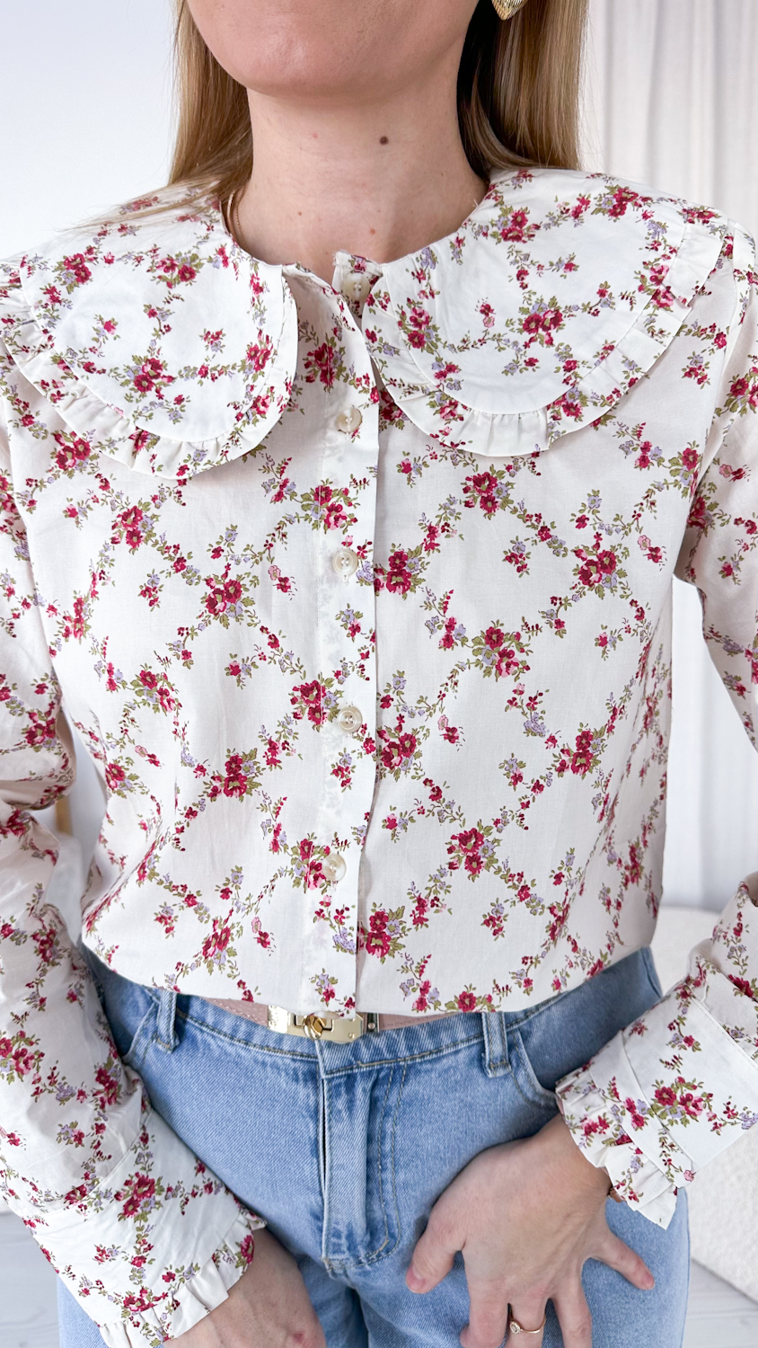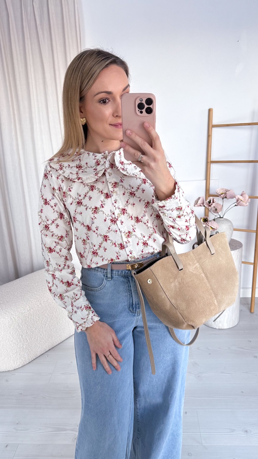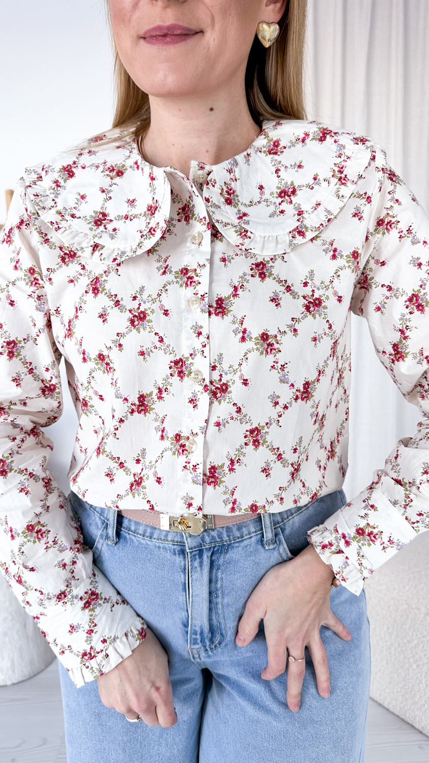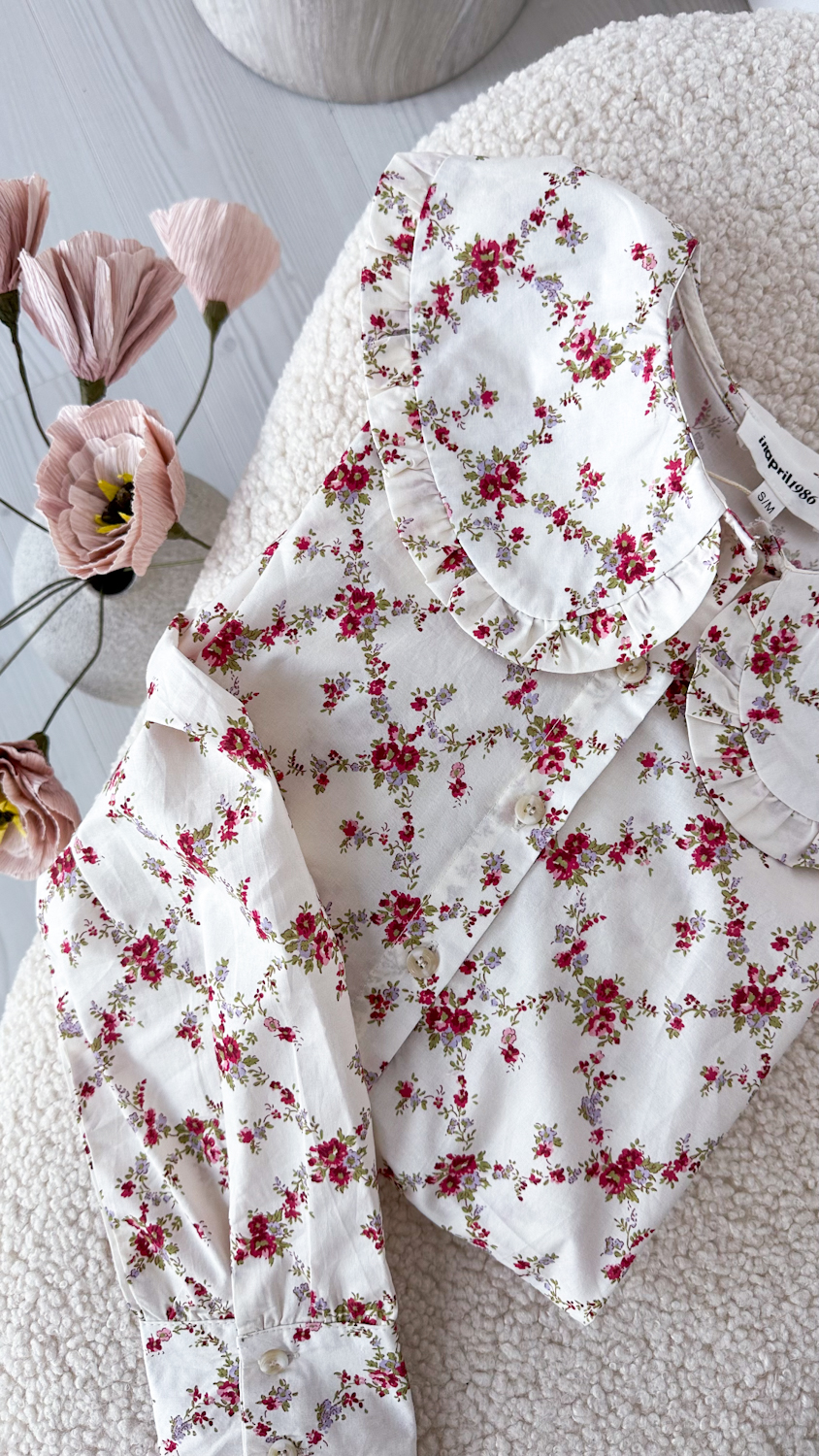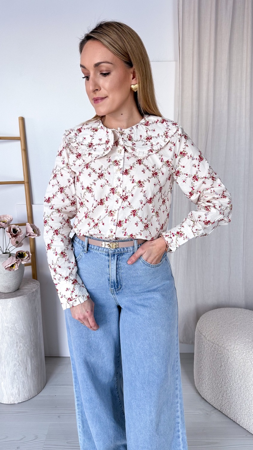 Bawełniana koszula z dużym kołnierzem wykończonym falbanką w drobne kwiatuszki to kwintesencja kobiecego uroku i subtelnej elegancji. Wykonana z wysokiej jakości, naturalnej bawełny, zapewnia komfort noszenia i lekkość przez cały dzień. Uwagę przyciąga efektowny, duży kołnierz z romantyczną falbanką, ozdobiony delikatnym, kwiatowym motywem, który dodaje koszuli świeżości i wiosennego charakteru. To model idealny do stylizacji pełnych lekkości — pięknie komponuje się z jeansami, spódnicami czy eleganckimi spodniami, tworząc look pełen wdzięku i ponadczasowego stylu. Niezwykle efektowna, a jednocześnie delikatna — stworzona dla kobiet, które kochają detale 🌷