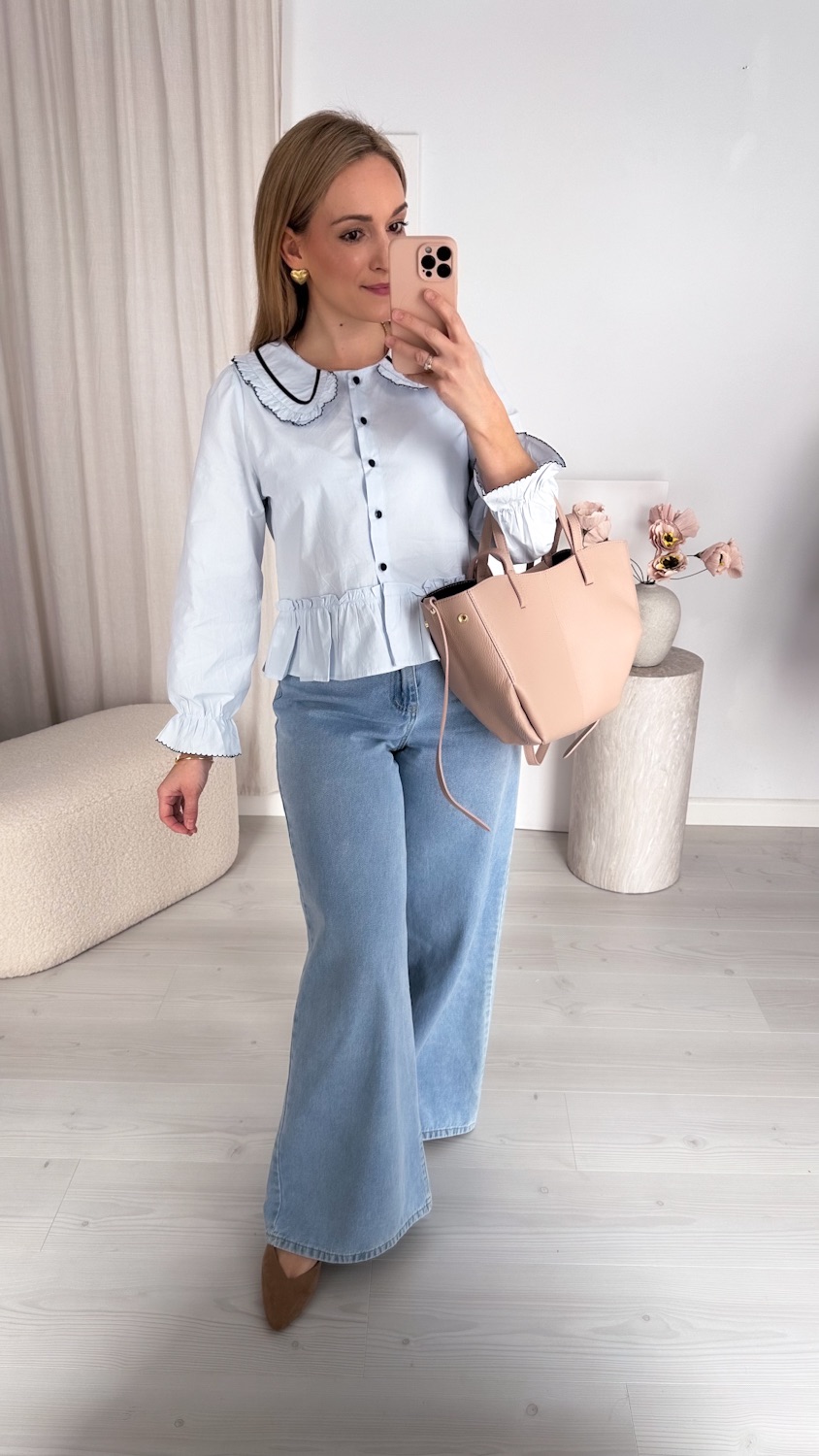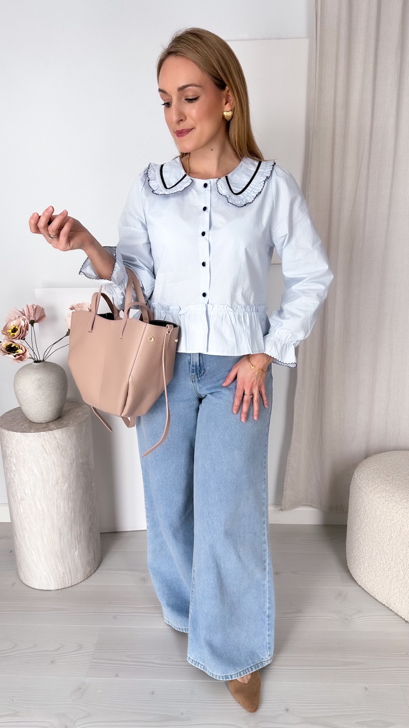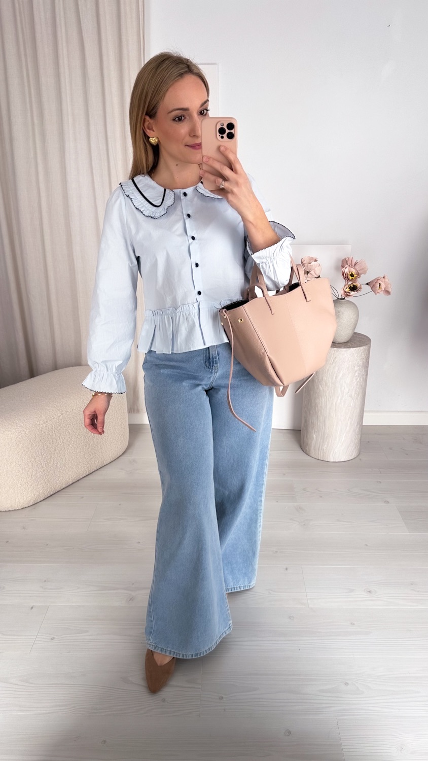 Błękitna koszula z baskinką to wyjątkowy model, który łączy elegancję z romantycznym stylem. Delikatny, świeży odcień błękitu dodaje lekkości, a dopracowany krój pięknie podkreśla sylwetkę.
