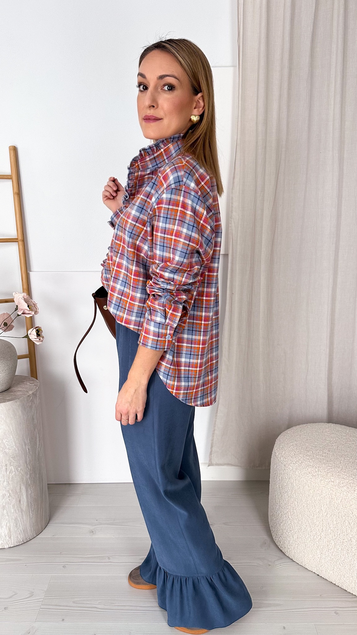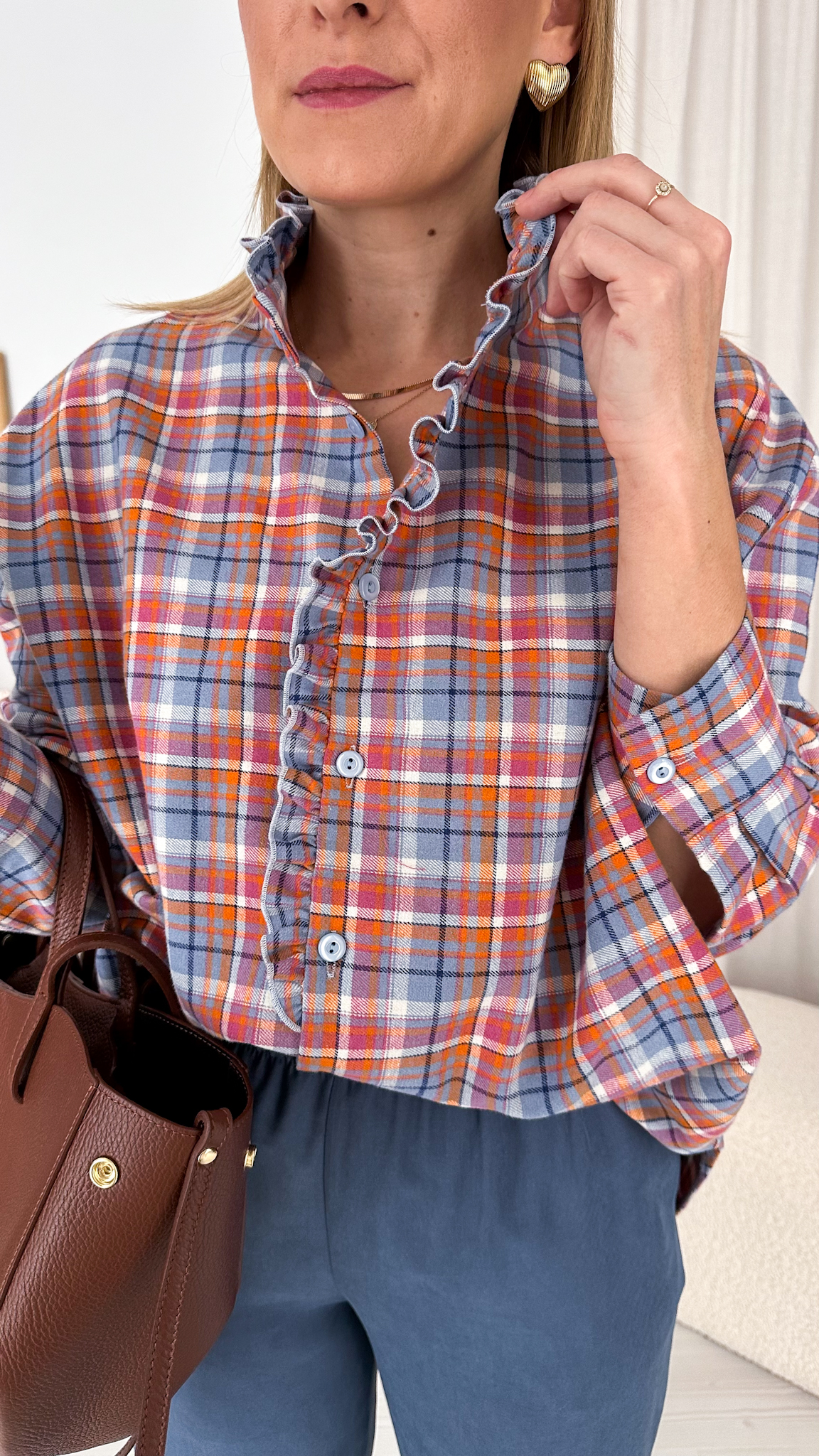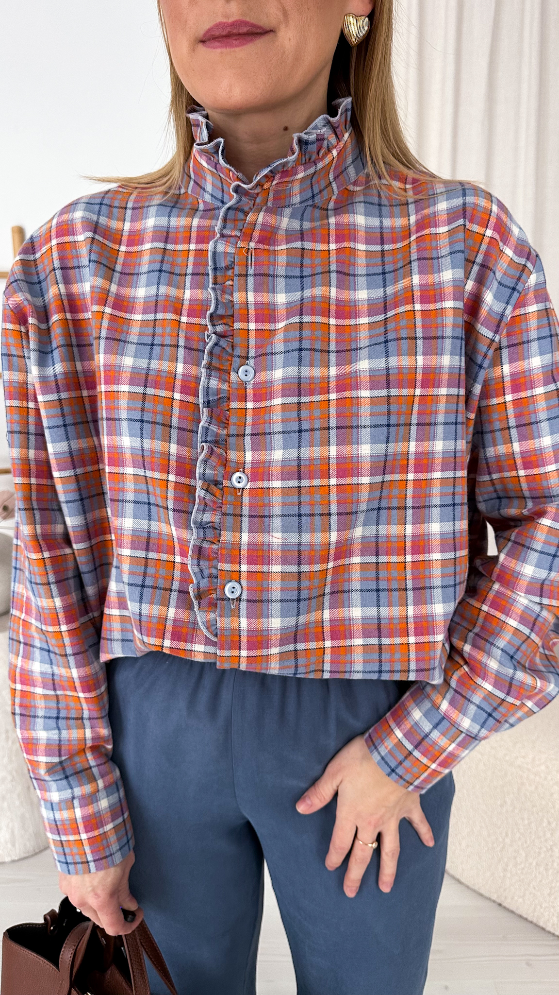 Model wyróżnia się modną stójką oraz subtelną falbanką wzdłuż linii guzików, która dodaje całości romantycznego charakteru i sprawia, że koszula pięknie prezentuje się zarówno w stylizacjach codziennych, jak i bardziej eleganckich. Klasyczna krata została przełamana delikatnymi detalami, tworząc ponadczasowy, a jednocześnie bardzo kobiecy fason.