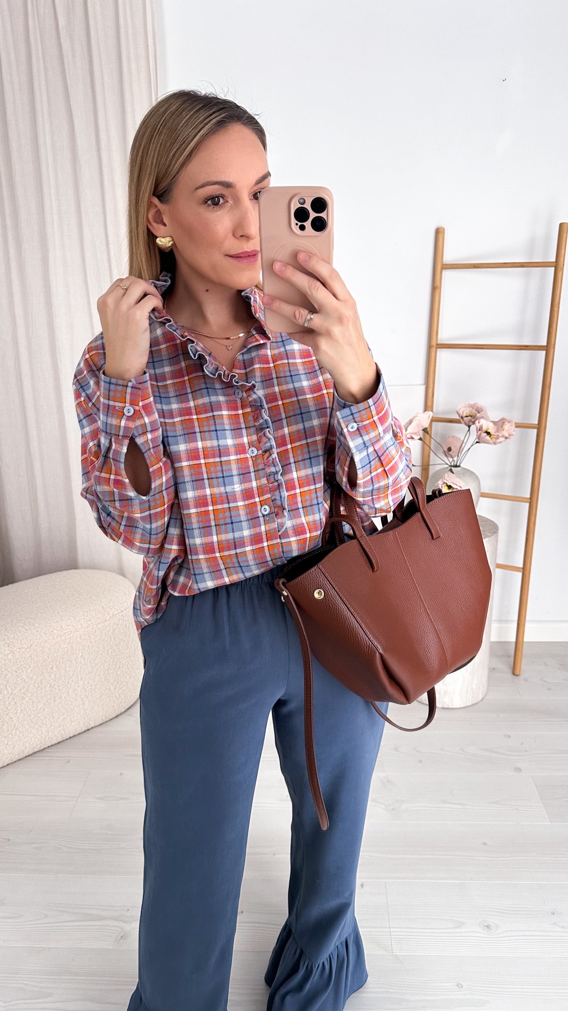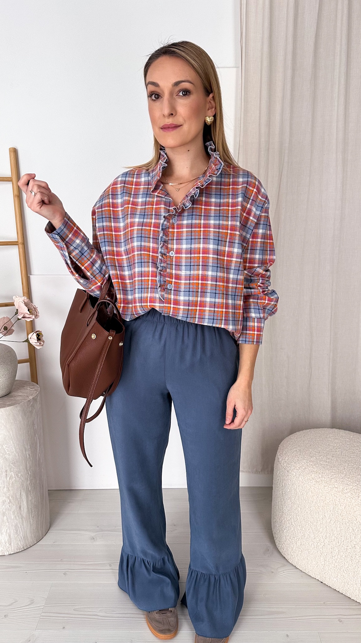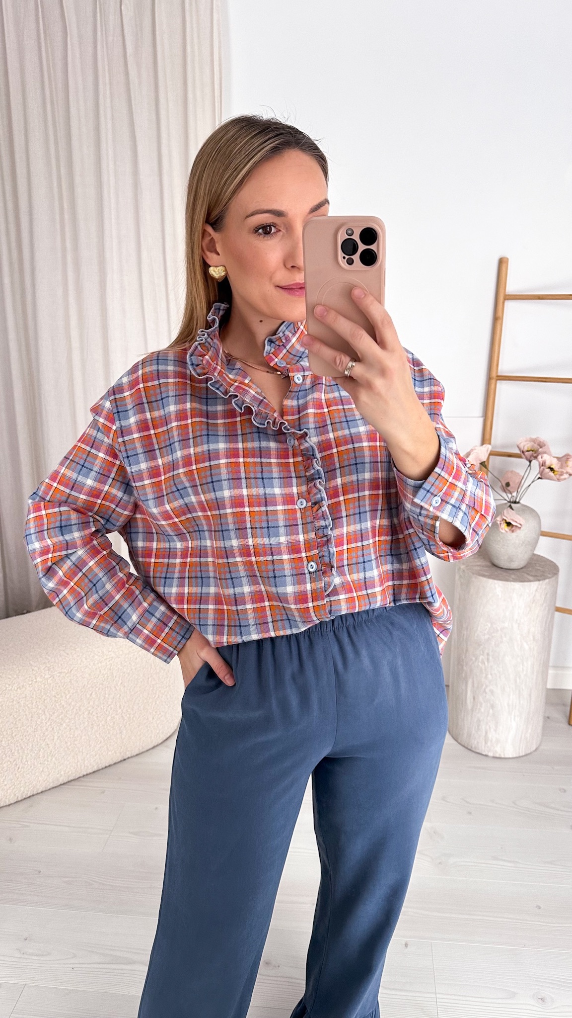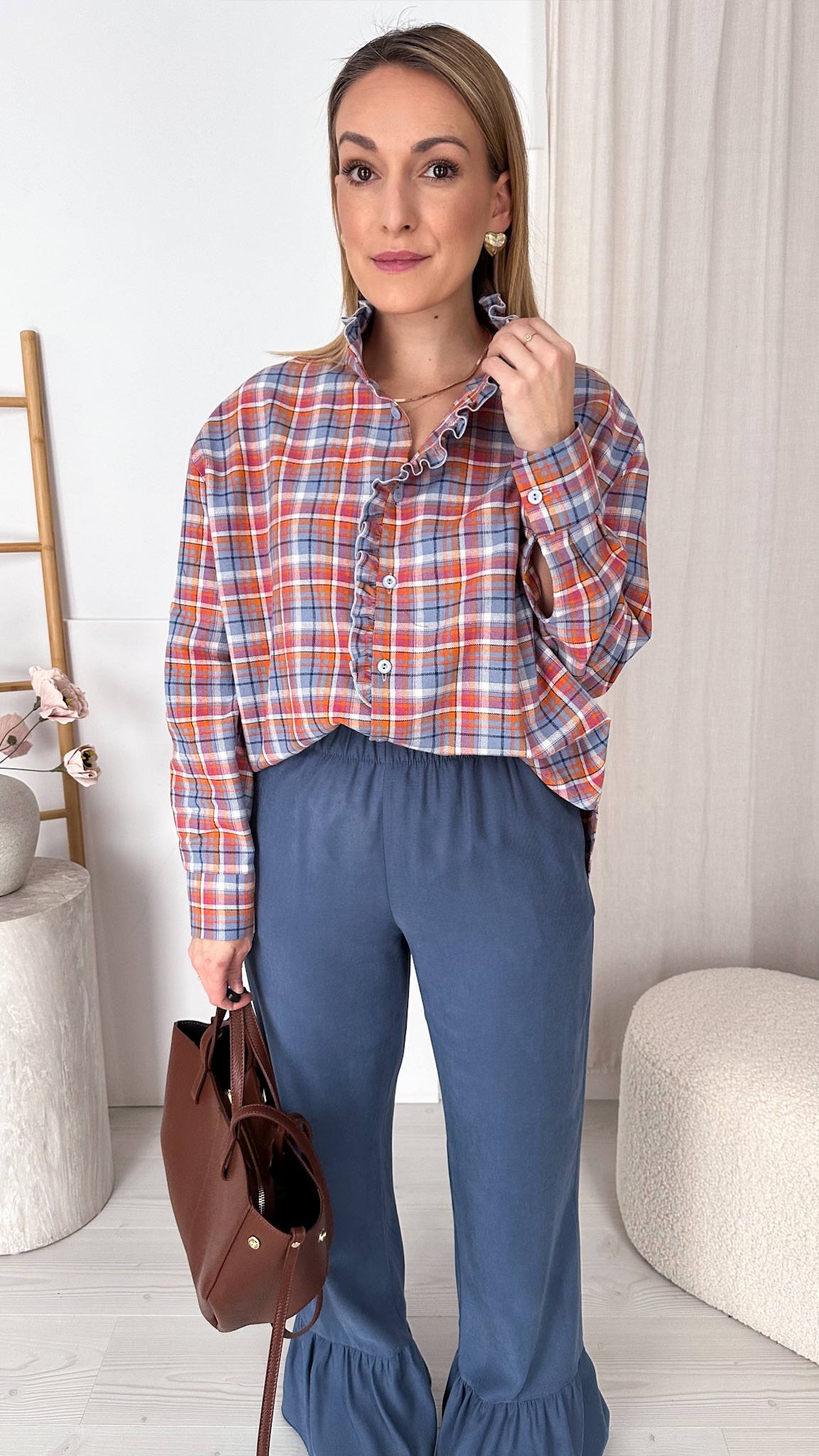Model wyróżnia się modną stójką oraz subtelną falbanką wzdłuż linii guzików, która dodaje całości romantycznego charakteru i sprawia, że koszula pięknie prezentuje się zarówno w stylizacjach codziennych, jak i bardziej eleganckich. Klasyczna krata została przełamana delikatnymi detalami, tworząc ponadczasowy, a jednocześnie bardzo kobiecy fason.