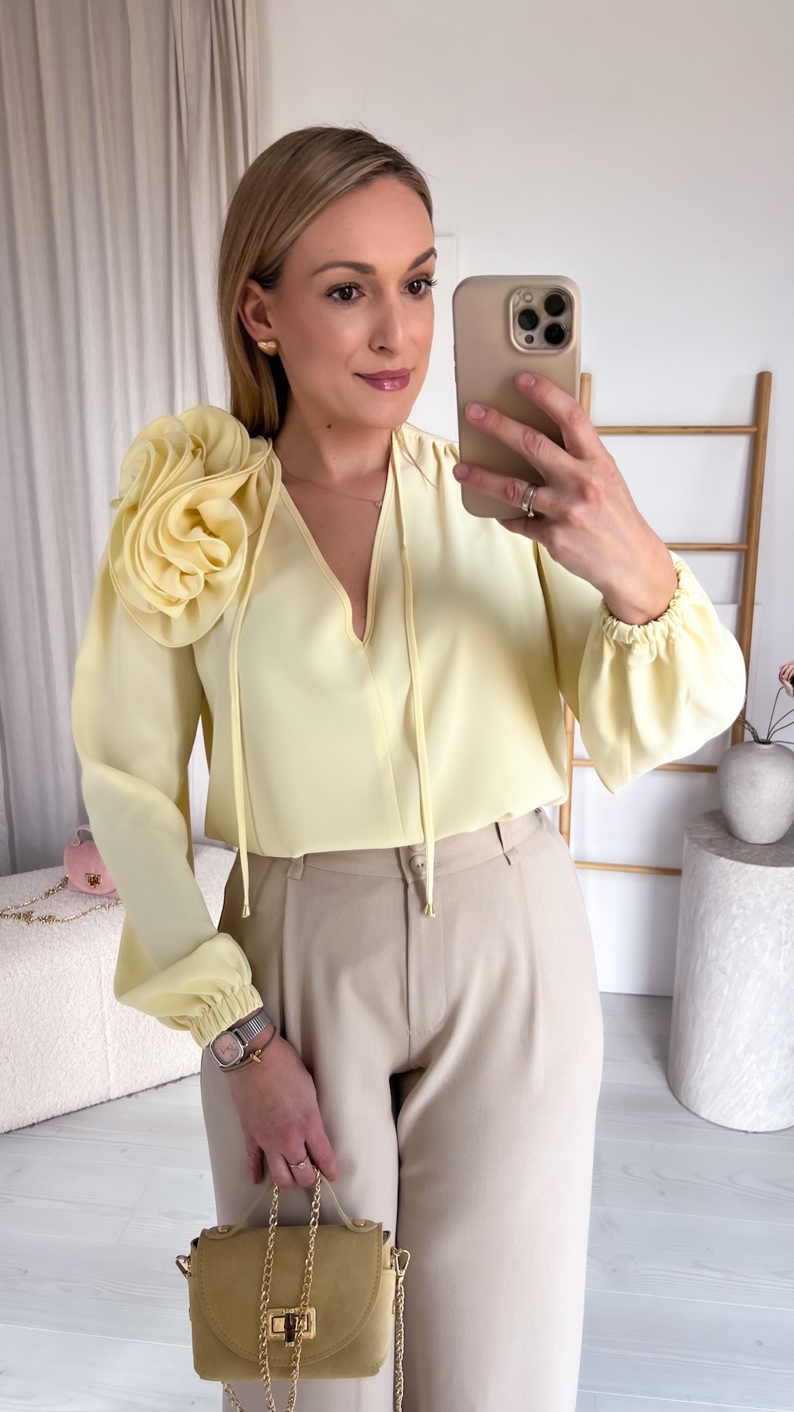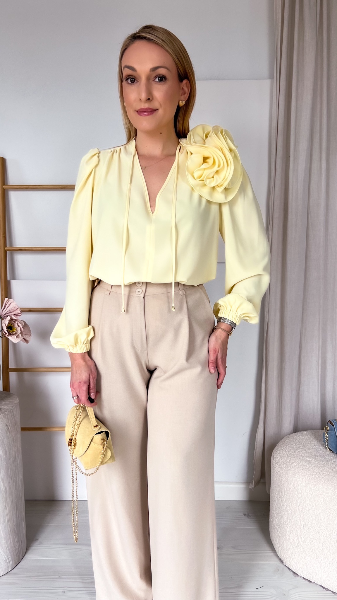 Wyjątkowa bluzka, która zachwyca elegancją i niepowtarzalnym detalem. Model ozdobiony jest efektownym, dużym kwiatem 3D na ramieniu, który nadaje całości niezwykle szykownego i kobiecego charakteru. To subtelny, a jednocześnie bardzo wyrazisty akcent, dzięki któremu stylizacja staje się wyjątkowa.