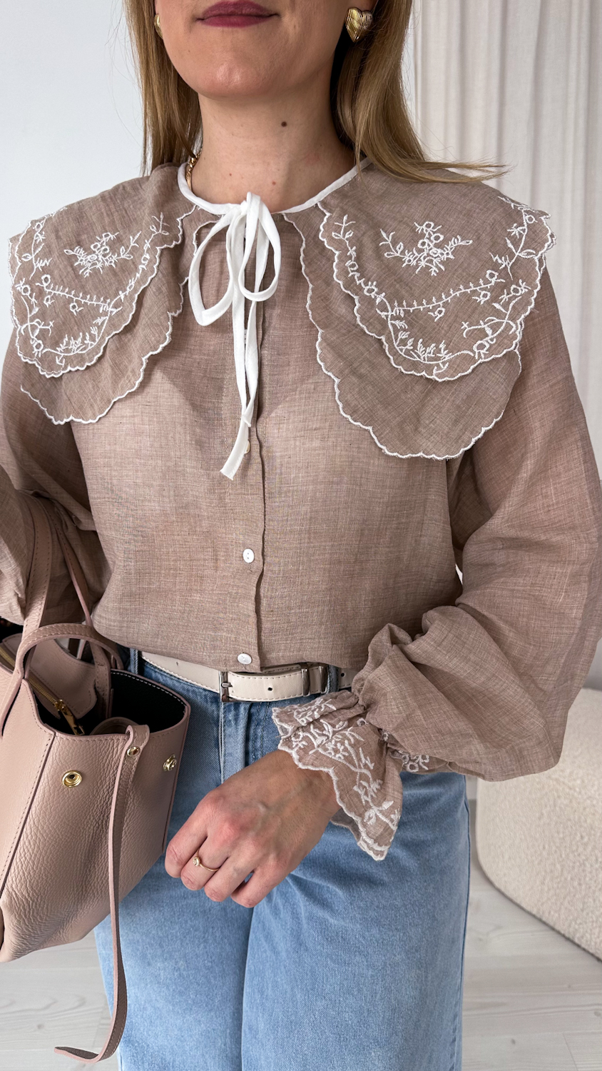 Delikatnie transparentna koszula z dużym kołnierzem to propozycja dla kobiet, które kochają subtelną elegancję i wyjątkowy styl. Model zdobią haftowane kwiaty, które nadają całości lekkości i bardzo kobiecego charakteru.
