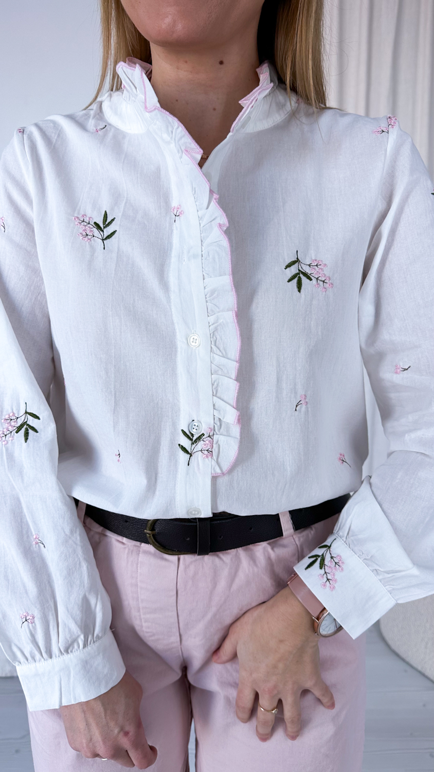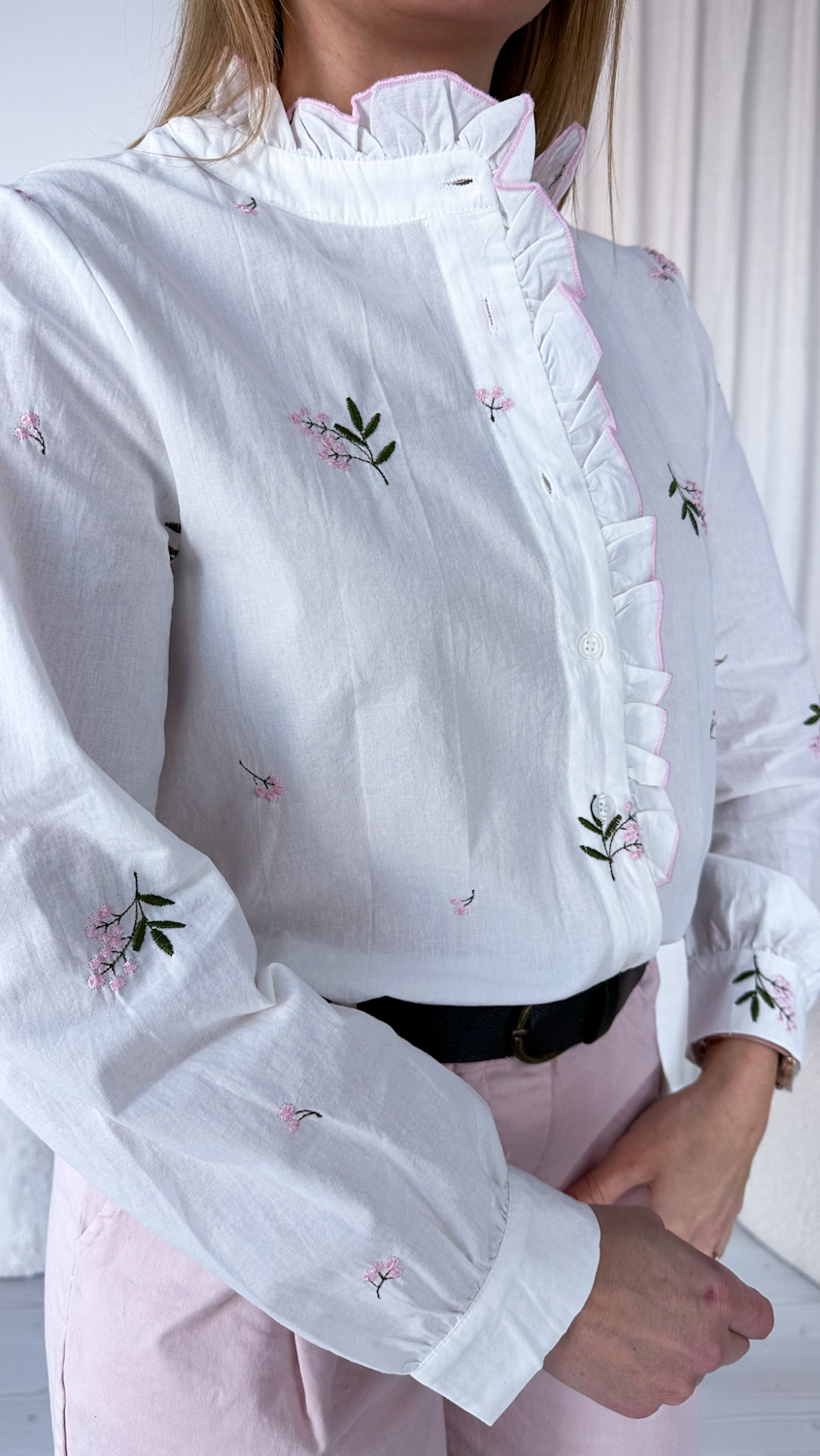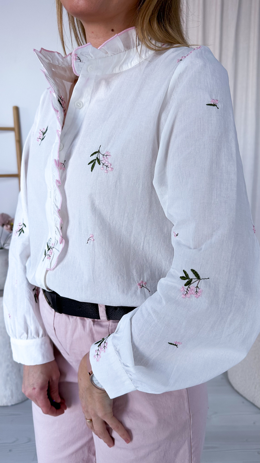 Delikatna koszula z haftowanymi kwiatuszkami, która zachwyca subtelnym, kobiecym charakterem. Model ze stójkąnadaje całości elegancji i nowoczesnej formy, pięknie podkreślając linię szyi.